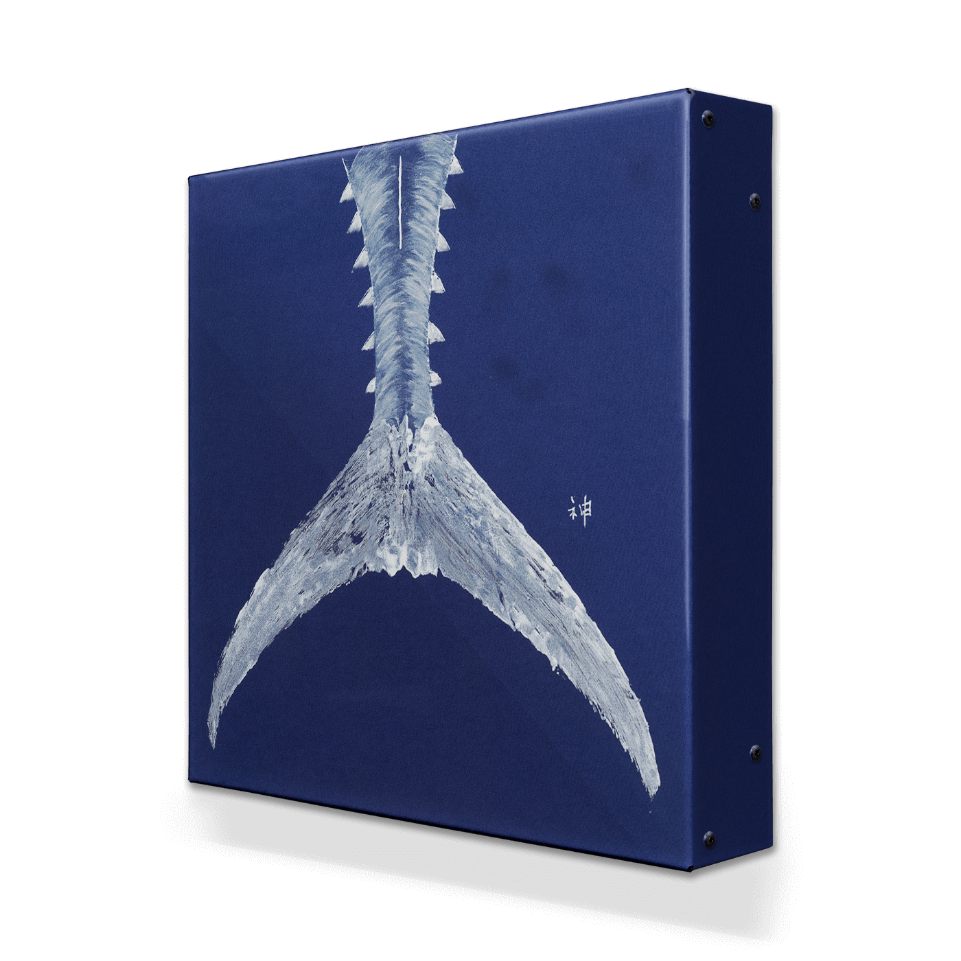 Capture the power and precision of one of the ocean’s most iconic fish with this bold depiction of a tuna tail rendered in a traditional gyotaku style. Set against a deep blue background, the clean silhouette and subtle textural detail evoke the authenticity of Japanese fish-printing techniques while maintaining a modern, refined look well suited for coastal homes, fishing lodges, beach houses, and ocean-inspired interiors.