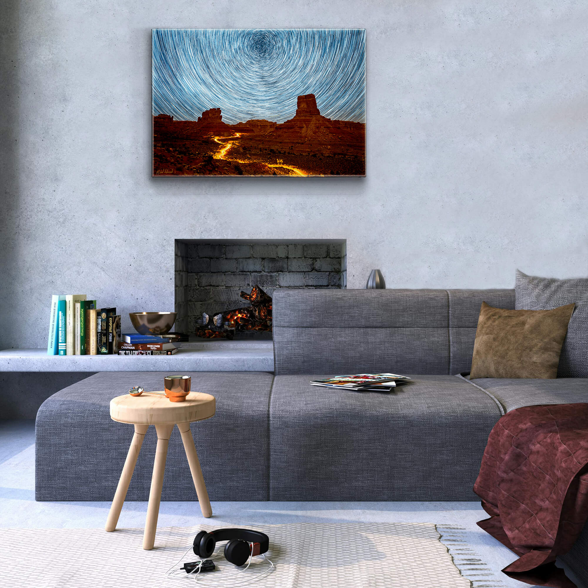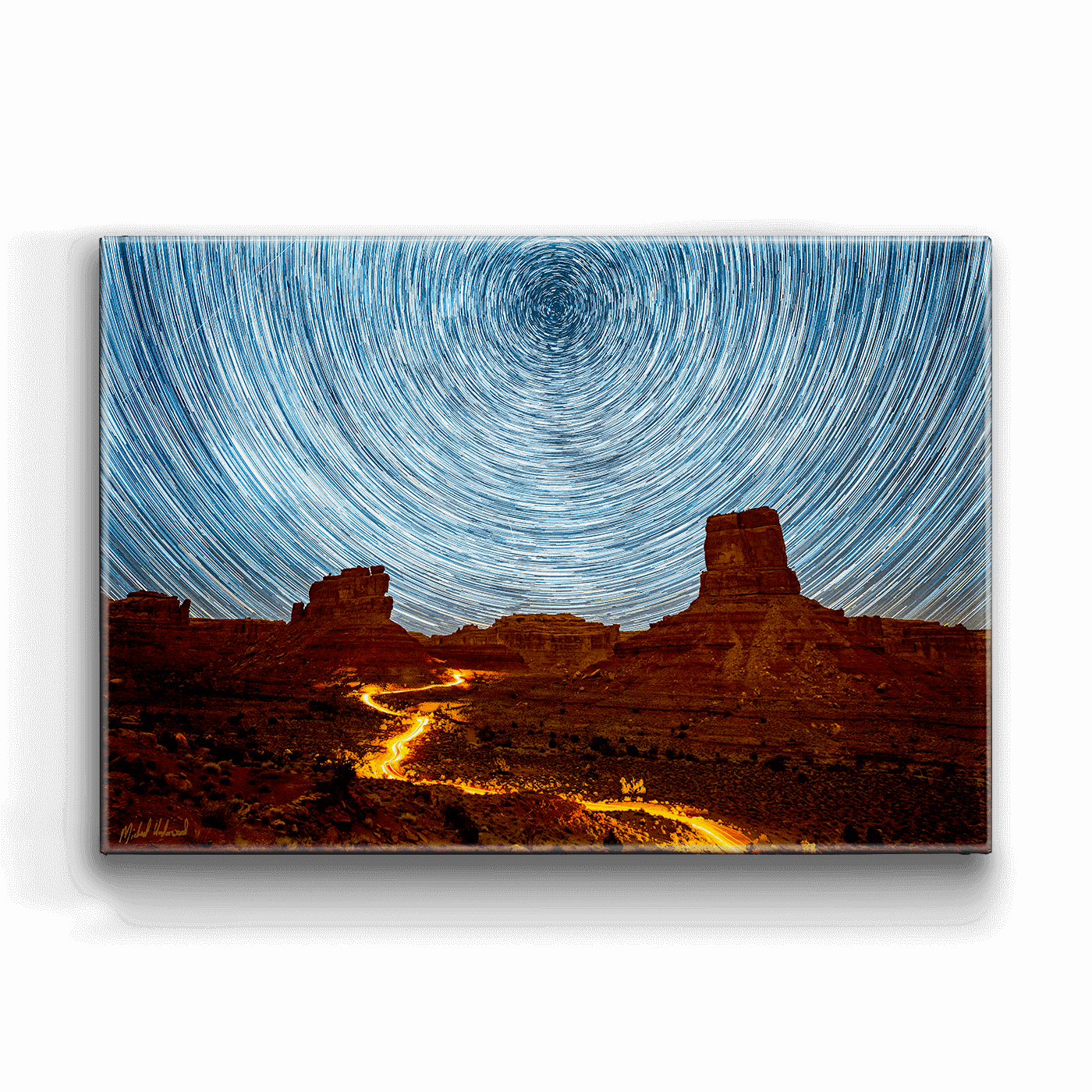 Under the cosmic swirl of star trails, a winding path illuminates the contours of monumental rock formations in a desert landscape. This night spectacle, where time seems to spiral into infinity above, and human presence is traced by a ribbon of light below, showcases the grandeur of the universe contrasted with the earth's ancient stillness. It's a powerful display of the eternal dance between the earth and the stars.