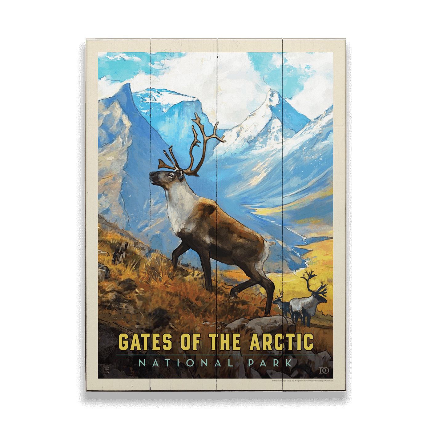 Experience the wild majesty of the far north with this dramatic artwork of Gates of the Arctic National Park. A powerful caribou strides across a rugged tundra slope, framed by snow-capped peaks and a vast, untouched wilderness. Located entirely above the Arctic Circle, this remote park is one of the last truly wild places on Earth—lacking roads, trails, or infrastructure. It’s a land shaped by ancient glaciers and sustained by the rhythms of nature, where solitude and raw beauty reign. This piece captures the park’s awe-inspiring scale and the spirit of untamed adventure.
