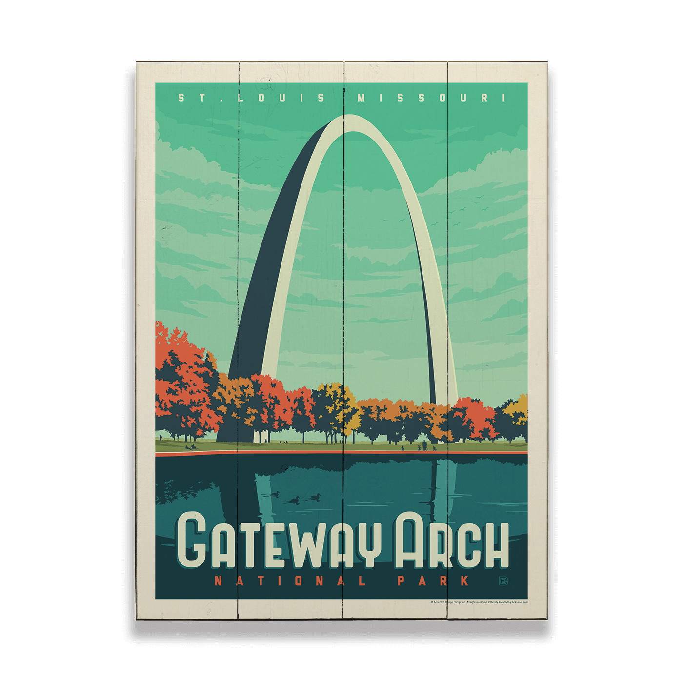Showcase the spirit of westward expansion with this bold, graphic depiction of Gateway Arch National Park. Towering above a reflecting pool lined with trees painted in crisp autumn tones, the iconic arch frames the sky in sleek, modern contrast to the natural setting below. As a tribute to America’s frontier history and innovation, the monument anchors a park that blends urban energy with reflective green space. This piece captures the enduring legacy and architectural brilliance of one of the most recognizable landmarks in the country.