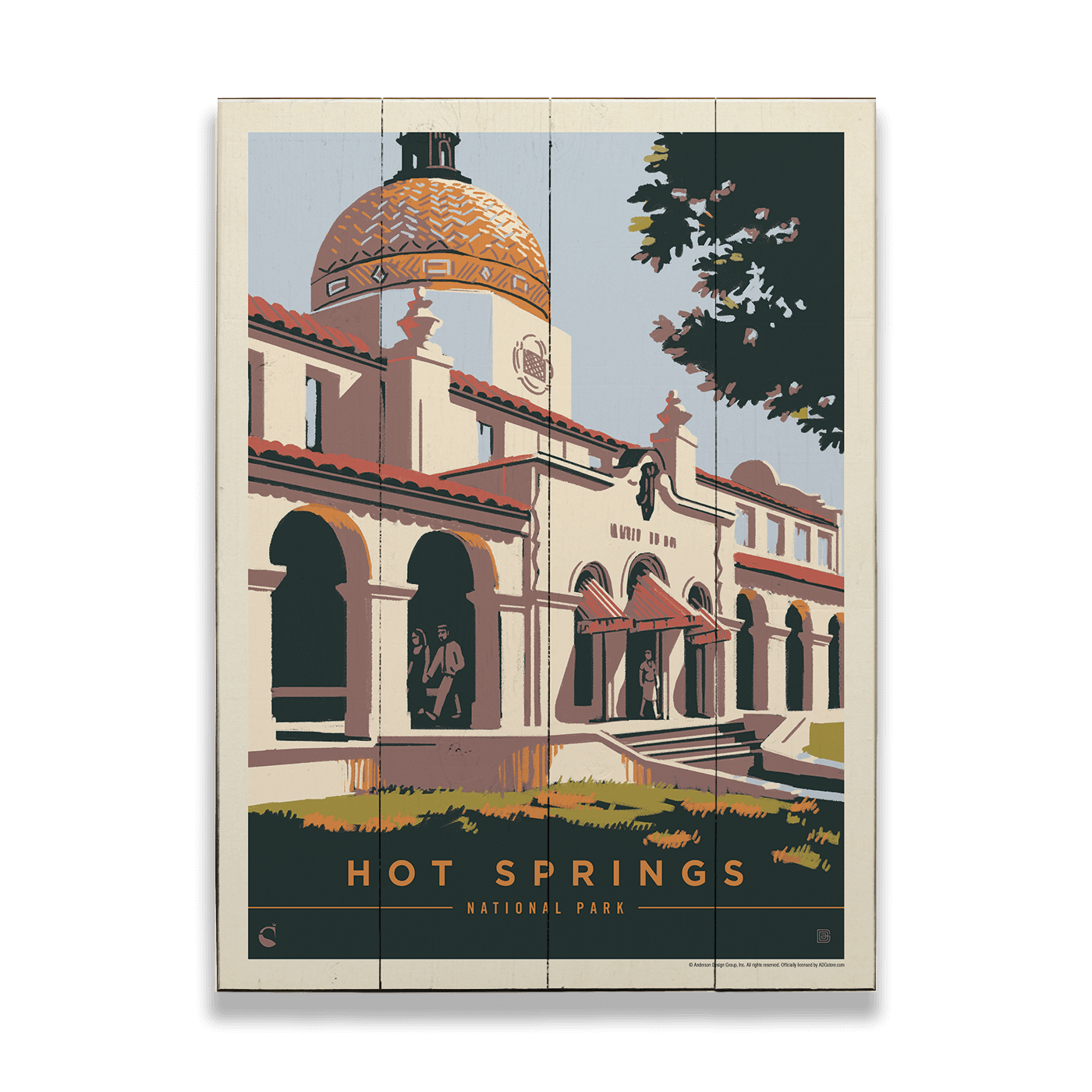 Celebrate the elegance and history of America’s oldest national park with this striking illustration of the grand Quapaw bathhouse at Hot Springs National Park. With its signature domed roof, graceful arches, and terracotta accents, the building captures the charm of a bygone era when thermal waters drew visitors in search of rest and rejuvenation. The soft pastel tones and vintage architecture reflect the park’s unique blend of nature, wellness, and heritage, making this artwork a timeless tribute to a storied destination.
