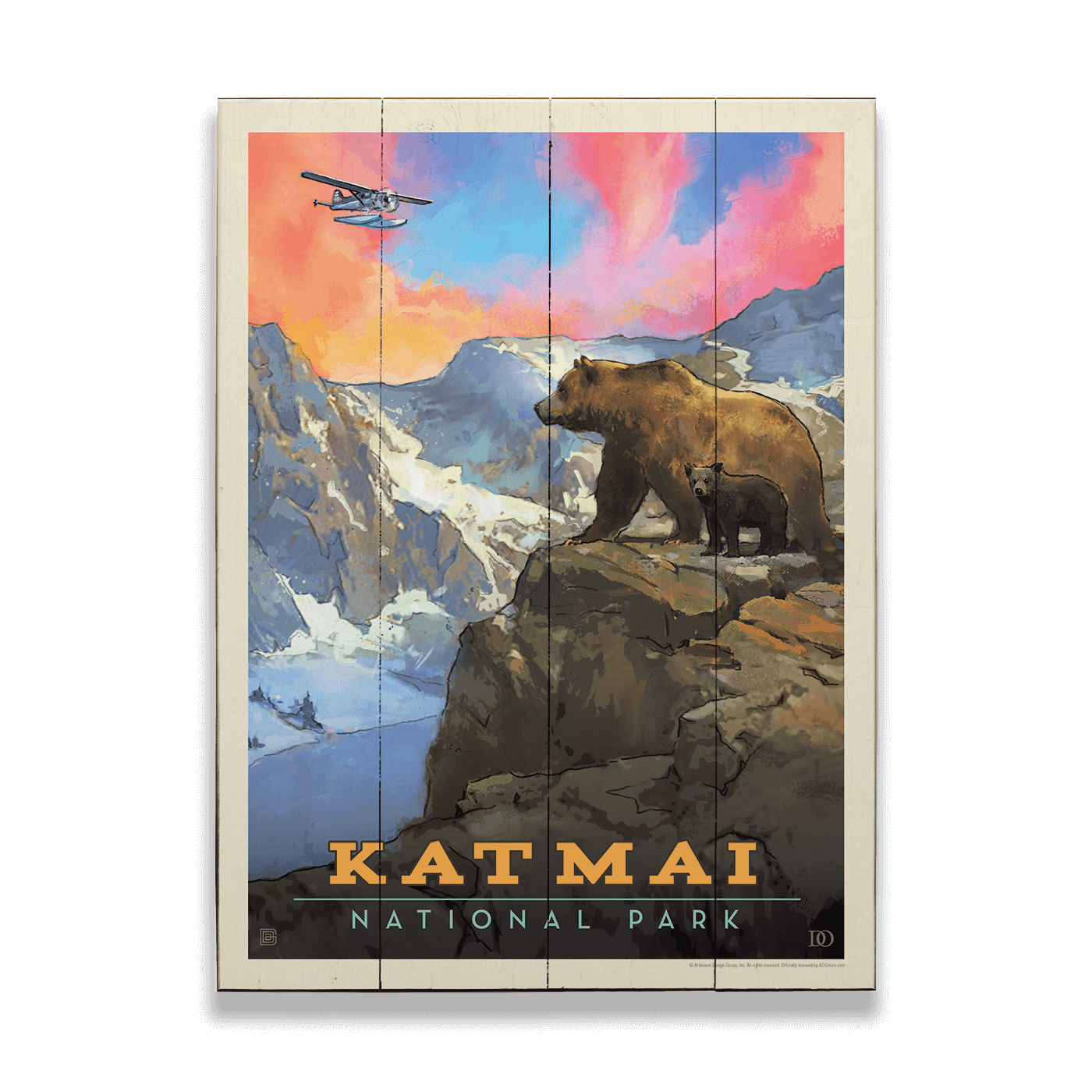 Discover the raw, untamed splendor of Katmai National Park, where snow-covered peaks, deep valleys, and volcanic terrain stretch across more than four million acres of remote Alaskan wilderness. This striking artwork captures a mother bear and her cub surveying the land from a rugged outcrop as a floatplane soars overhead. Best known for its iconic brown bears, Katmai also preserves the Valley of Ten Thousand Smokes, a dramatic volcanic landscape formed by the 1912 eruption of Novarupta. A powerful tribute to the park’s wildlife, scale, and seclusion, this piece evokes a sense of awe and reverence for one of America’s most wild and wondrous places.
