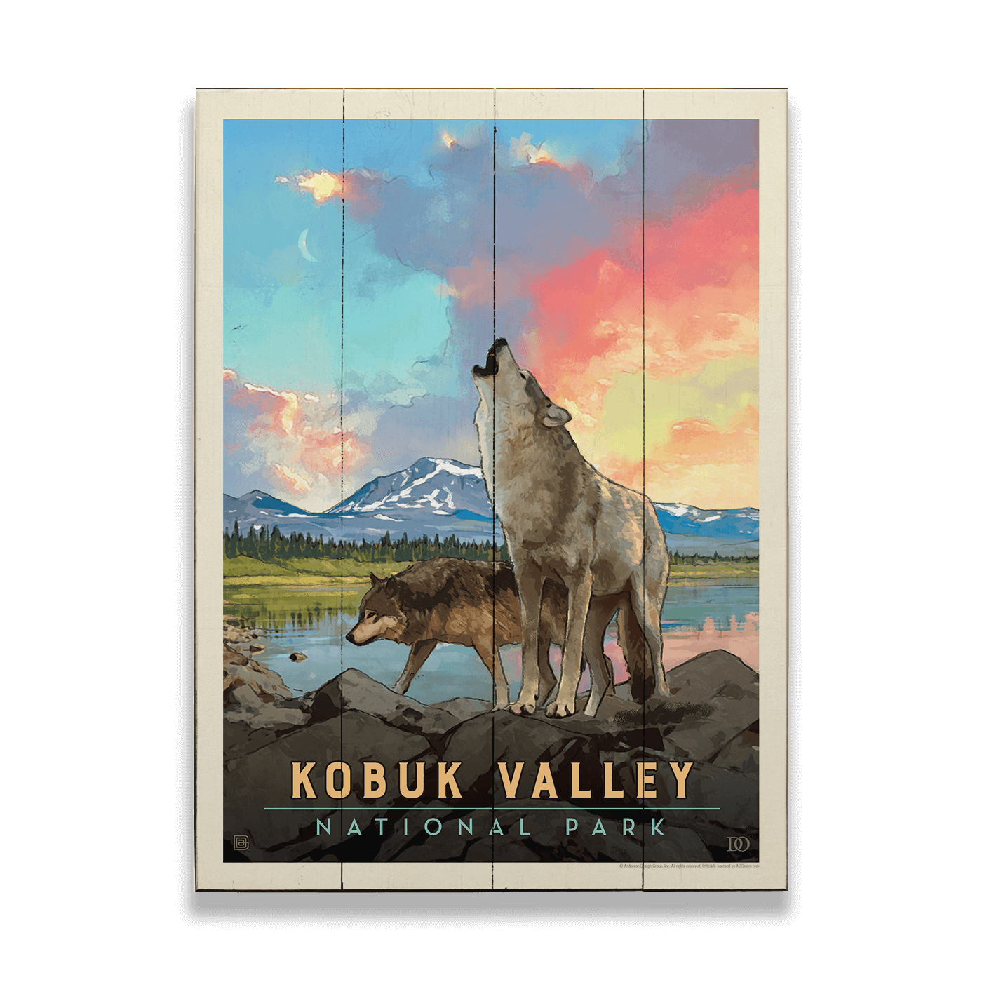 Honor the raw wilderness of Alaska’s Arctic with this striking depiction of Kobuk Valley National Park. Set against a dramatic pastel sky, two wolves stand watch over a reflective riverbank. Surrounded by the Brooks Range and home to the Great Kobuk Sand Dunes, this remote, roadless park offers a rare landscape of contrasts: rolling forests, vast rivers, and sweeping sands sculpted by the wind. This artwork captures that untamed spirit, perfect for anyone drawn to the solitude and grandeur of Alaska’s far north.