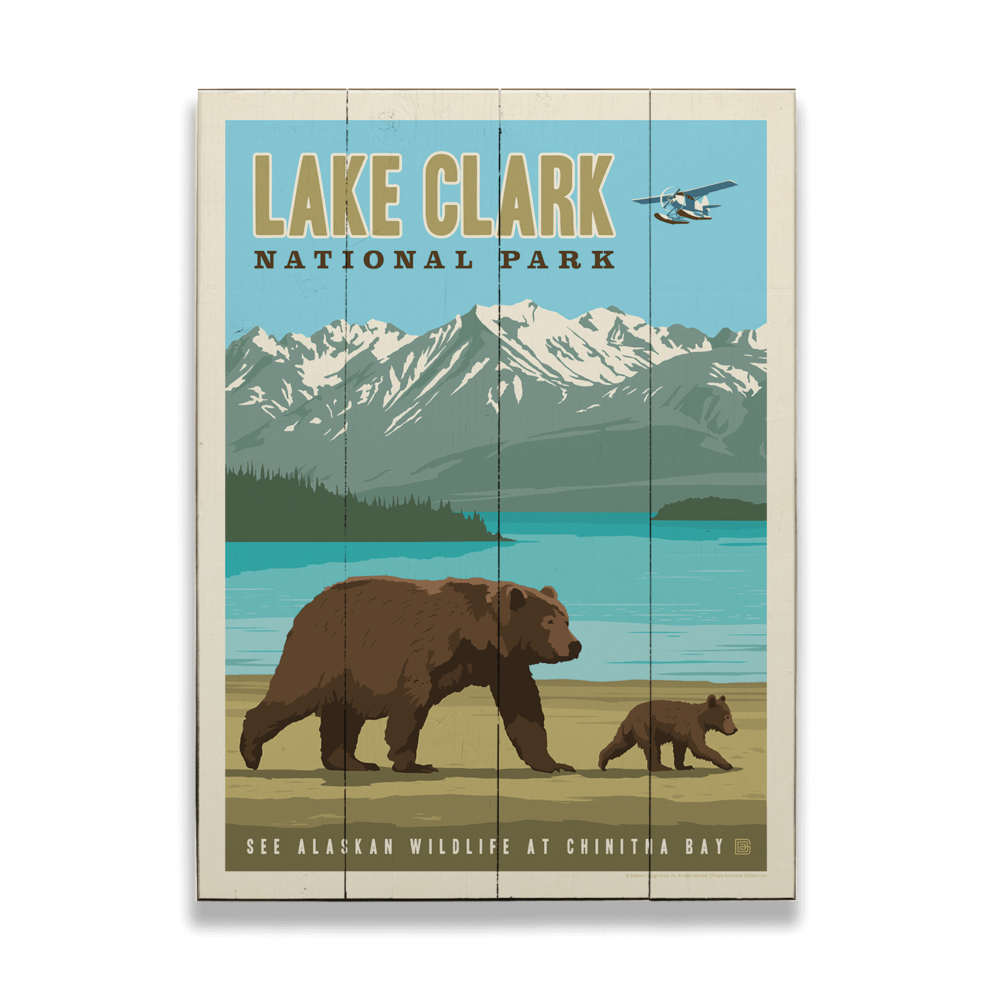 This bold and inviting artwork highlights the raw beauty of Lake Clark National Park, where a mother bear and her cub amble across the shores of Chinitna Bay. Towering mountains and icy blue waters create a striking Alaskan backdrop, while a bush plane overhead hints at the park’s remote and wild accessibility. Known for its incredible bear viewing opportunities, Lake Clark offers a unique blend of coastal, alpine, and volcanic ecosystems. A favorite for photographers, nature lovers, and adventure seekers alike, this piece celebrates one of Alaska’s most awe-inspiring destinations.