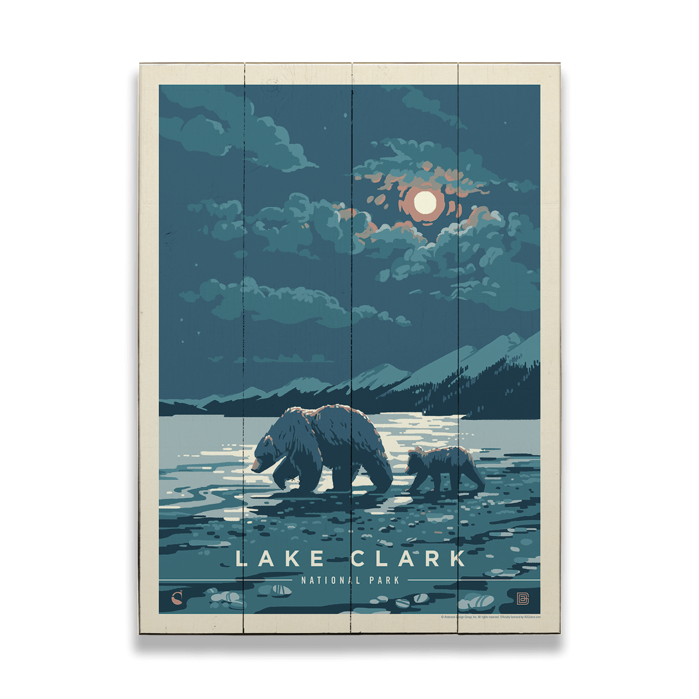 Bathed in the glow of a full moon, this serene illustration of Lake Clark National Park captures a quiet moment as a mother bear and her cub explore the reflective shoreline. Located in southwest Alaska, the park is known for its dramatic landscapes—ranging from active volcanoes and turquoise lakes to vast tundra and glacier-fed rivers. It’s also a premier destination for observing brown bears in their natural habitat, especially along the Cook Inlet coast. This artwork beautifully celebrates the park’s untamed wilderness, making it a perfect piece for wildlife lovers, adventurers, and those drawn to Alaska’s raw, rugged beauty.