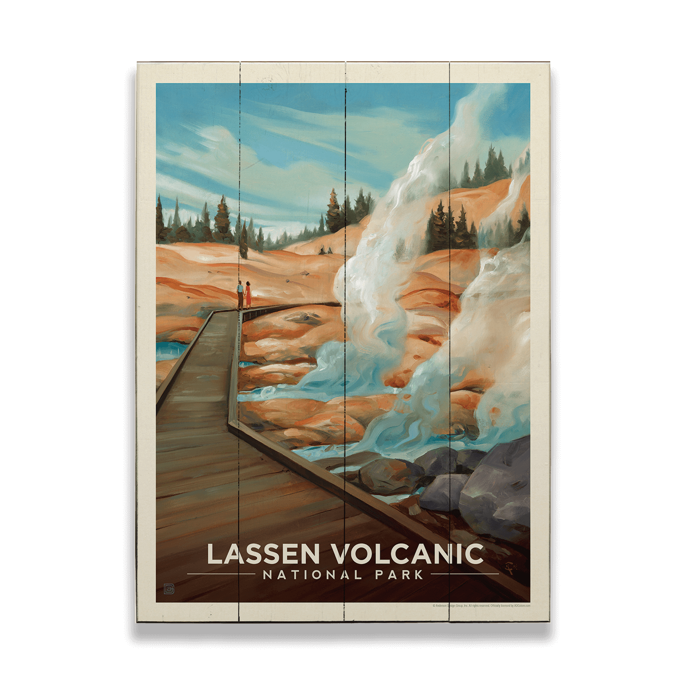 This captivating artwork brings the otherworldly energy of Lassen Volcanic National Park to life. Billowing steam rises from a geothermal vent, while visitors traverse a winding boardwalk through a surreal landscape of bubbling pools, vivid earth tones, and alpine forest. Home to all four types of volcanoes, this California park showcases the dynamic power of our planet with hydrothermal areas like Bumpass Hell and Sulphur Works. A paradise for hikers, geology buffs, and lovers of the extraordinary, this piece captures the intrigue and intensity of a place where the Earth is constantly in motion.