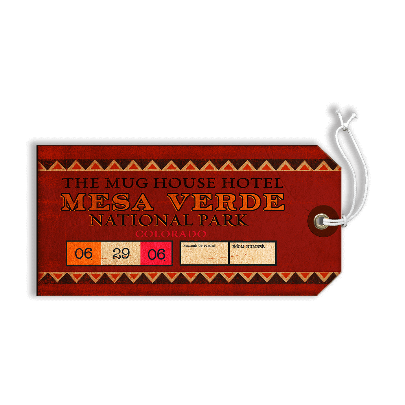 This unique artwork features a vintage-style luggage tag design that pays homage to the rich history of Mesa Verde National Park. Highlighting the fictional "Mug House Hotel," this piece draws inspiration from the actual Mug House, a massive multi-room archaeological site within the park. The design captures the essence of exploration and cultural heritage, making it a perfect addition to any travel enthusiast’s collection. With its warm, earthy tones and bold typography, this artwork evokes the timeless beauty of Mesa Verde and the spirit of adventure.