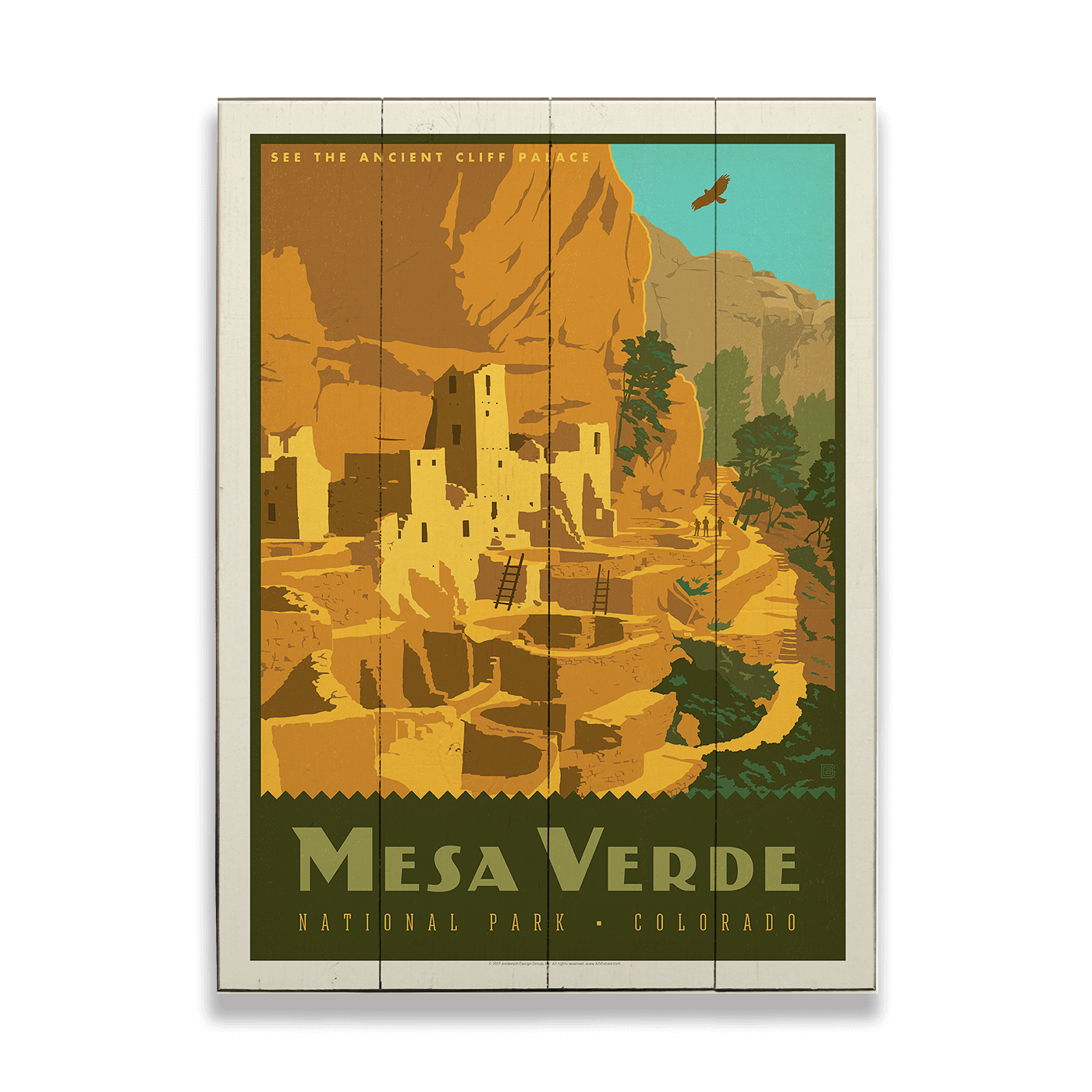 Embark on a journey through time with this exquisite Mesa Verde National Park artwork, a celebration of ancient history and natural beauty. The artwork showcases the majestic Cliff Palace, nestled within the Colorado peaks, inviting viewers to explore the wonder of this prehistoric site. The warm, earthy tones and the soaring bird in the sky capture the essence of the Southwest's rugged landscape. Perfect for history buffs and outdoor enthusiasts alike, this print is a window to the Ancestral Puebloan culture that once flourished in these cliff dwellings. Bring the mystery and allure of Mesa Verde into your home or office with this beautiful tribute to one of America's most fascinating national parks.