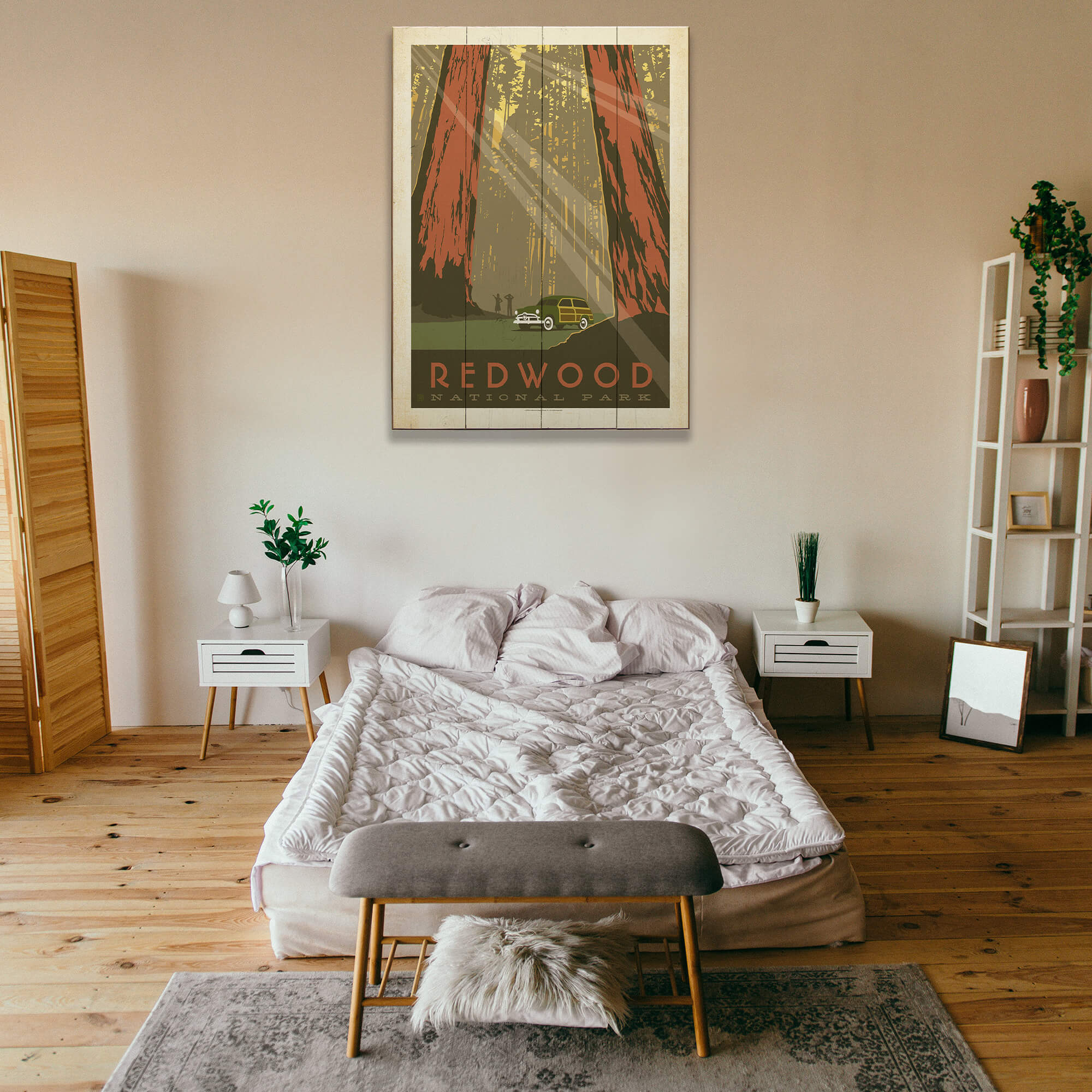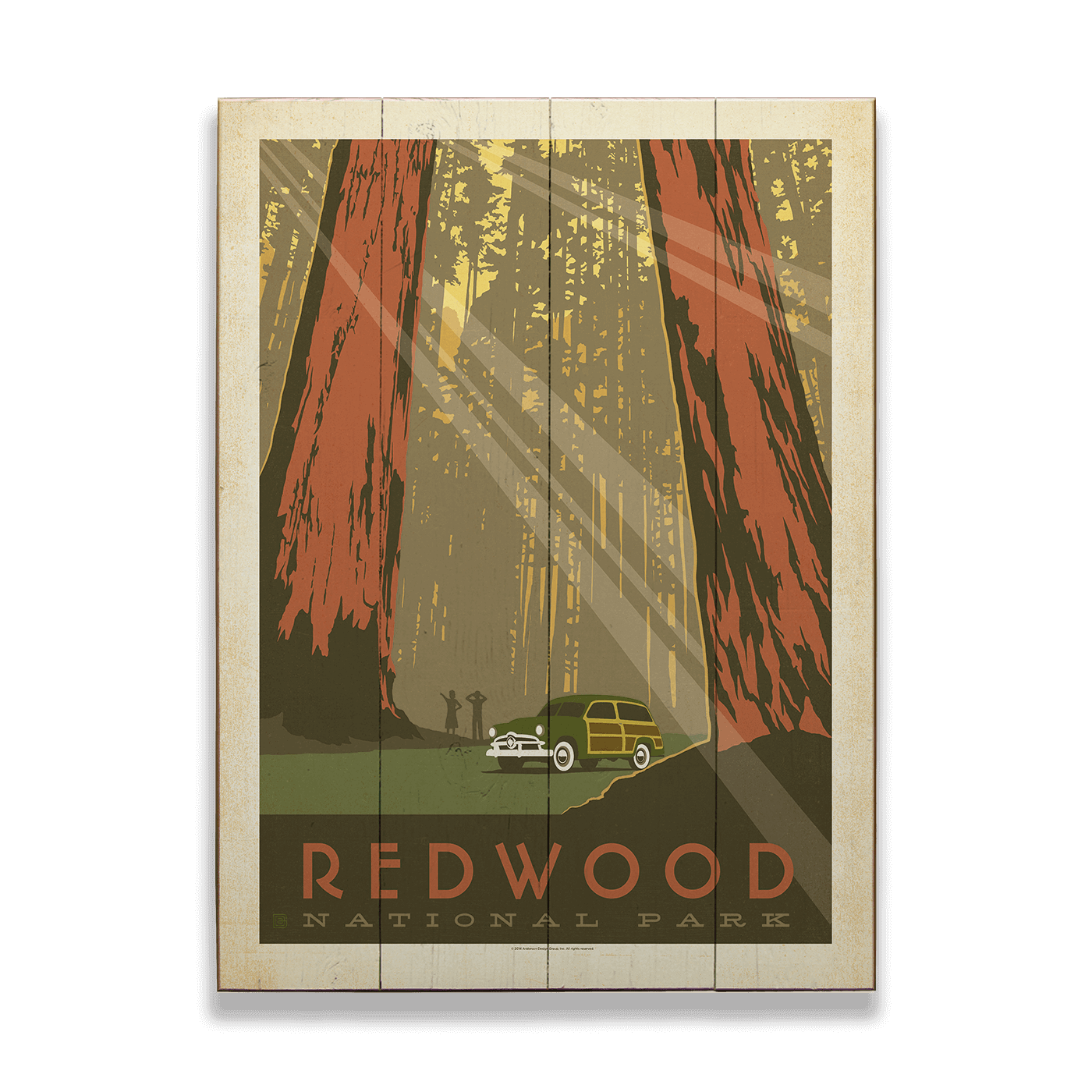 Step into the serene majesty of Redwood National Park, captured in this stunning artwork that celebrates the towering grandeur of nature. The vintage style of the piece evokes a timeless sense of adventure and exploration, inviting viewers to wander amidst the ancient redwoods. Bathed in the golden hues of sunlight filtering through the forest canopy, the design captures the essence of this cherished American landscape.