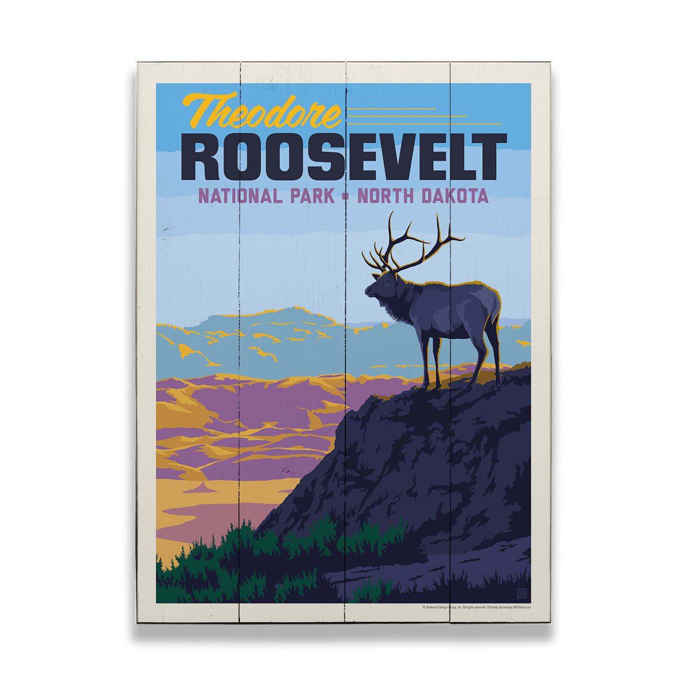 Celebrate the untamed spirit of the Badlands with this striking artwork of Theodore Roosevelt National Park in North Dakota. Showcasing a shadowed majestic elk standing proudly atop a rocky bluff, the background scenery is awash in warm sunset hues that highlight the park’s rugged terrain and expansive skies. Known for its breathtaking overlooks and abundant wildlife, the park offers a window into the wild frontier that inspired Theodore Roosevelt’s deep commitment to conservation. This piece captures both the beauty and solitude of one of America’s most unique national parks—a perfect addition for nature lovers and outdoor adventurers alike.