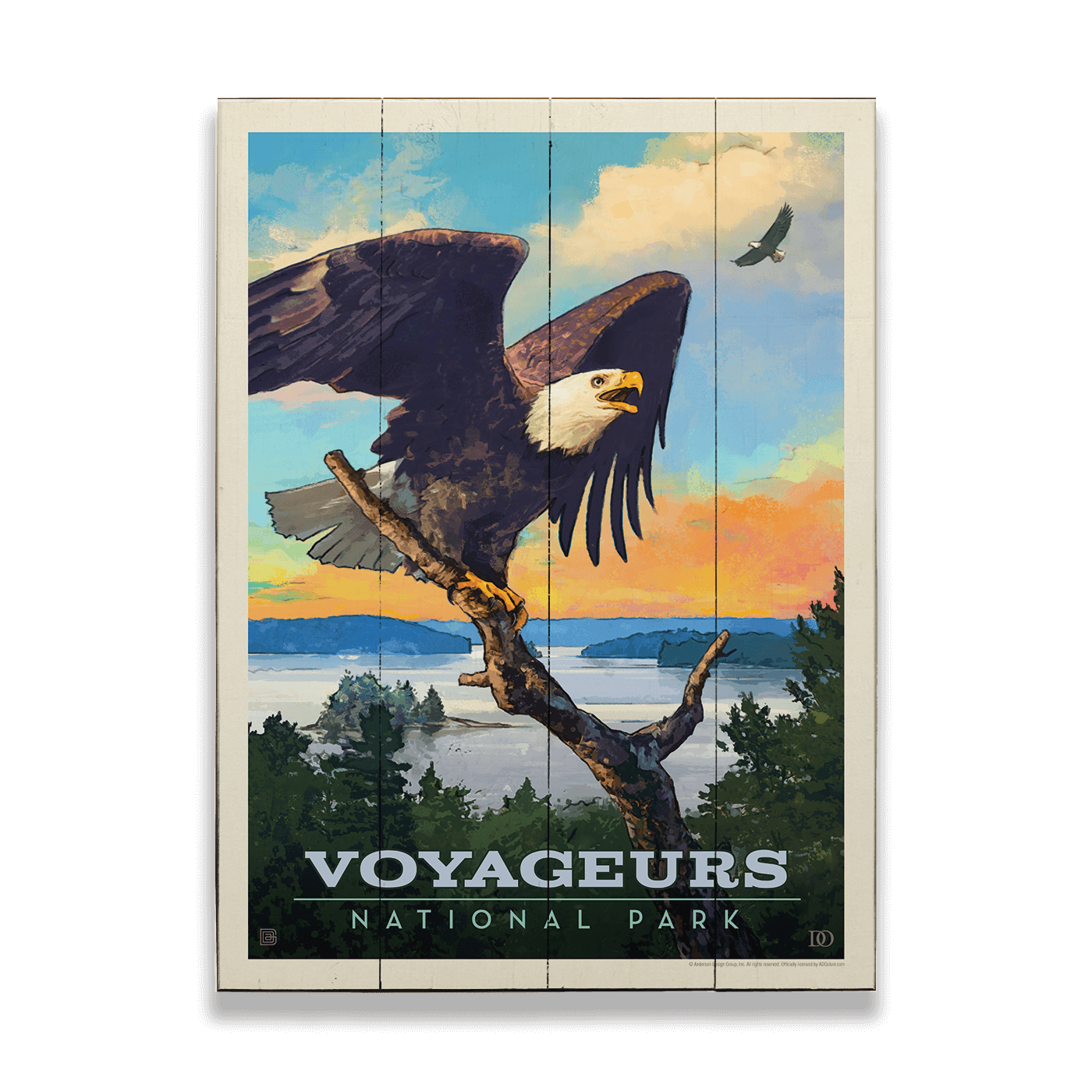 With wings spread and talons gripping a high perch, a bald eagle surveys the waterways of Voyageurs National Park—an area named for the French-Canadian fur traders who once navigated these interconnected lakes and forests by canoe. Located along the Canadian border, the park is known for its rugged terrain, boreal forests, and hundreds of miles of pristine shoreline, only accessible by water. Perfect for nature lovers, paddlers, or anyone drawn to the call of the wild, this artwork evokes the spirit of independence and natural splendor that defines this northern landscape.