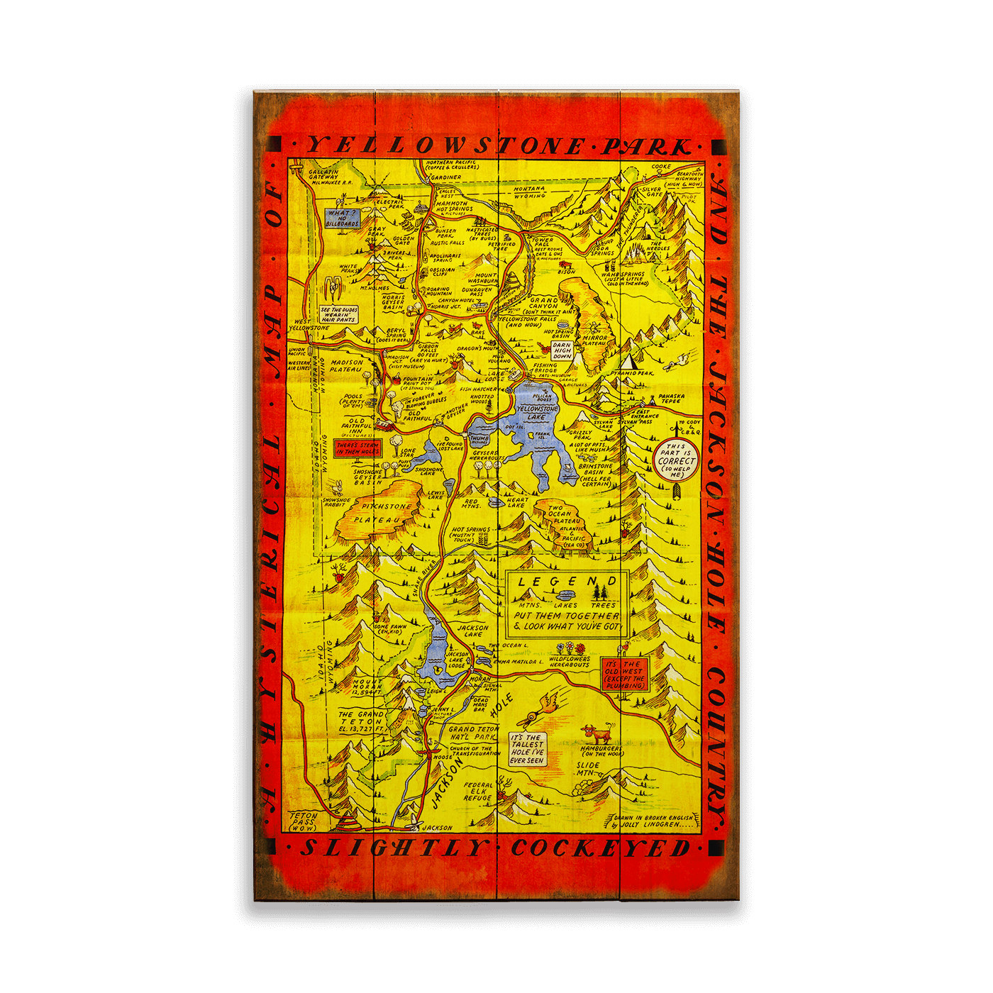 This vibrant and whimsical artwork features a "slightly cockeyed" map, offering a humorous and artistic interpretation of a Yellowstone National Park and its surrounding areas. The map's bright colors and playful design elements make it a standout piece, perfect for adding a touch of personality and nostalgia to any space. Whether you're a lover of the outdoors or simply appreciate unique, vintage-inspired decor, this piece is sure to spark conversations and bring a smile to your face.