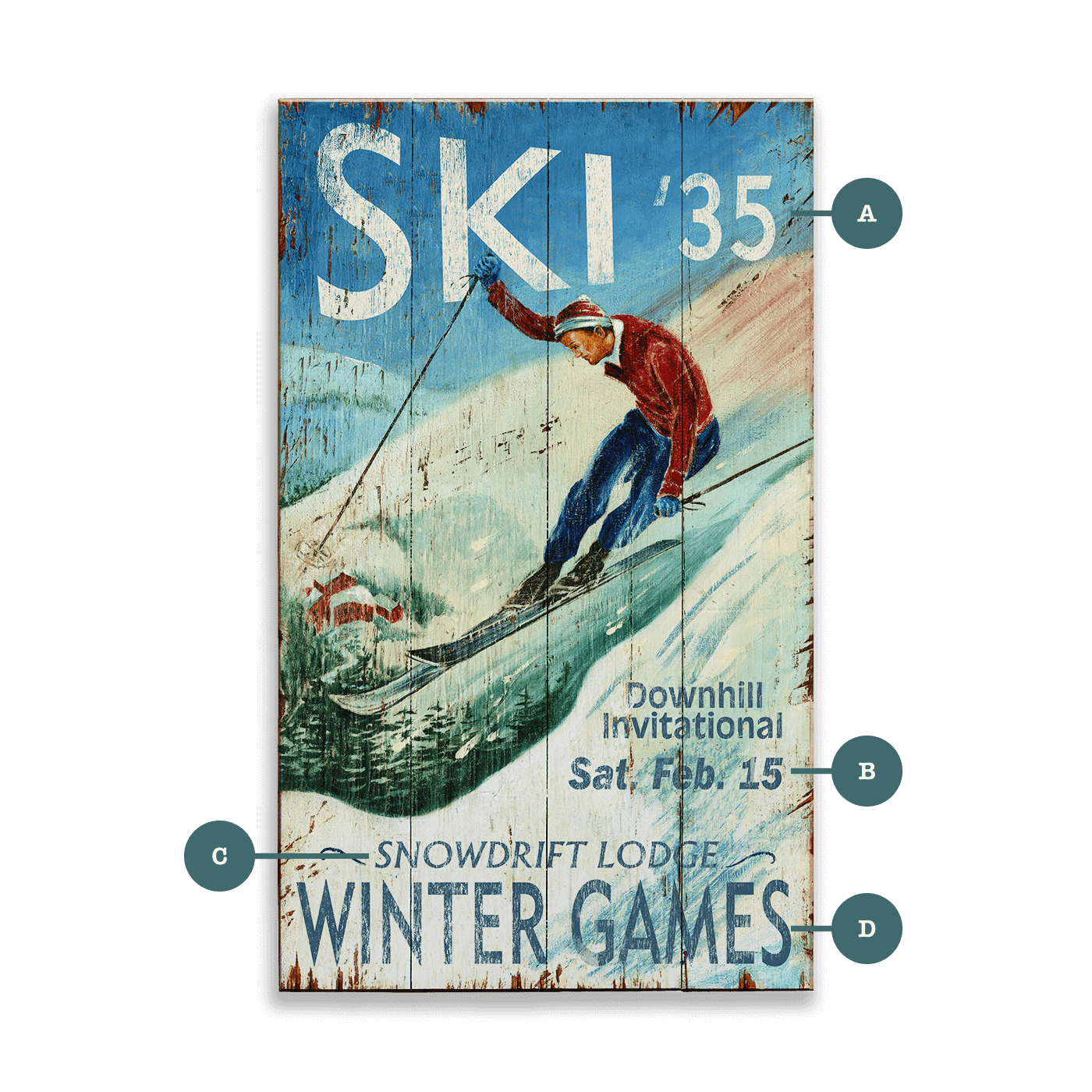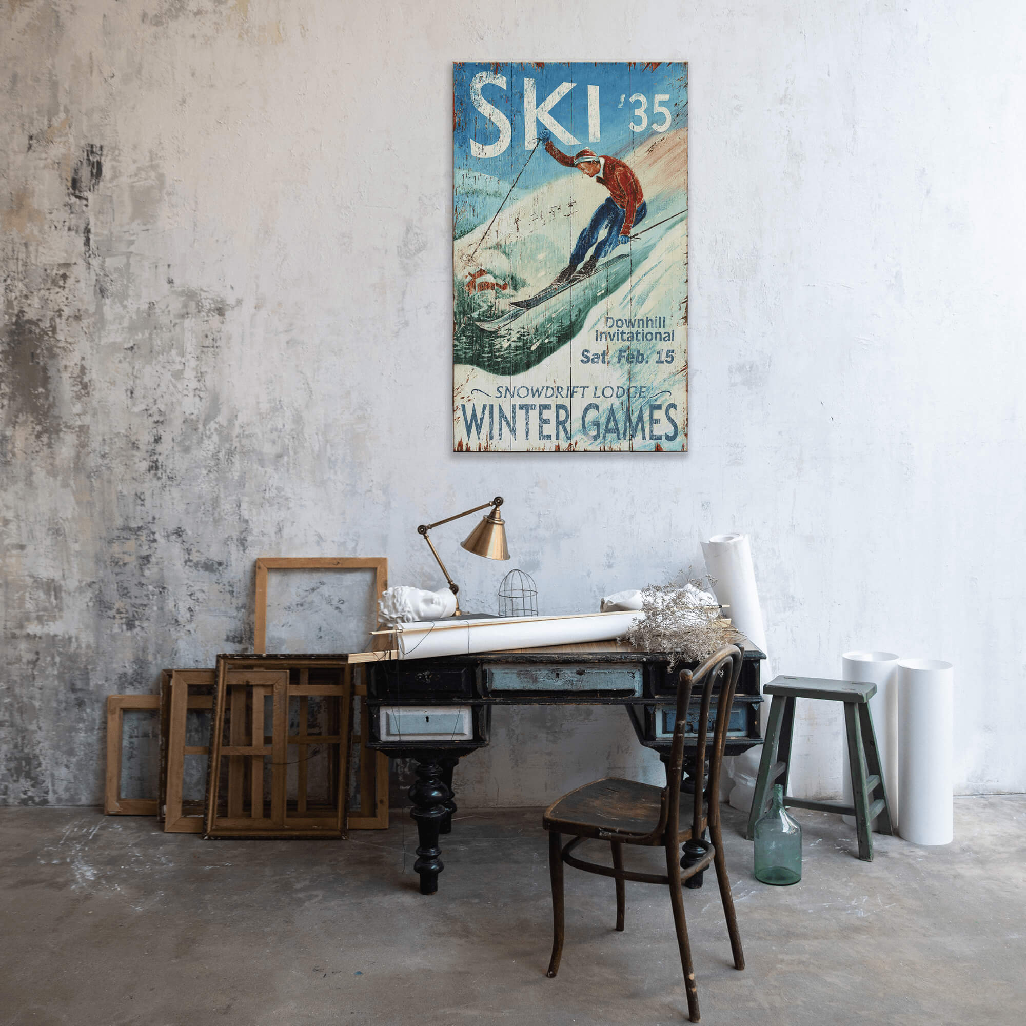 This vintage-style artwork features an exhilarating downhill skier racing through a snowy mountain course, capturing the excitement of winter sports. With a retro design and distressed finish, it brings the nostalgia of classic ski competitions to life. Perfect for cabins, lodges, or ski-themed spaces, it adds a bold and adventurous touch to rustic decor.