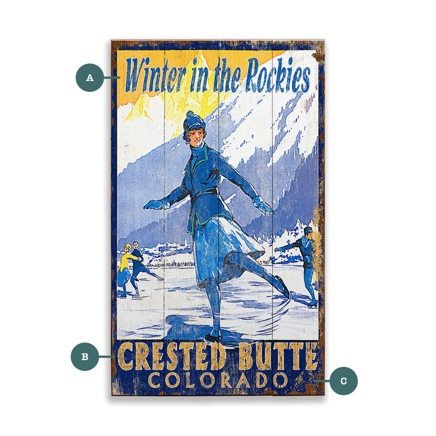 This vintage-style artwork captures a nostalgic scene of ice skaters enjoying a crisp winter day against a stunning mountain backdrop. With its retro design and weathered finish, it evokes the charm of classic winter resorts. Perfect for adding a touch of nostalgic warmth to cabins, lodges, or winter-themed spaces, it brings a sense of adventure and timeless beauty to any decor.