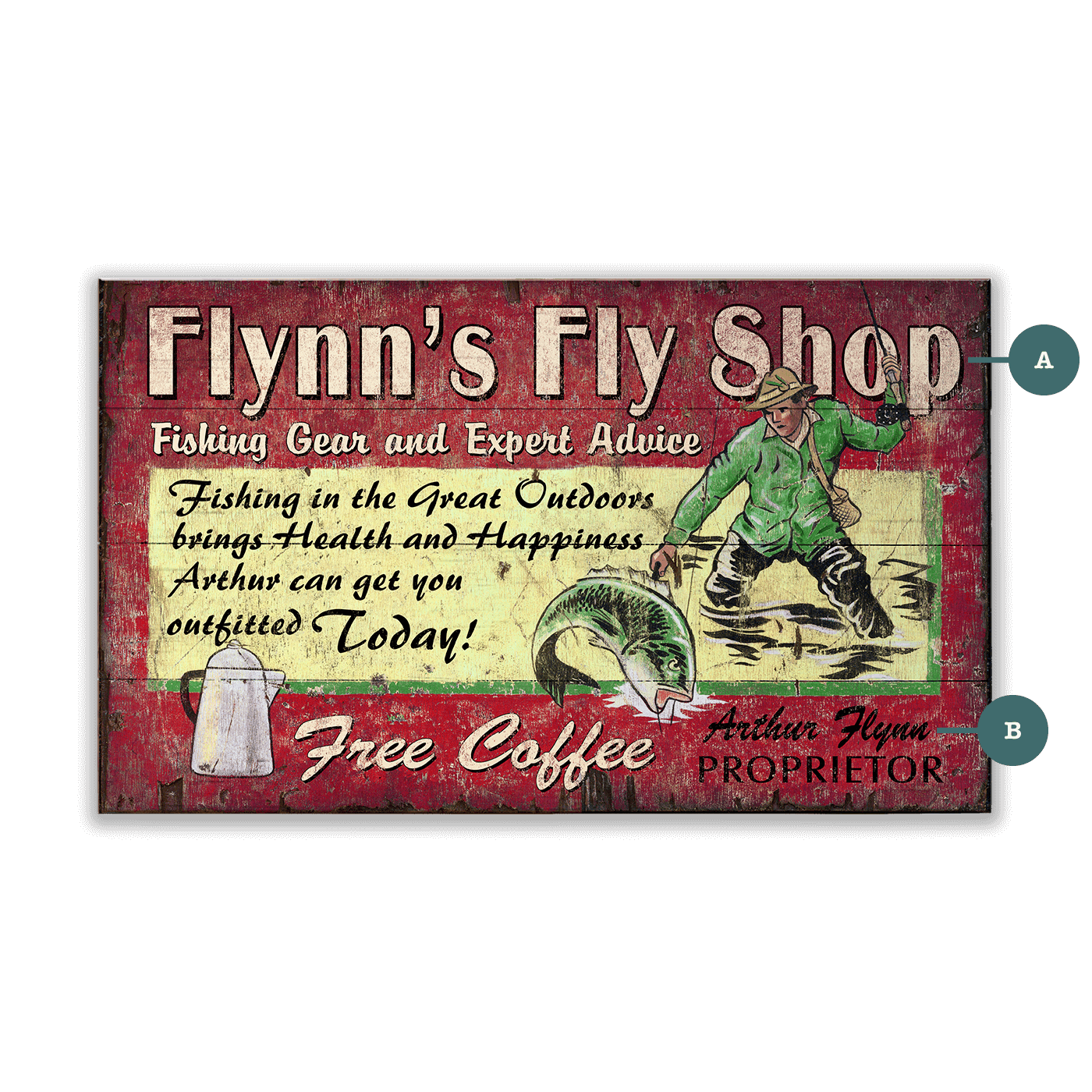 This vintage fly shop artwork exudes the charm of a classic fishing destination with its retro design and rustic appeal. Featuring an angler in action and a welcoming offer of expert fishing advice, this piece perfectly captures the spirit of outdoor adventure and relaxation. The weathered look adds character, making it ideal for cabins, fishing lodges, or anyone who appreciates a nostalgic nod to the joys of fly fishing.