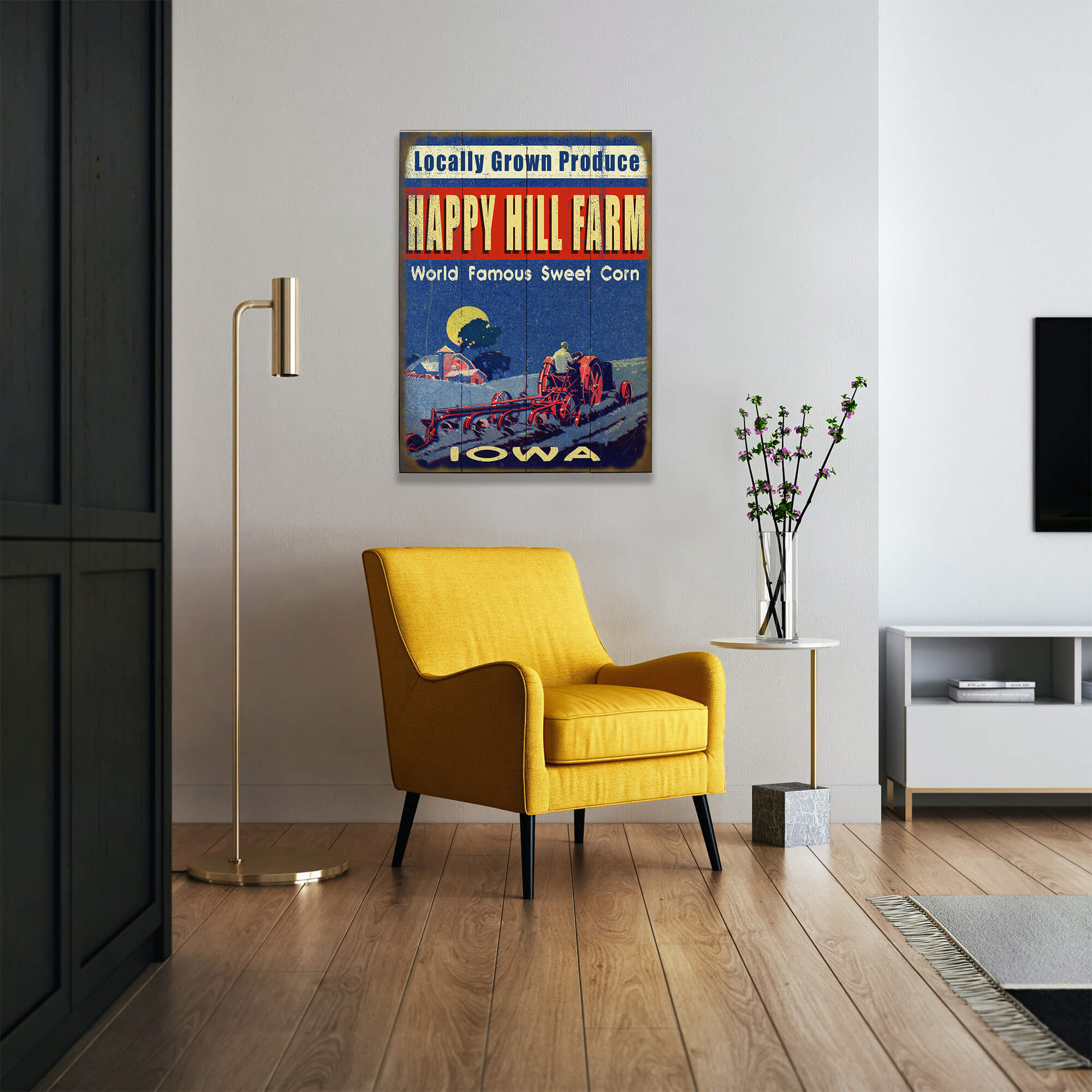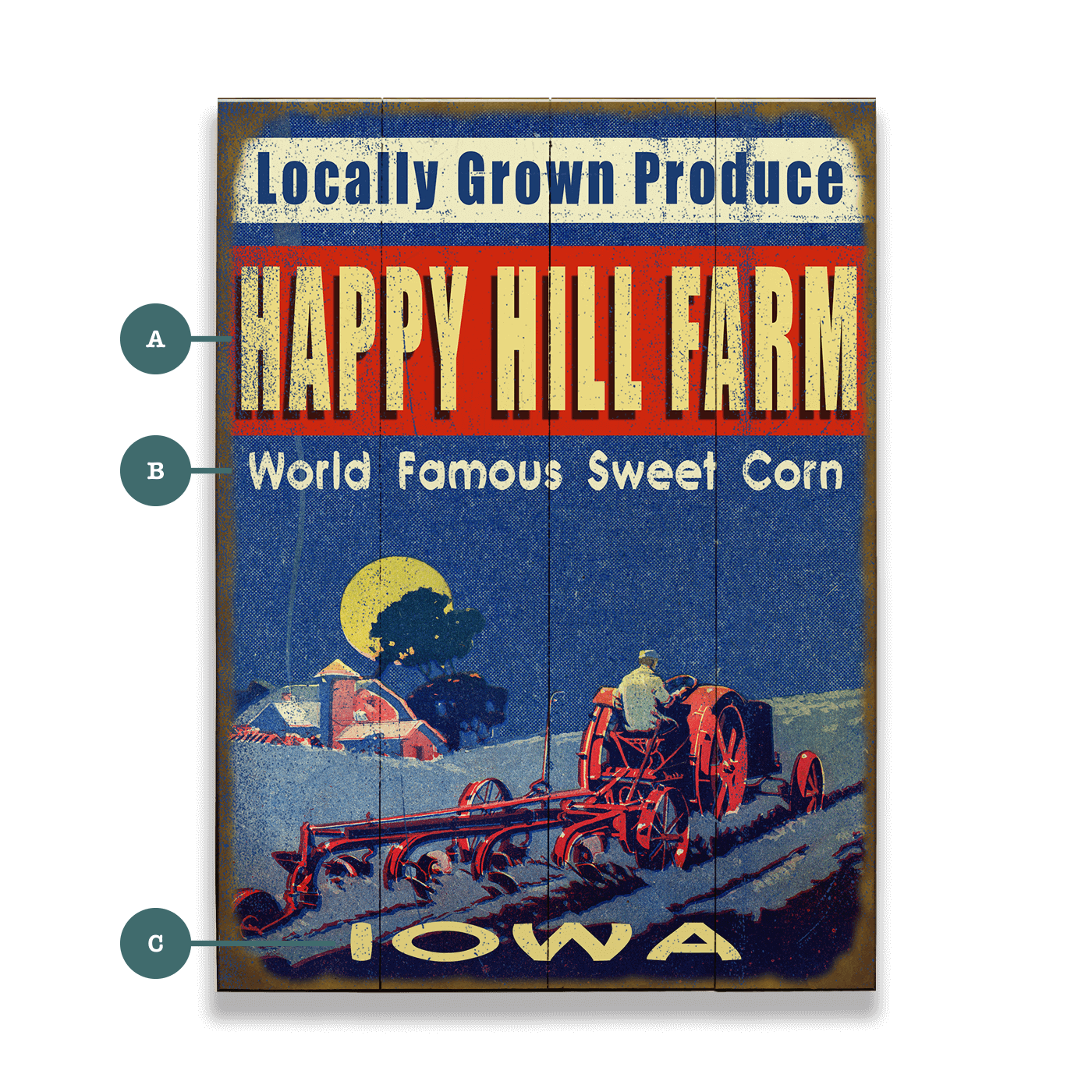 Capturing the essence of hardworking farm life, this piece showcases a farmer working the fields under the glow of a full moon. The rich, bold colors and distressed textures evoke the charm of vintage agricultural advertisements, celebrating the tradition of locally grown produce. The strong typography and rustic imagery highlight the pride and dedication of rural farming communities. Perfect for farmhouses, markets, or anyone who appreciates the timeless beauty of life on the land.