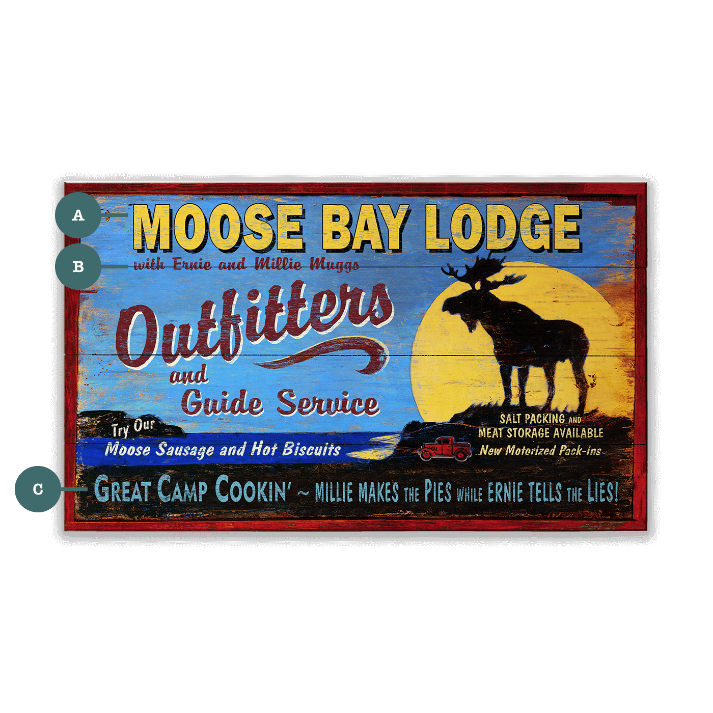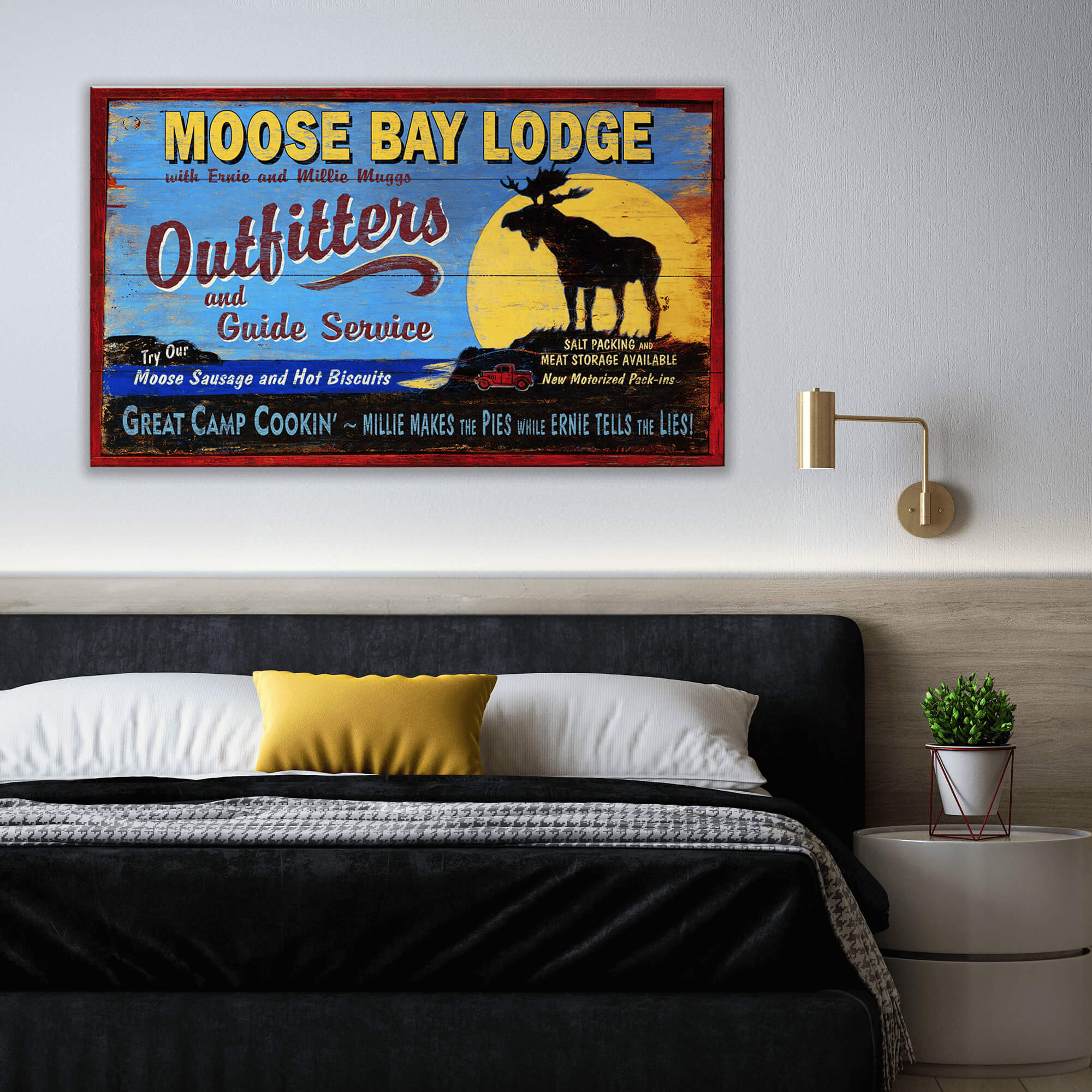 This vintage-inspired artwork captures the rustic charm of a wilderness outfitter and guide service, complete with playful slogans and a striking moose silhouette against a colorful sunset. Highlighting outdoor adventures, hearty camp cooking, and the joy of the great outdoors, this piece is perfect for adding a nostalgic touch to any cabin, lodge, or nature-themed space. Its retro style and bold colors evoke the spirit of adventure and outdoor living, making it a great addition for those who love exploring the wild.