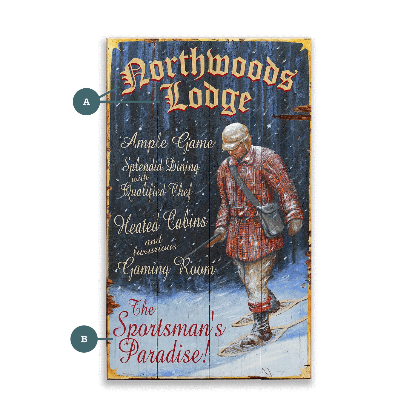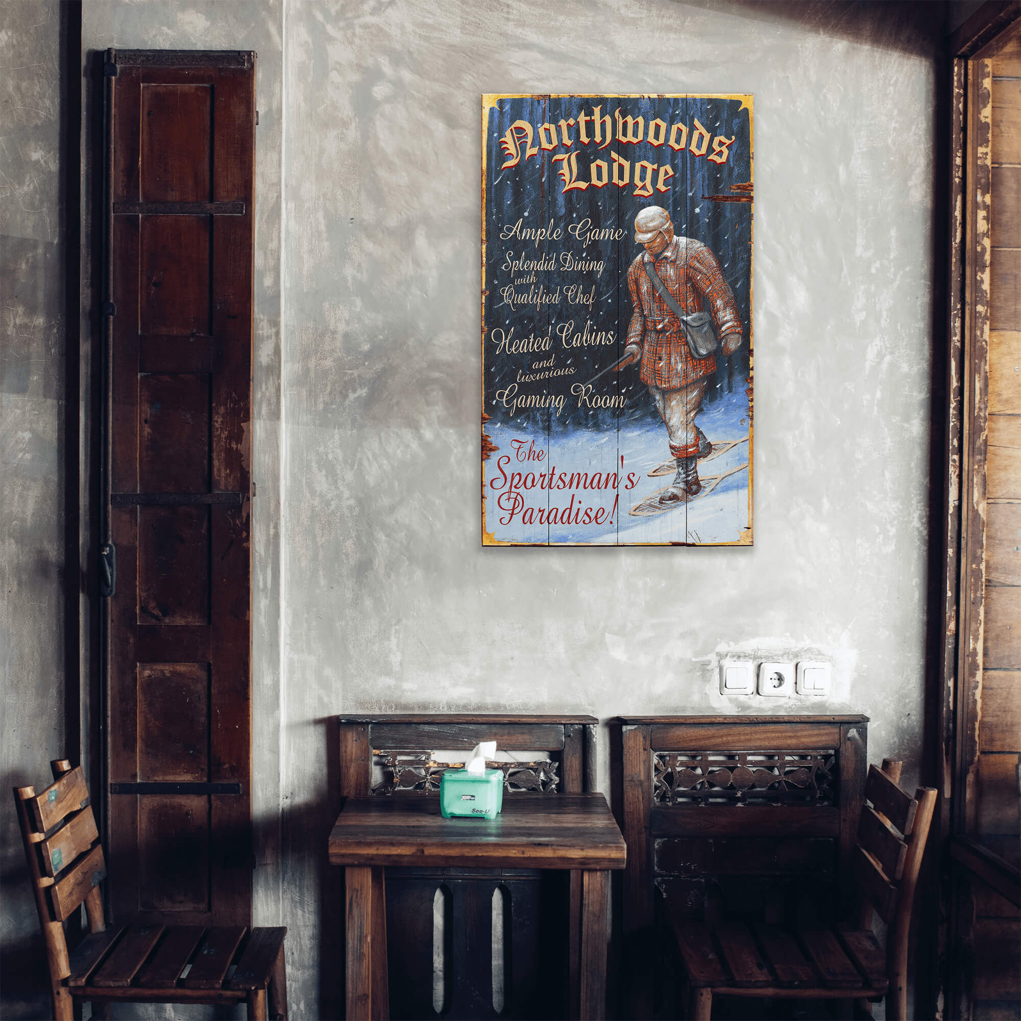 This vintage-inspired artwork features a winter sportsman trekking through a snowy forest, highlighting the rustic charm of a cozy lodge retreat. The classic design, with bold lettering and a distressed finish, evokes nostalgia for traditional hunting lodges and outdoor adventures. Perfect for adding a warm, inviting touch to cabins, lodges, or rustic-themed decor, it brings a sense of rugged comfort to any space.