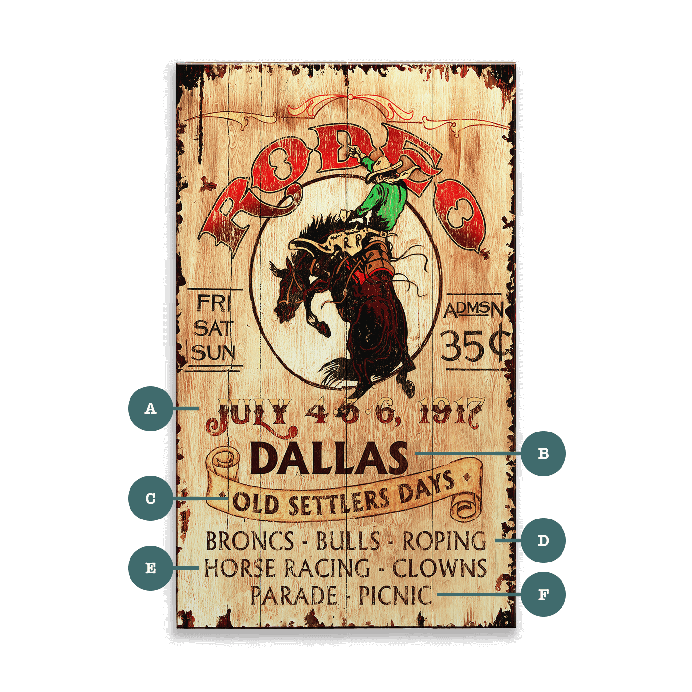 This vintage-style rodeo artwork captures the essence of early 20th-century Western entertainment, featuring a classic bronc rider set within a circular frame. The weathered woodgrain background, distressed textures, and bold typography evoke the nostalgic charm of old-time rodeo flyers and Wild West show advertisements. Highlighting traditional rodeo events, this artwork pays tribute to the thrilling competitions and lively festivities of the frontier. Perfect for Western enthusiasts, collectors, and rodeo fans, this piece brings the rugged spirit of cowboy culture to any space.