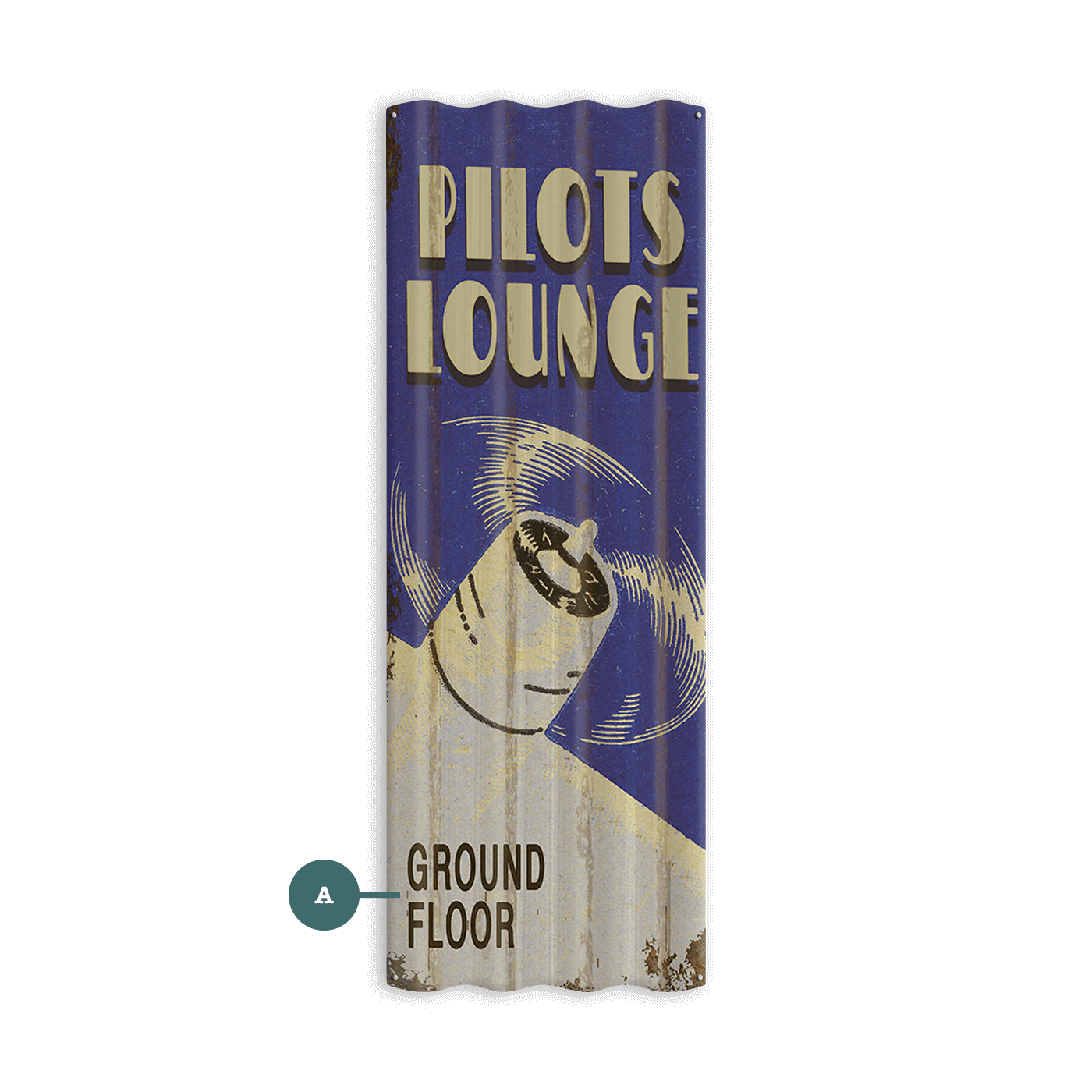 This vintage-style sign, "Pilots Lounge" is a charming nod to the classic aviation era. It features a rich blue backdrop and a creative depiction of a propeller in motion, symbolizing both movement and the spirit of flight. The rustic, weathered texture enhances its historical feel, making it an ideal decor piece for aviation enthusiasts and anyone who appreciates retro style. This artwork is perfect for enhancing the ambiance of personal spaces, offices, or themed establishments, inviting viewers to step back in time to the golden age of aviation.