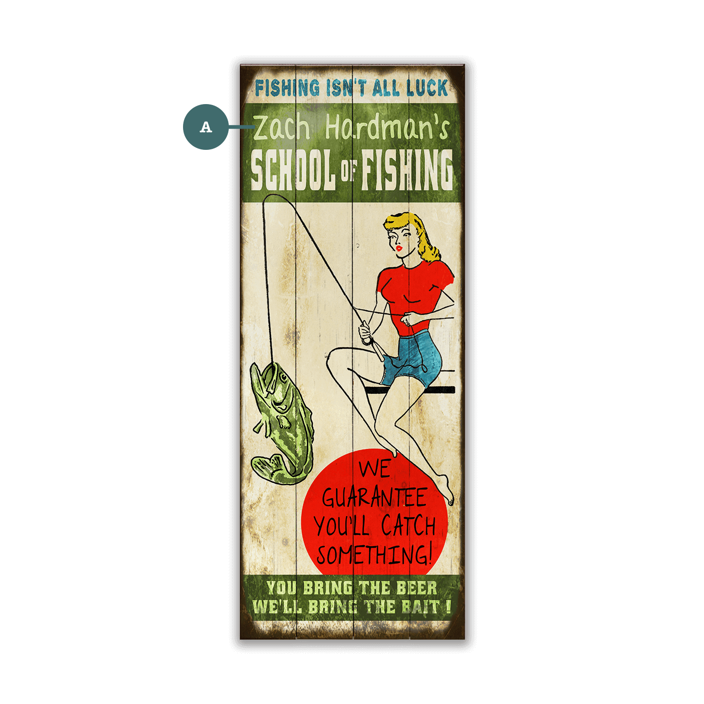 Add a playful touch to your decor with this whimsical fishing sign featuring a vintage-inspired design. The artwork humorously promotes a fishing school, complete with a guarantee of catching something, making it a fun and eye-catching addition to any space. The distressed look adds a nostalgic charm, perfect for cabins, lodges, or any outdoor-themed room. Ideal for fishing enthusiasts and those who appreciate a good laugh, this piece brings a unique and entertaining vibe to your home.