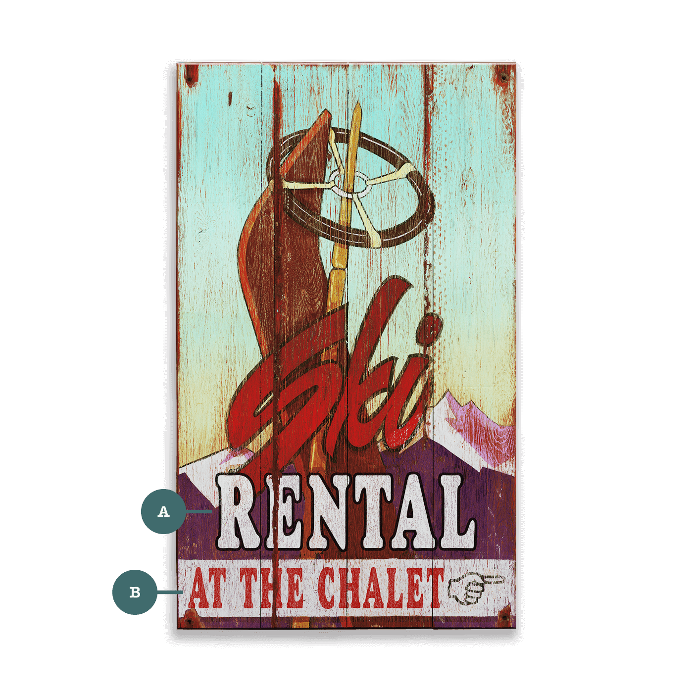 This retro-inspired ski rental artwork captures the fun and adventure of a classic mountain getaway. Featuring vibrant colors and a weathered, rustic look, this piece evokes a sense of nostalgia and outdoor excitement. Perfect for ski lodge décor, cabins, or those who love vintage winter sports aesthetics, this artwork adds a charming, old-school vibe to any space. Its bold lettering and playful design make it an eye-catching addition for anyone looking to bring a touch of the slopes into their home or business.