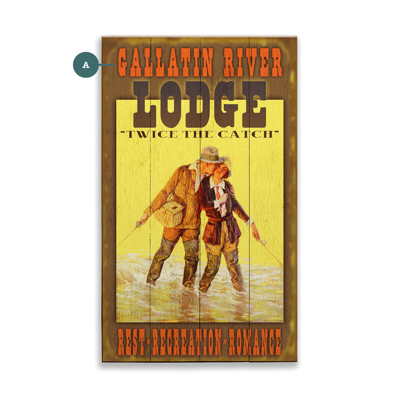 Bring a touch of romance and adventure to your decor with this vintage-inspired sign, featuring a charming scene of a couple fishing together. The artwork captures the essence of rest, recreation, and romance, making it a perfect addition to any lodge, cabin, or outdoor retreat. Its nostalgic design and warm colors create an inviting atmosphere, ideal for those who cherish the great outdoors and the special moments shared there.