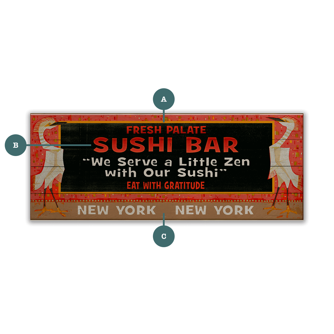This artwork radiates a sense of harmony and cultural elegance, blending bold design elements with a serene undertone. Featuring a vintage-style blackboard advertising a sushi bar where flavor meets mindfulness, the composition is framed by graceful egrets and warm tones. Perfect for spaces that honor culture, calmness, and creativity, this design encapsulates the spirit of eating with intention and appreciation.