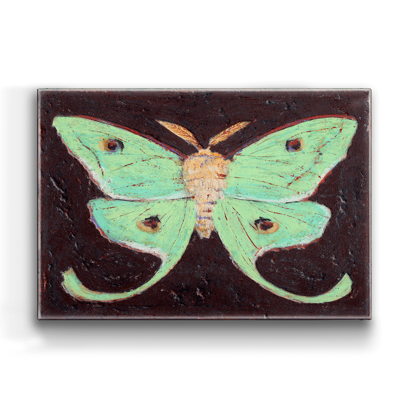 Elevate your space with this stunning artwork showcasing a vibrant luna moth in striking mint green tones against a rich, textured dark background. The delicate details and symmetrical composition celebrate the beauty and elegance of this nocturnal creature. Perfect for nature enthusiasts or anyone seeking a unique and eye-catching piece, this artwork adds a touch of mystery and sophistication to any room.