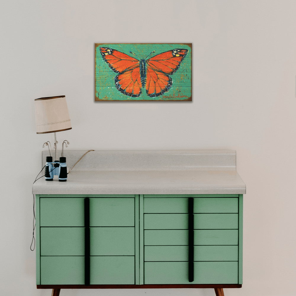 Experience the iconic beauty of the Monarch butterfly through this striking artwork. The vivid orange wings are set against a cool turquoise background, giving this piece a vibrant contrast that captivates and charms. Each brushstroke adds depth and texture, making the butterfly seem almost alive on the canvas. Perfect for anyone looking to add a pop of color and a touch of nature's elegance to their home or office, this artwork is a must-have for nature lovers and art collectors alike. This piece is part of Shelle Lindholm's "Winged Wonders" series.