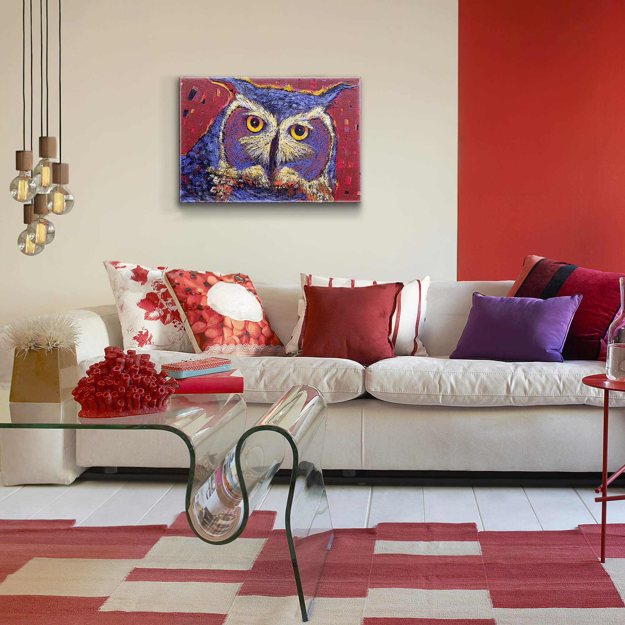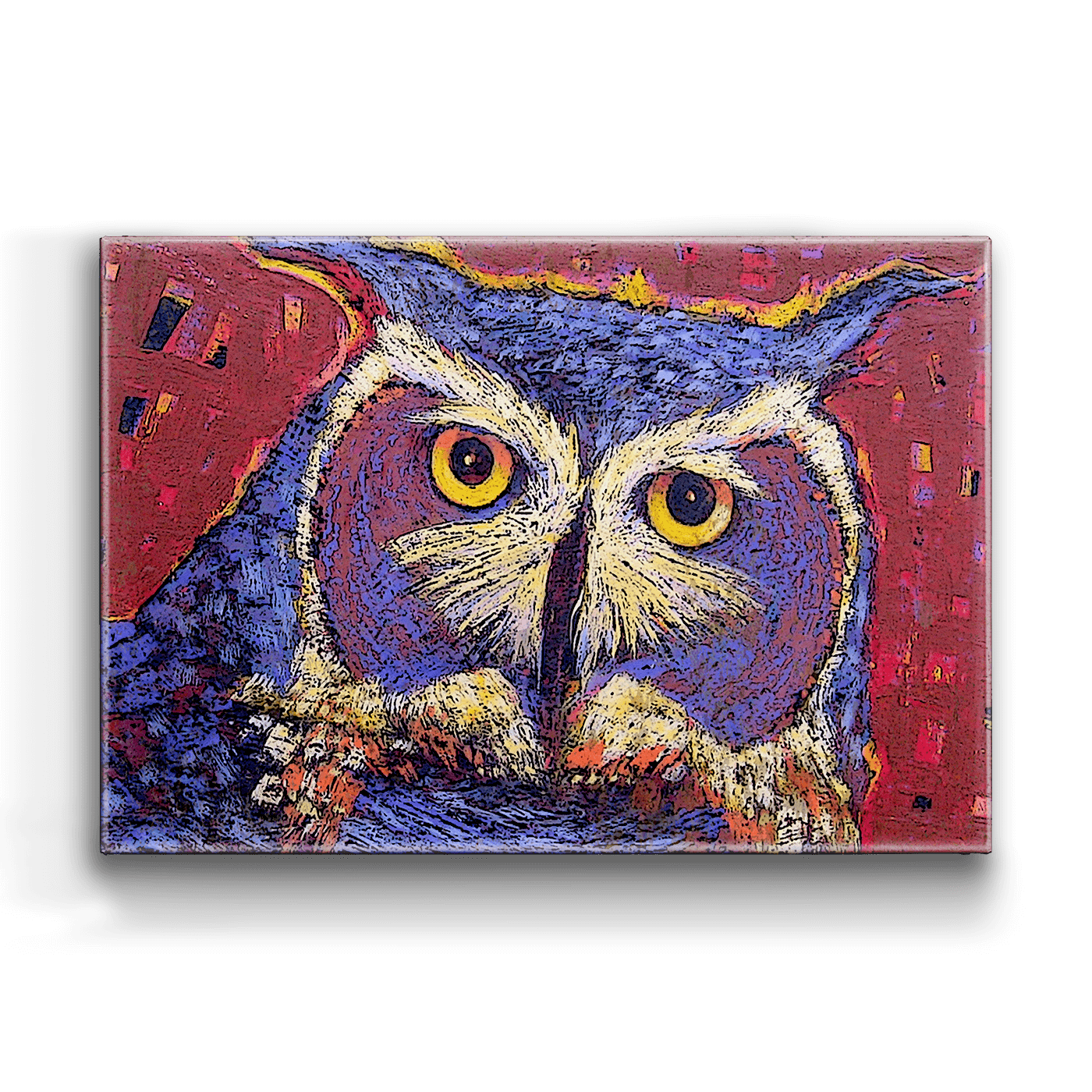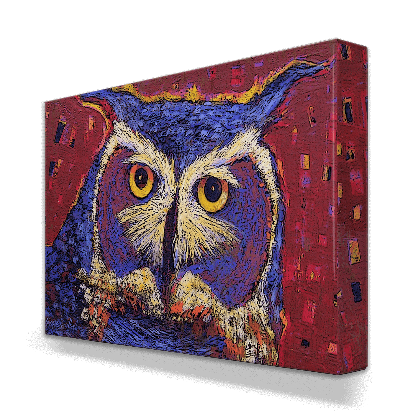 This captivating artwork of a great horned owl brings a sense of mystery and wisdom to life. The intricate details of the owl’s intense gaze and striking plumage are accentuated by a rich, textured background in vibrant red with hints of gold and purple. The geometric patterns and bold brushstrokes add a modern flair, while the deep, watchful eyes of the owl draw the viewer in. Perfect for creating a dramatic focal point, this piece combines natural beauty with artistic boldness, celebrating the majestic and enigmatic spirit of the owl.