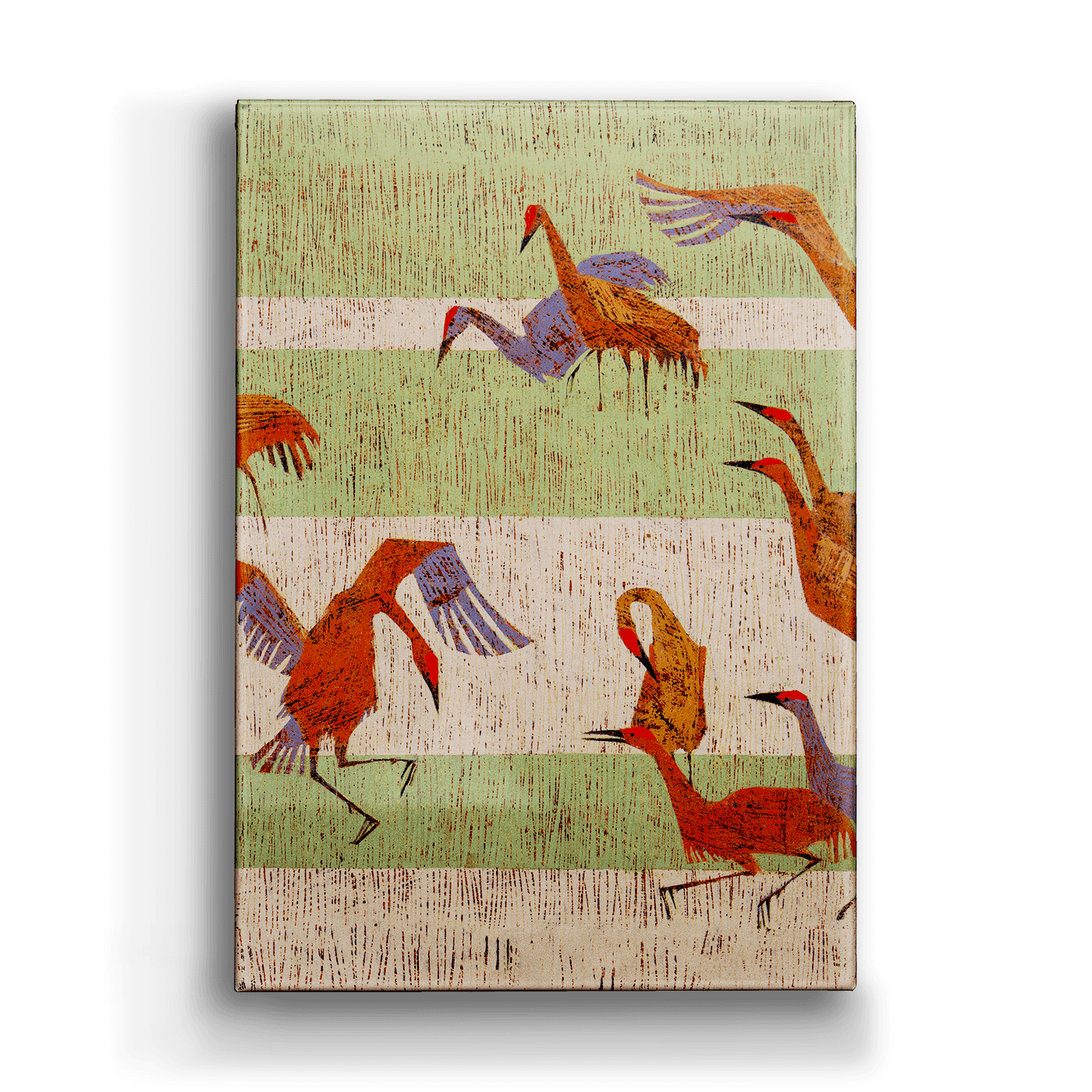 This striking triptych features a dynamic depiction of cranes in motion, set against a textured background of soft greens and earthy tones. The warm hues of the birds contrast beautifully with the muted backdrop, creating a sense of movement and harmony. The artwork's rustic texture adds depth and dimension, making it an ideal piece for those who appreciate nature-inspired art with a modern twist. Perfect for bringing a touch of the wild into your home, this triptych captures the elegance and grace of cranes in a captivating, minimalist style.