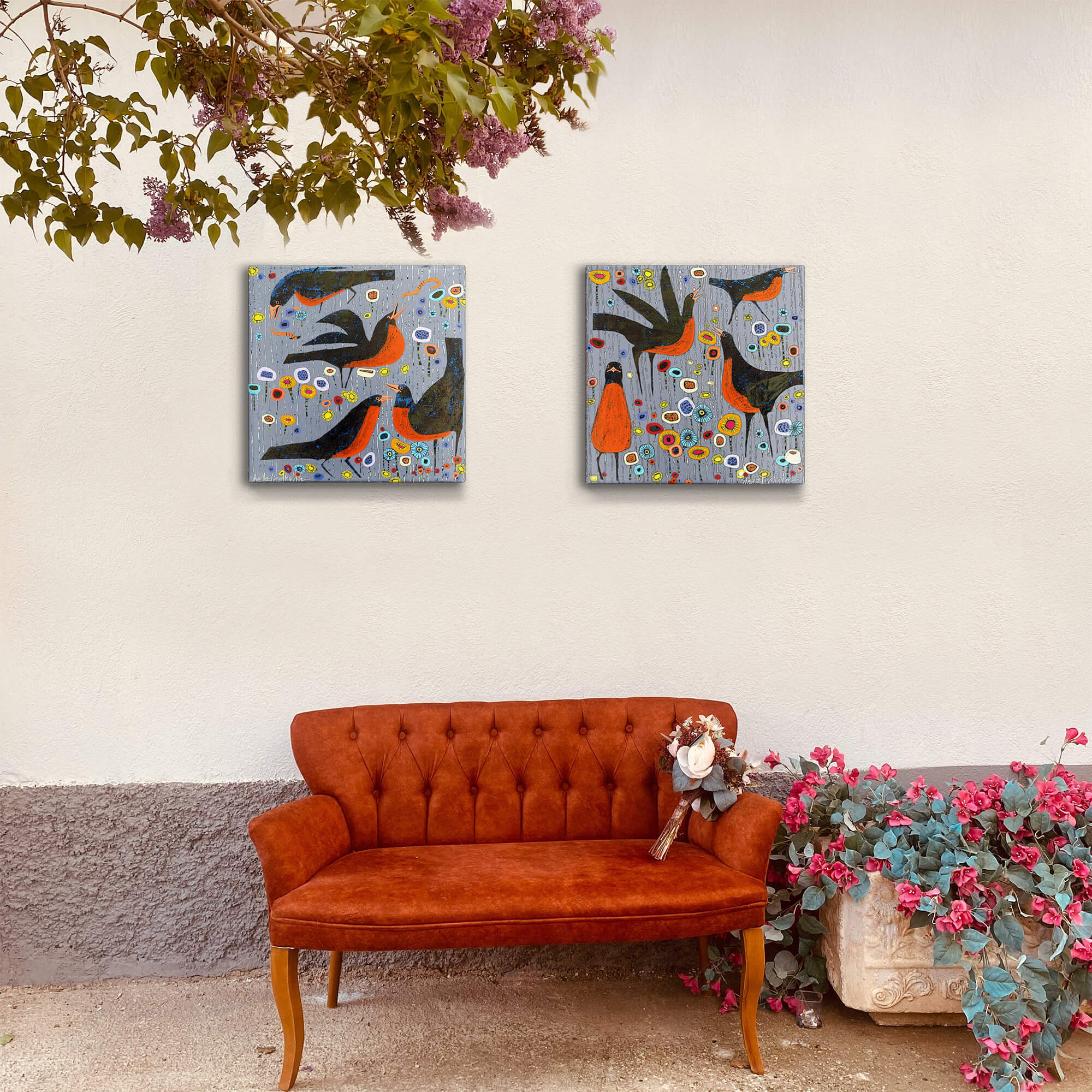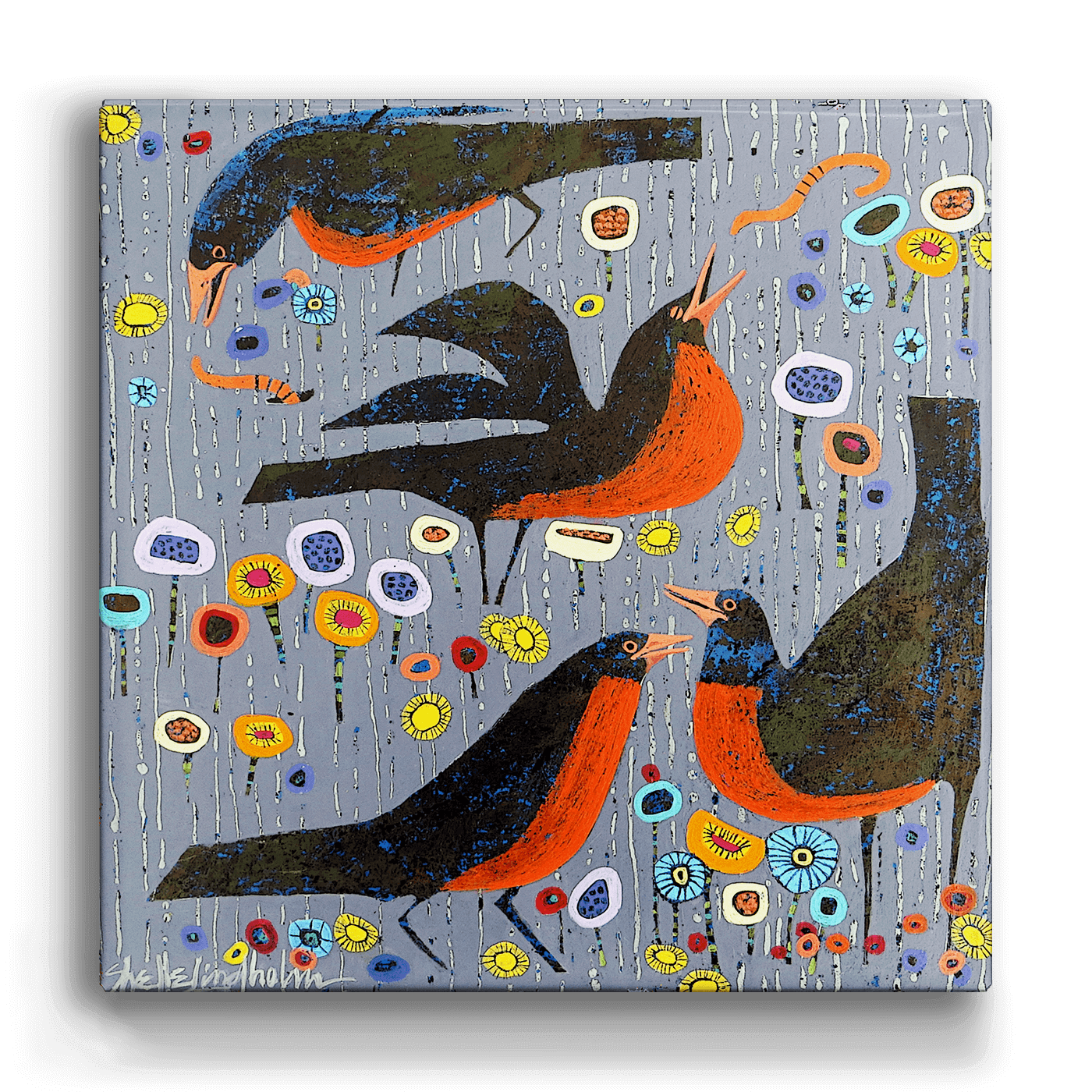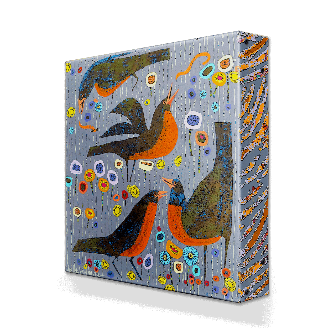 Brighten your space with this delightful artwork of lively robins singing and strutting among vibrant flowers against the gentle gray of a rain-inspired backdrop. The piece captures the essence of the birds' joy and harmony, telling the story of celebration and beautiful melodies on a rainy day. Perfect for bird enthusiasts or anyone looking to add a cheerful and contemporary touch to their space, this artwork radiates energy and charm.