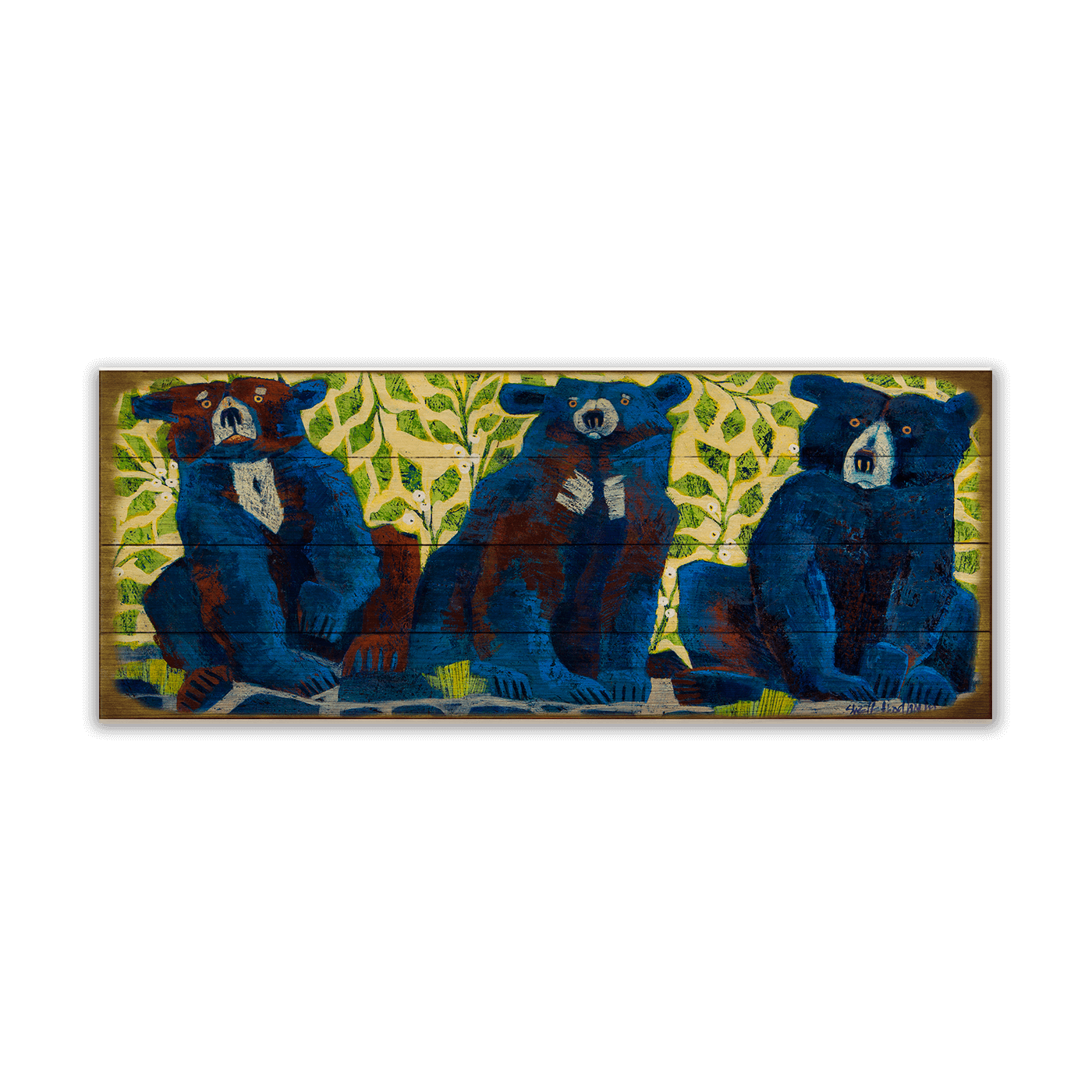 Bring a touch of charm and personality to your space with this delightful artwork of three bears set against a vibrant, leafy backdrop. The rich blue tones of the bears create a striking contrast with the tranquil green and yellow foliage, adding depth and texture to the composition. The whimsical expressions add warmth and personality, making it a perfect piece for nature lovers and those seeking a playful yet sophisticated addition to their decor.