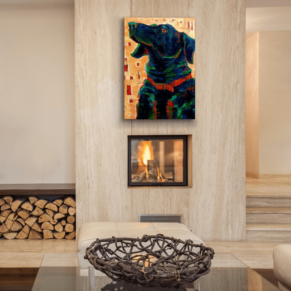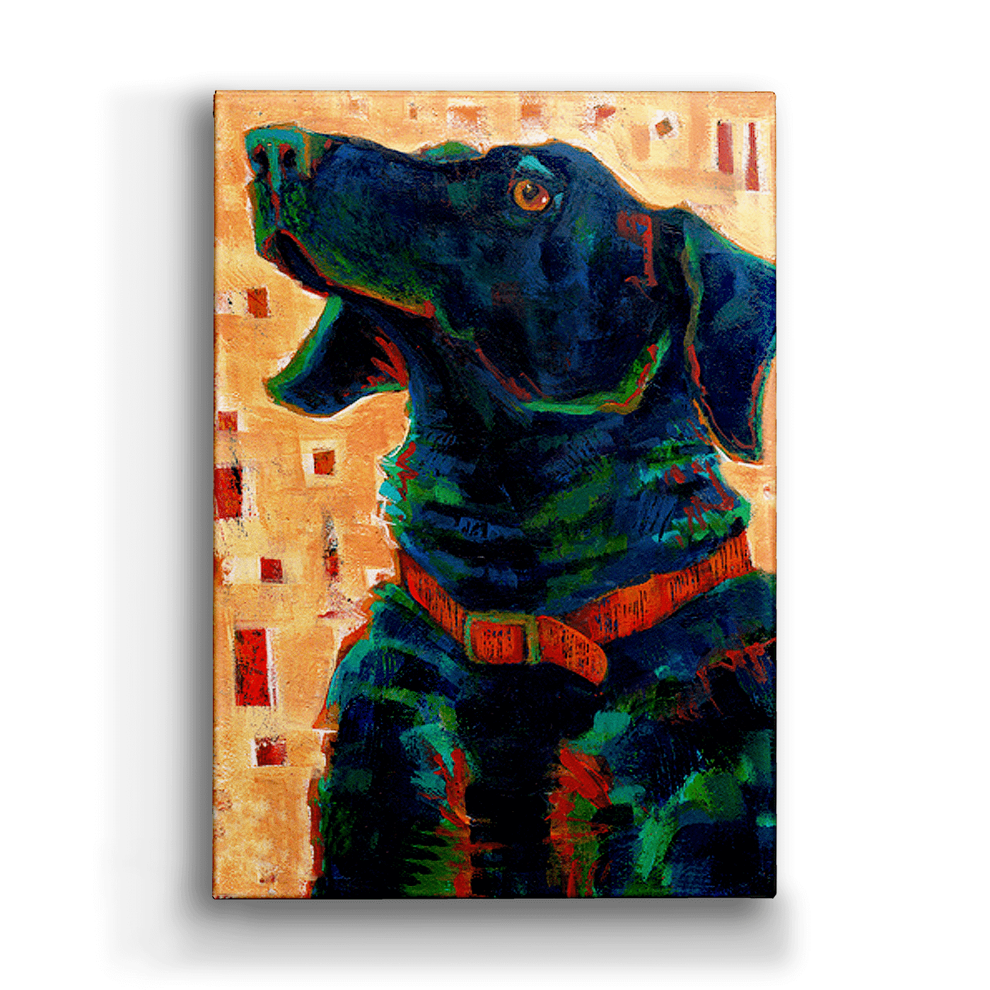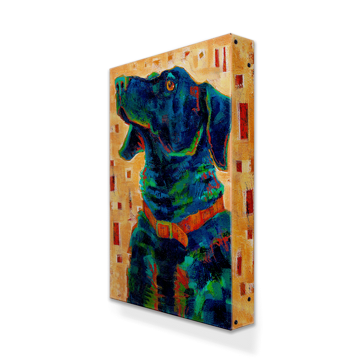 This expressive artwork captures the loyal and intelligent essence of a dog, beautifully rendered in deep blues and greens with hints of orange. The warm, patterned background enhances the composition with subtle contrast and modern flair. The piece radiates warmth and personality, celebrating the spirit of canine companions. Perfect for animal lovers, this artwork adds a striking yet heartfelt touch to any space.