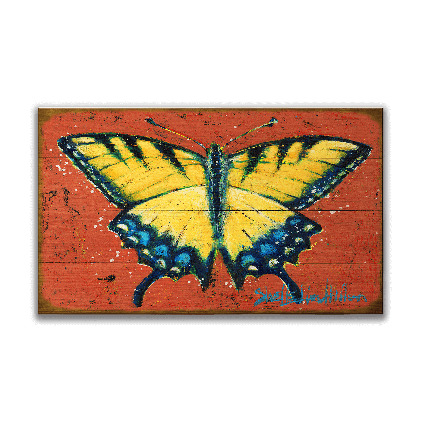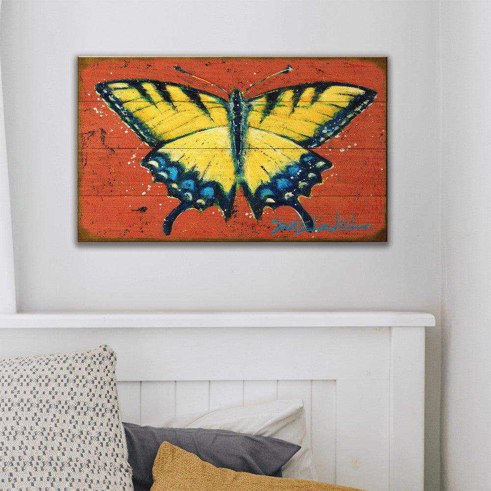 Brighten up your space with this vibrant depiction of a Yellow Swallowtail butterfly. This artwork pops with vivid yellow and blue hues against a fiery red background, capturing the lively essence and delicate beauty of this beloved butterfly. Ideal for adding a splash of color and nature-inspired charm to any room, this piece is perfect for collectors and enthusiasts who appreciate both art and the natural world. This piece is part of Shelle Lindholm's "Winged Wonders" series.