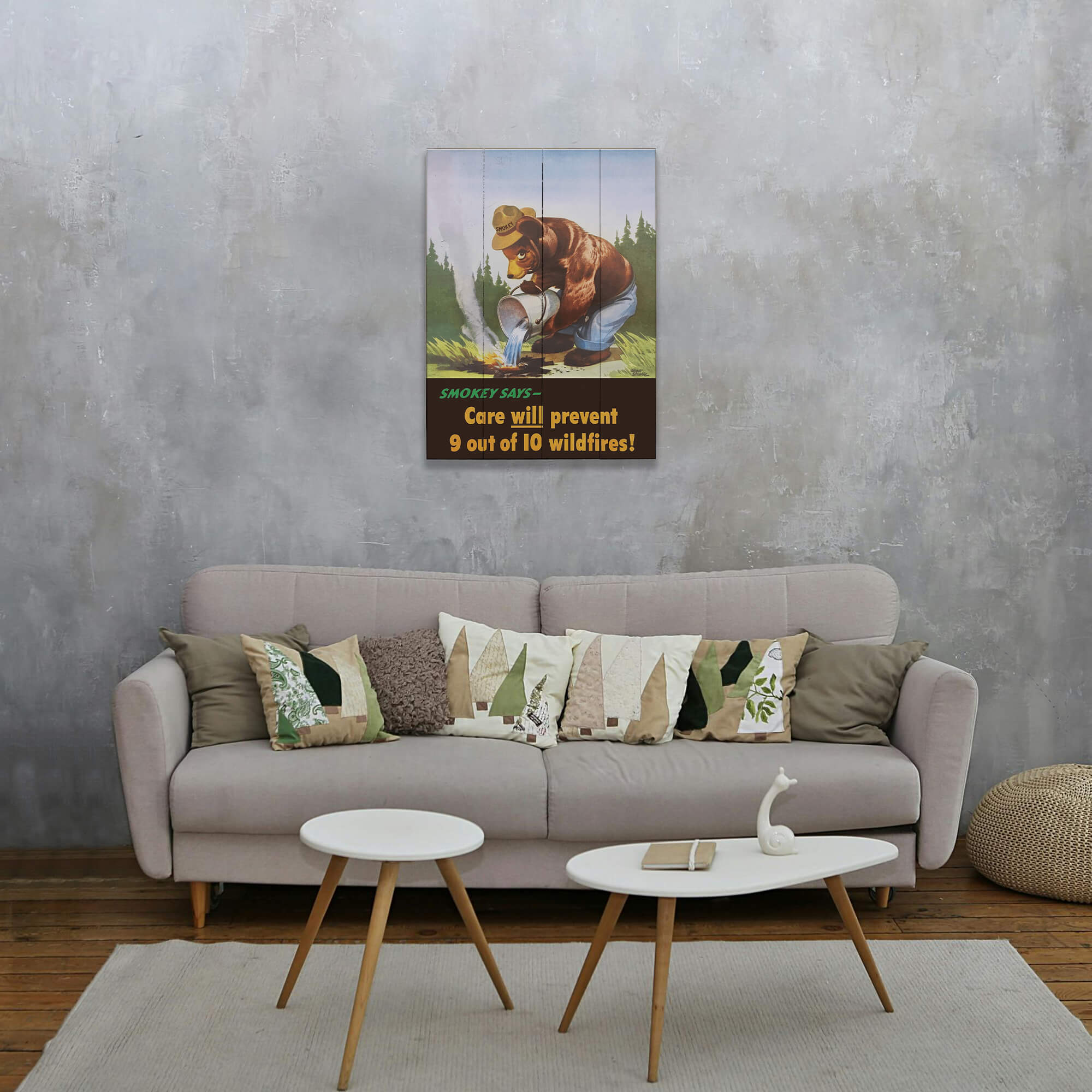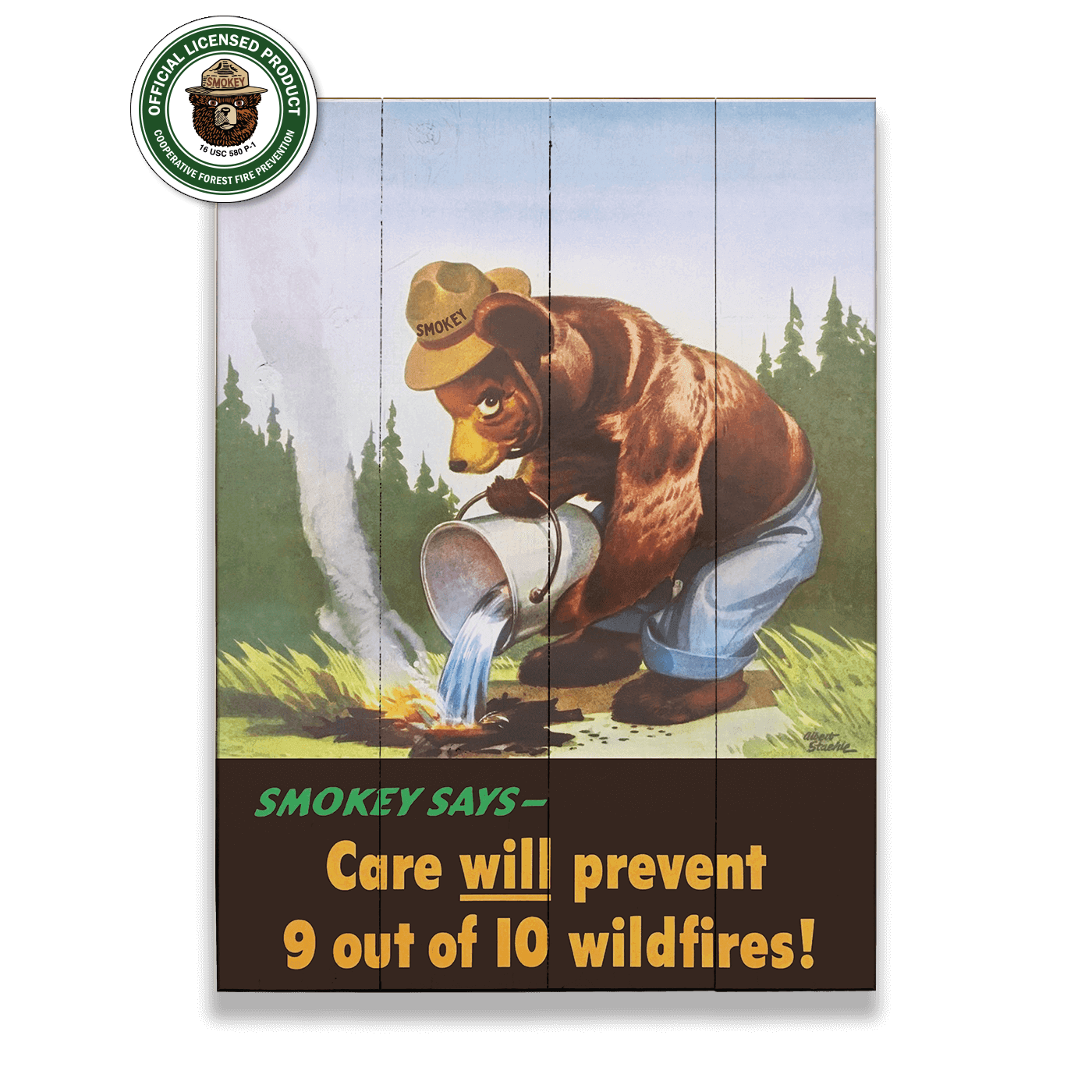 This vintage-style Smokey Bear sign delivers a timeless message with enduring relevance: 9 out of 10 wildfires can be prevented with care. Featuring Smokey dousing a smoldering campfire, the illustration reminds viewers of their responsibility to act thoughtfully in the outdoors. With its classic design and bold typography, this piece is a meaningful addition to cabins, campgrounds, nature centers, or any place that values fire safety and conservation.