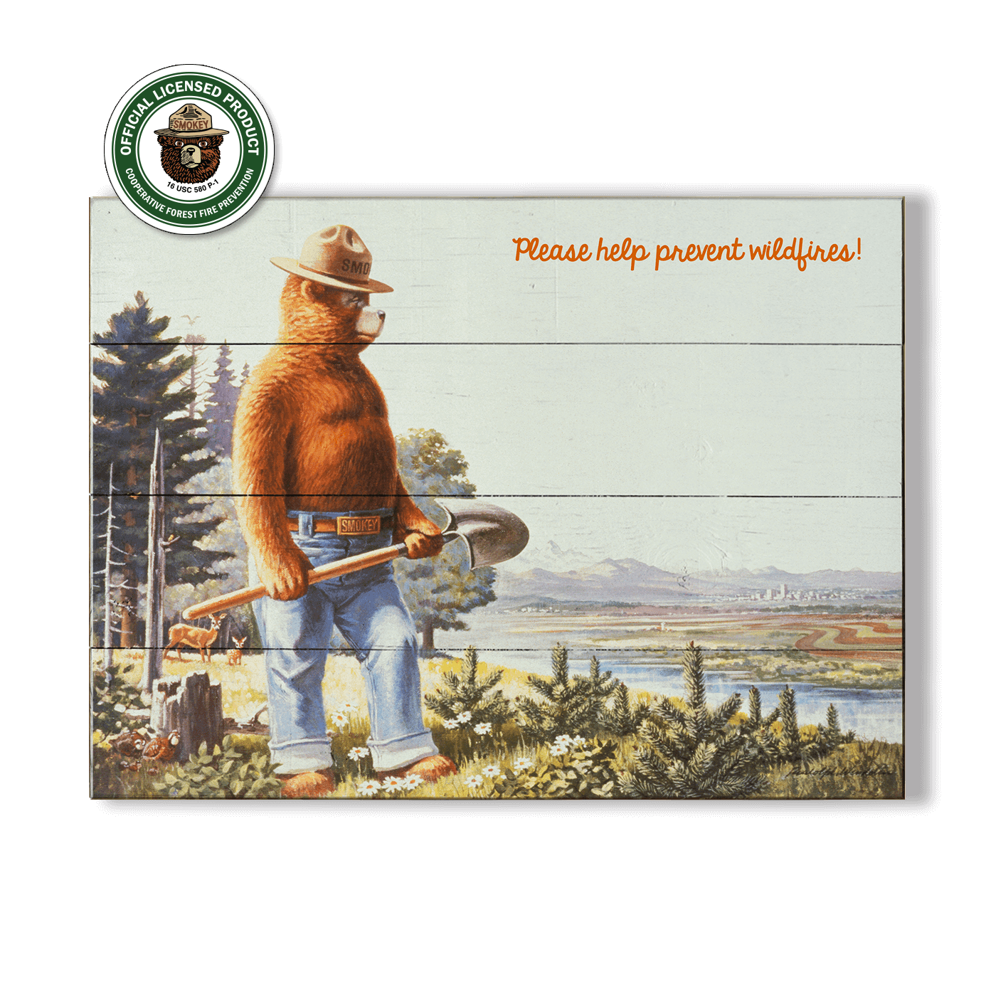 Celebrate timeless conservation values with this classic Smokey Bear artwork, reminding everyone to help prevent wildfires. Clad in his iconic hat and jeans and equipped with his trusty shovel, Smokey stands guard above a scenic landscape that captures the beauty worth protecting. This versatile, vintage-inspired sign is perfect for cabins, ranger stations, nature centers, or any space dedicated to preserving our forests and natural heritage.