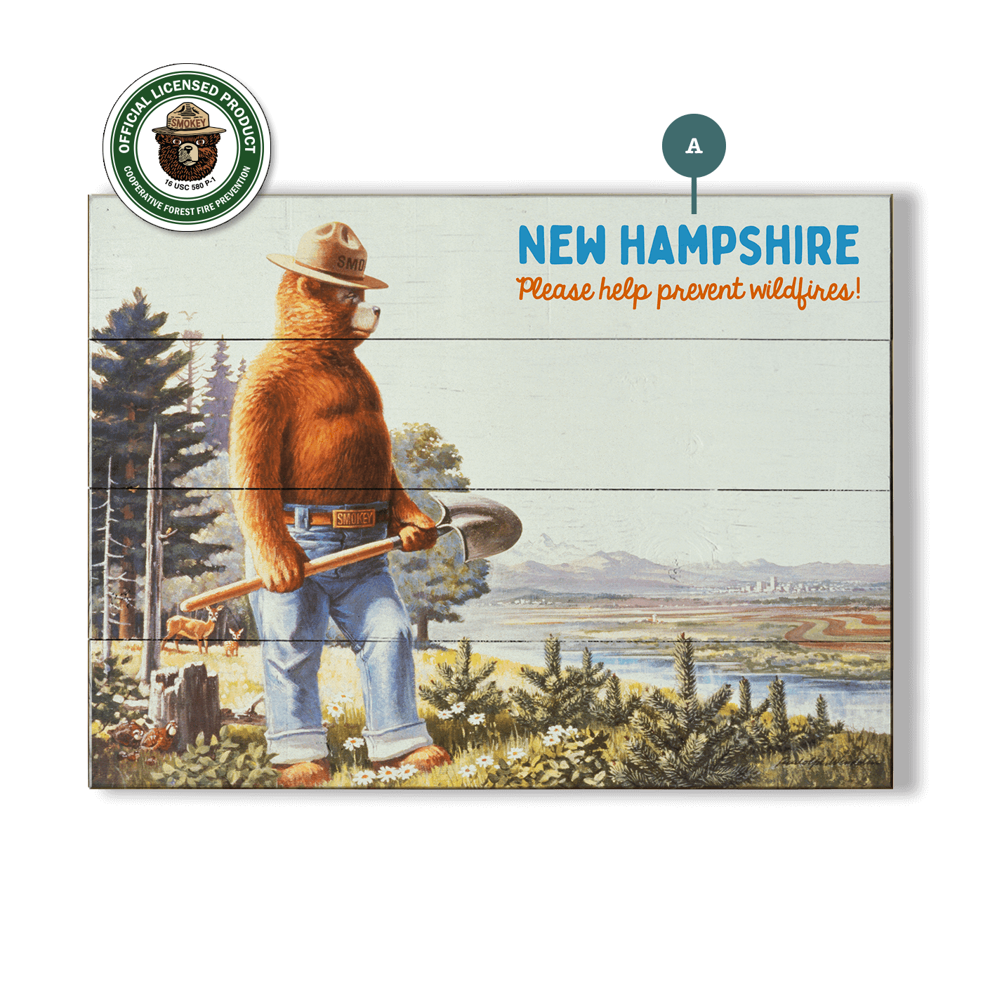 Celebrate timeless conservation values with this classic Smokey Bear artwork, reminding everyone to help prevent wildfires. Clad in his iconic hat and jeans and equipped with his trusty shovel, Smokey stands guard above a scenic landscape that captures the beauty worth protecting. With the option to choose your favorite location (only state names are allowed), this versatile, vintage-inspired sign is perfect for cabins, ranger stations, nature centers, or any space dedicated to preserving our forests and natural heritage.
