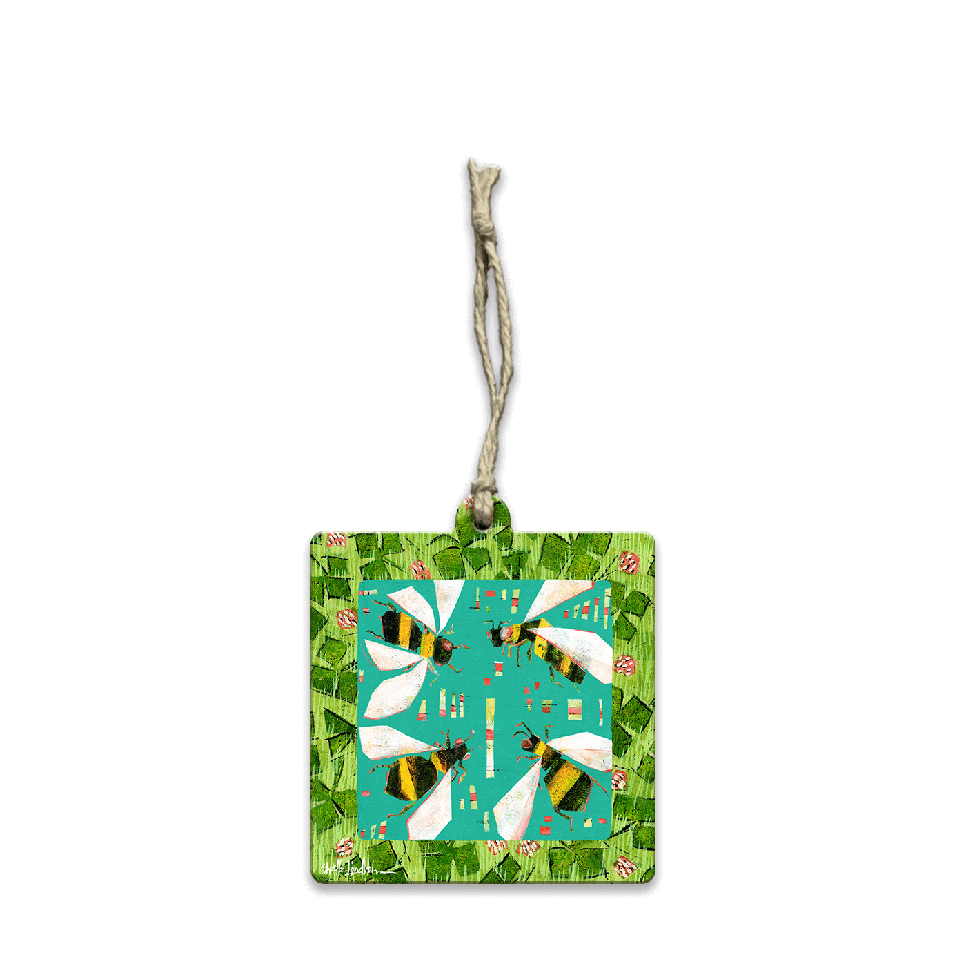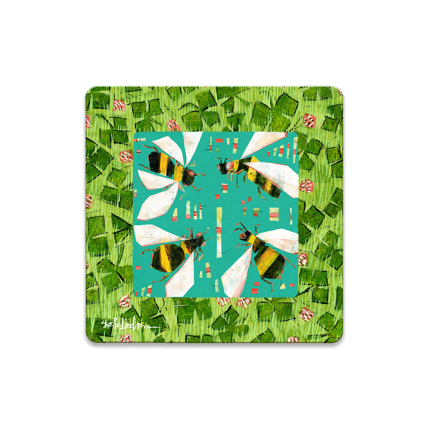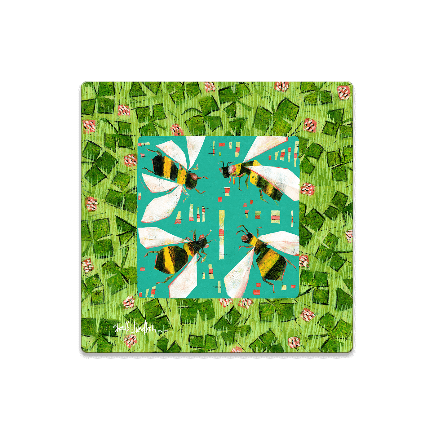 This vibrant artwork captures the dynamic energy of buzzing bees against a striking turquoise background, surrounded by a lush, textured green border of clover. The intricate details and vivid colors celebrate the vital role of pollinators in our ecosystem. Blending nature's charm with artistic expression, this piece is perfect for nature enthusiasts and eco-conscious art lovers.