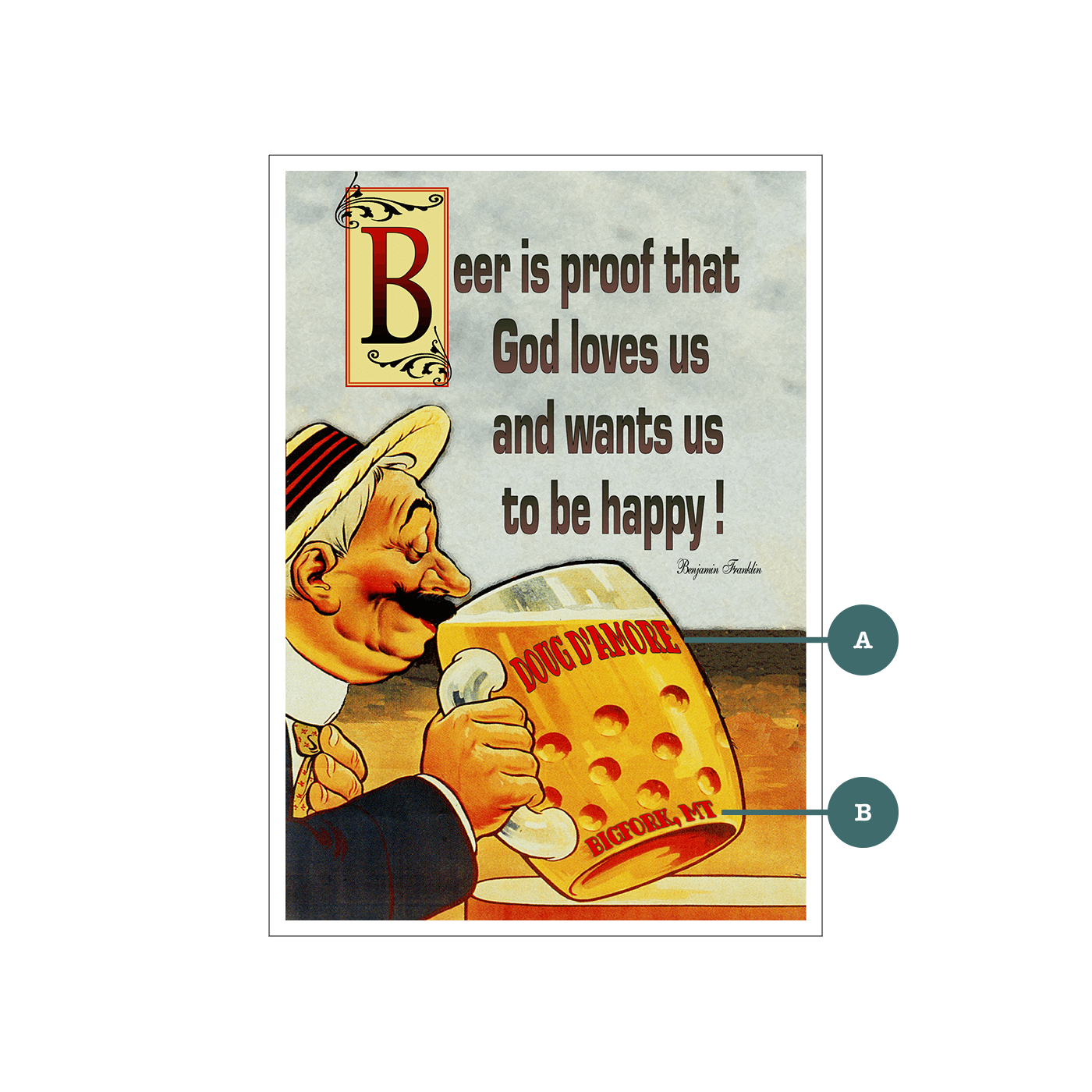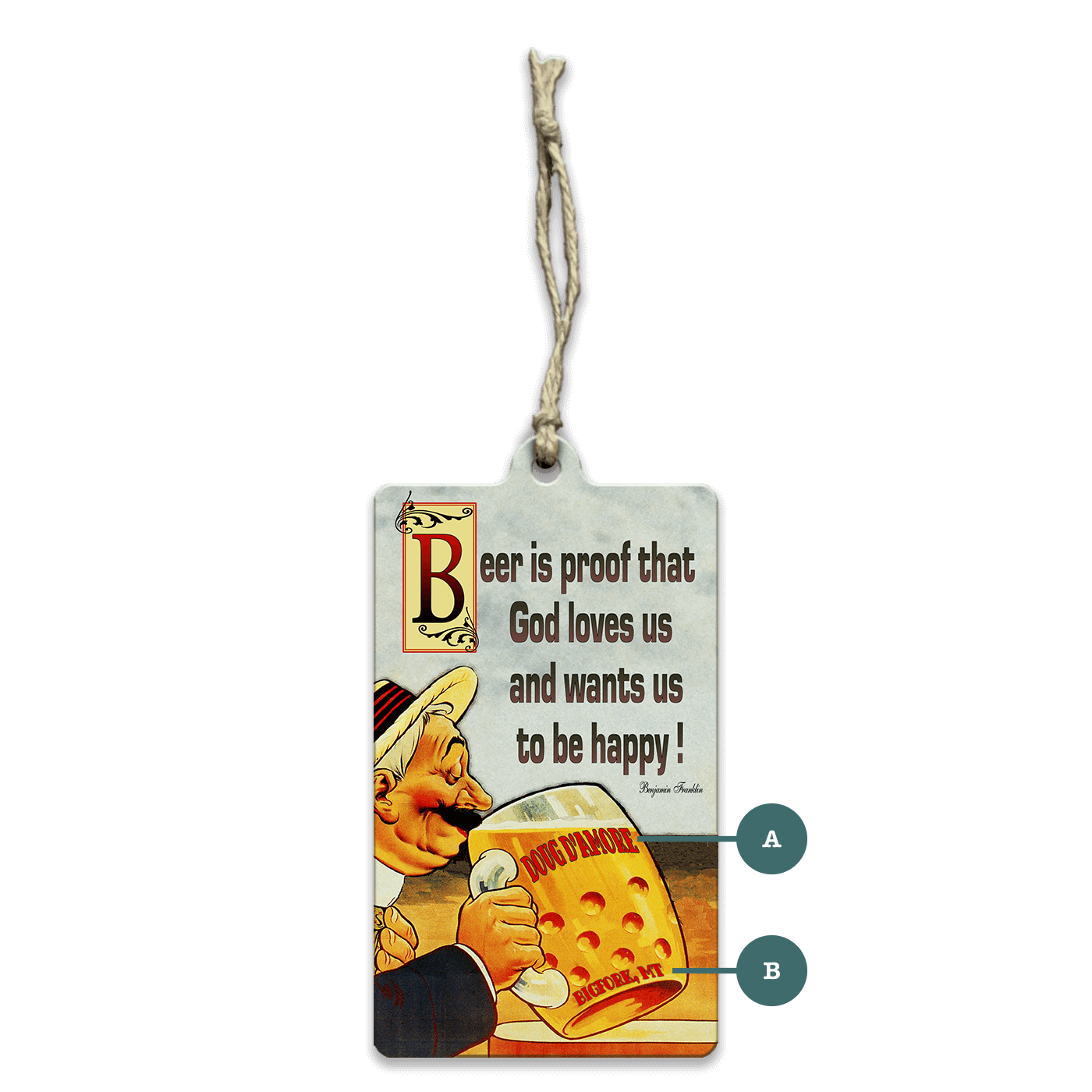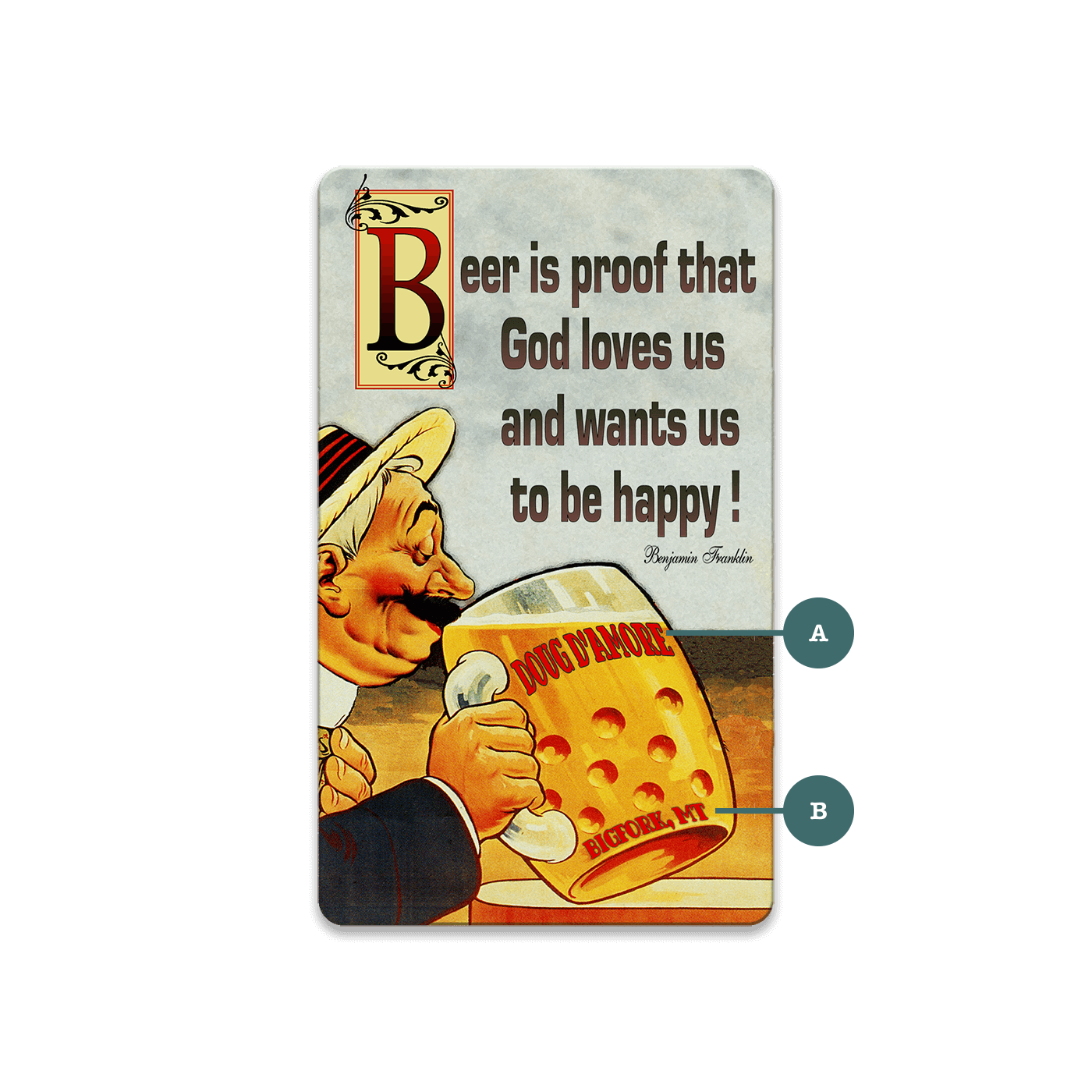 This cheerful vintage-style sign features a playful illustration of a dapper gentleman happily sipping from an oversized beer stein, paired with the classic quote attributed to Benjamin Franklin: “Beer is proof that God loves us and wants us to be happy!” The bold, stylized text and distressed edges evoke the charm of old pub walls and corner taverns. Customizable with the name and location of your favorite watering hole, it’s a perfect addition to home bars, breweries, or man caves that embrace humor, hops, and heritage.