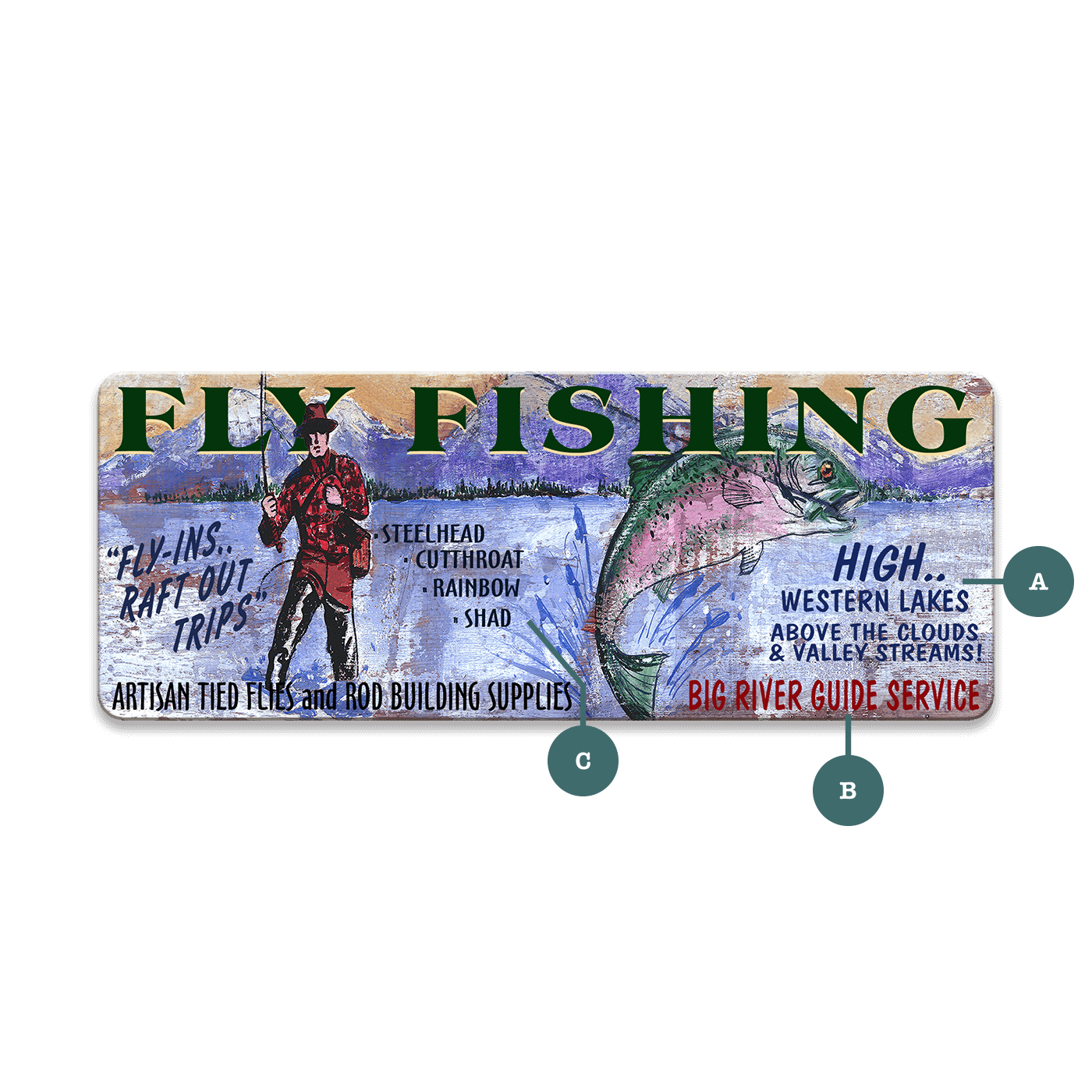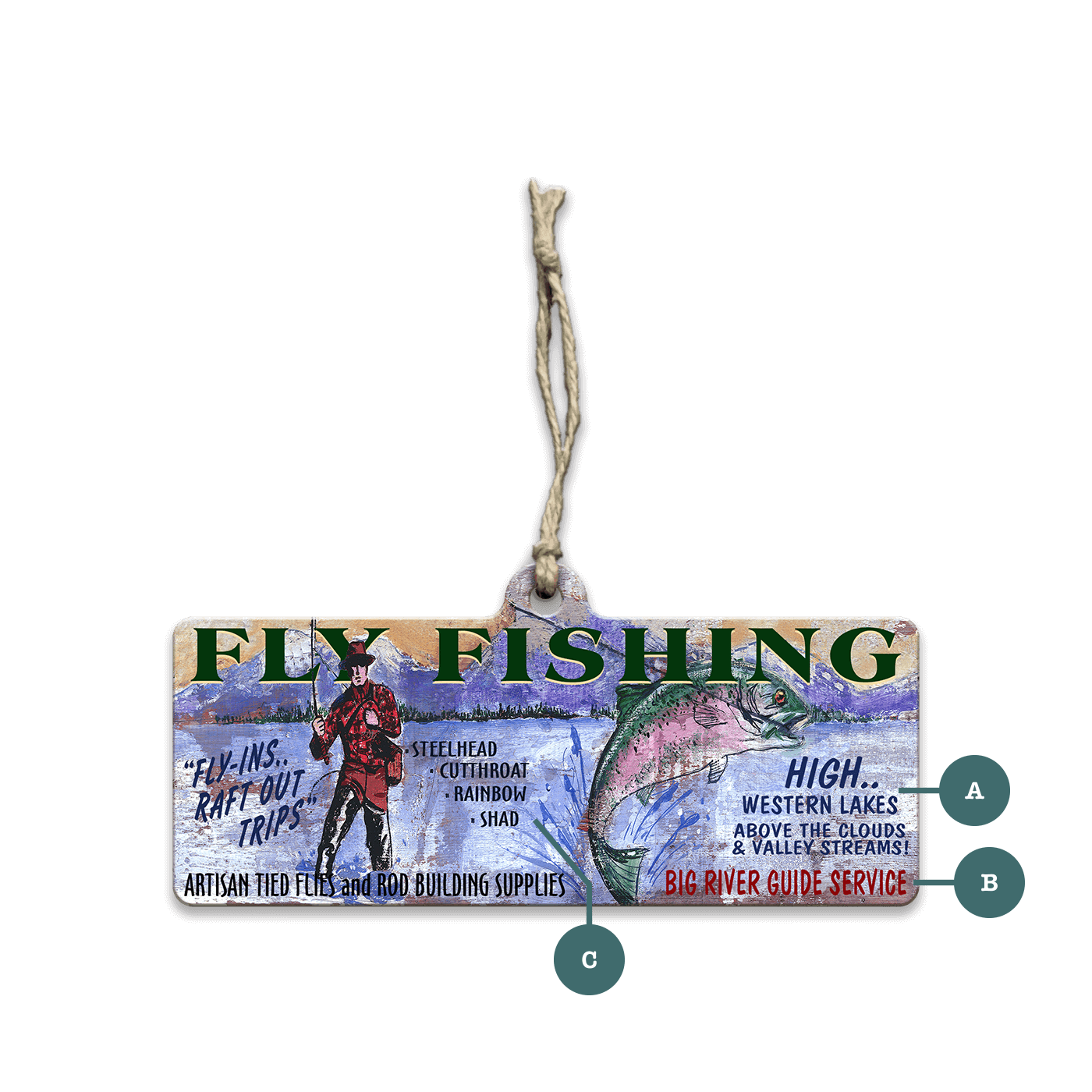 Celebrate the timeless thrill of the cast with this vintage-style fly fishing sign, illustrated in a bold, painterly style that evokes the hand-painted charm of classic outdoor advertisements. Featuring a well-outfitted angler and a vivid rainbow trout, the scene conjures up memories of remote rivers and expertly tied flies. Whether you're drawn to fly-in backcountry adventures or quiet valley streams, this piece captures the enduring spirit of the sport. Customizable with the names of your preferred catches and location, this sign makes a fitting addition to cabins, fishing lodges, outfitters, or rustic retreats.
