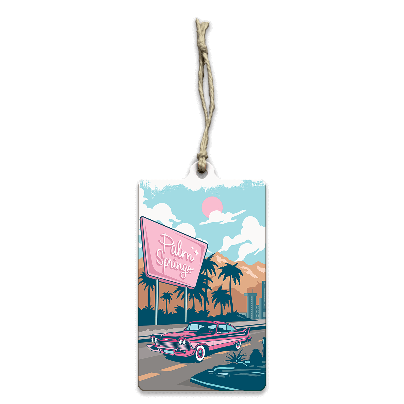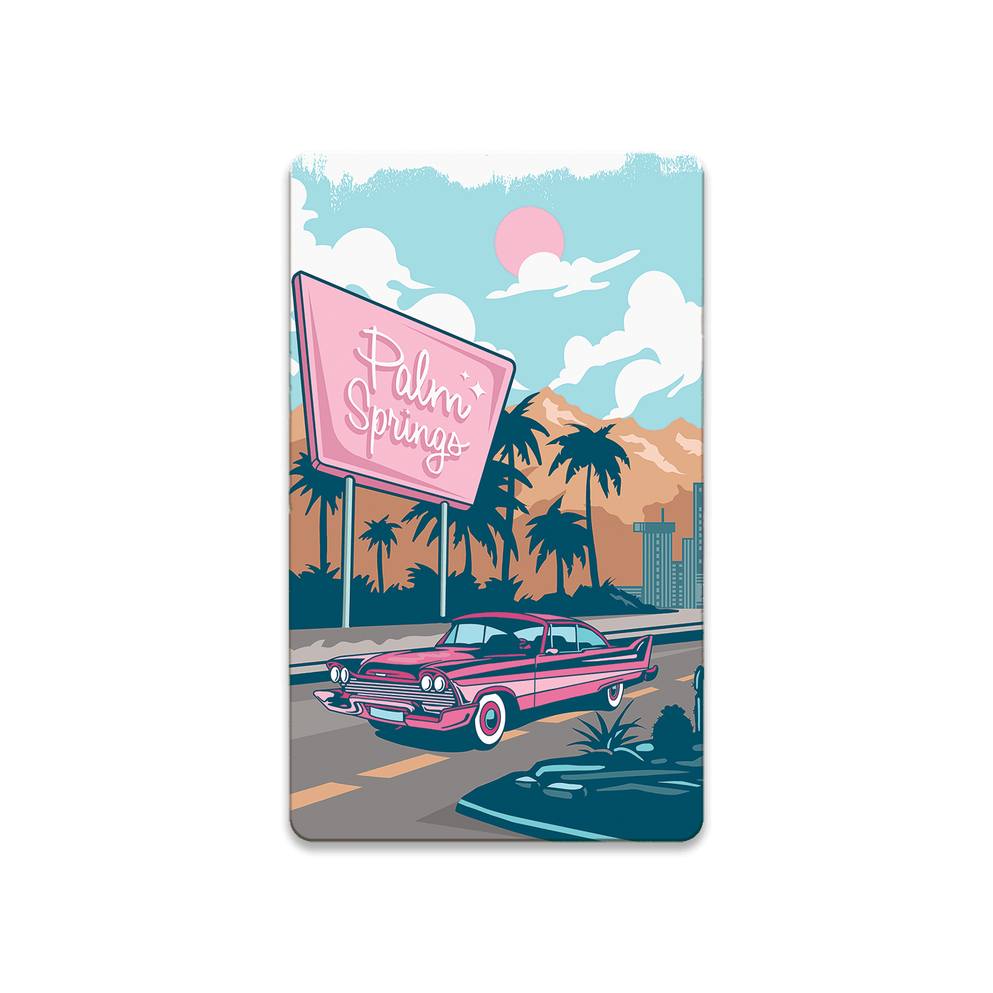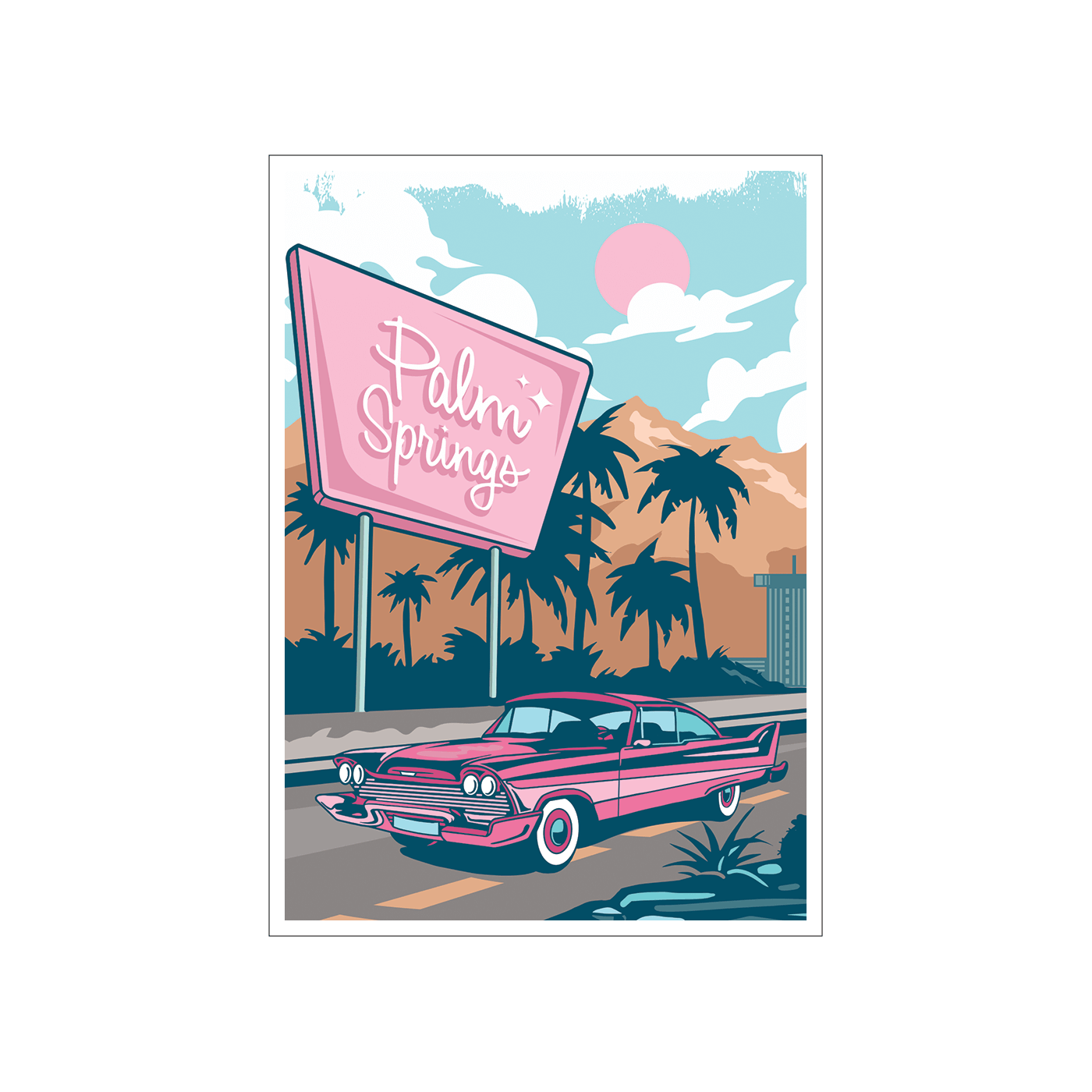 This retro-inspired artwork showcases a classic drive through a mid-century desert cityscape, aka Palm Springs, complete with palm trees, neon signage, and a vintage car cruising the sunny boulevard. The vibrant color palette and nostalgic design make it a perfect addition to spaces that embrace a retro vibe or a love for iconic road trips. Ideal for living rooms, offices, or any space seeking a touch of vintage flair.