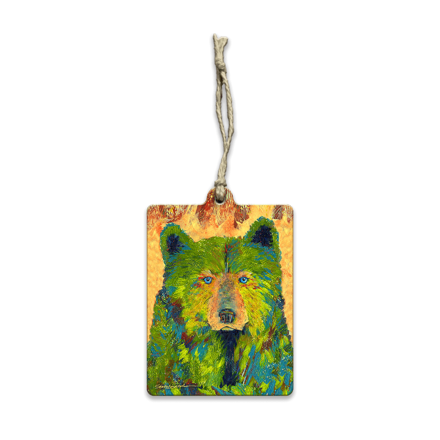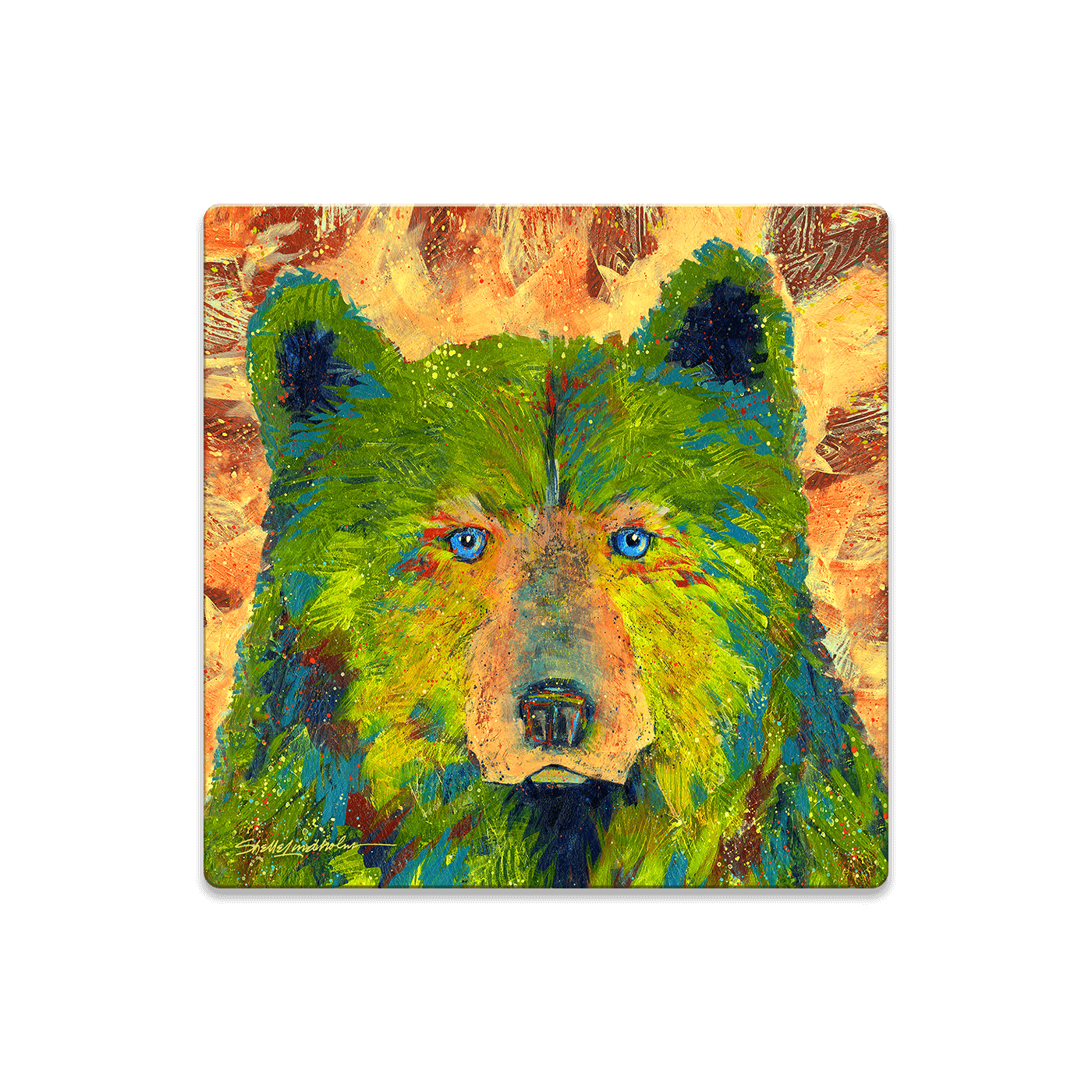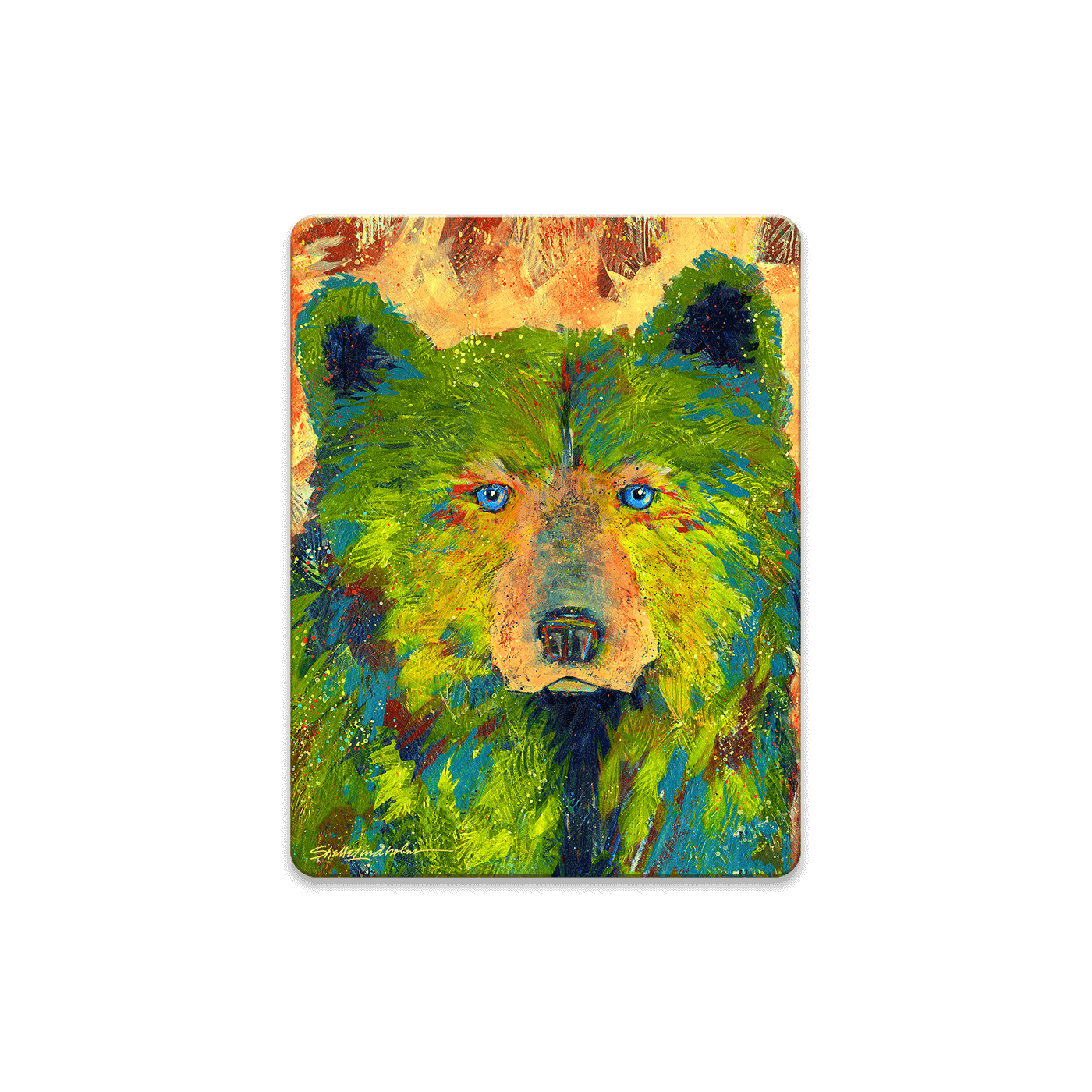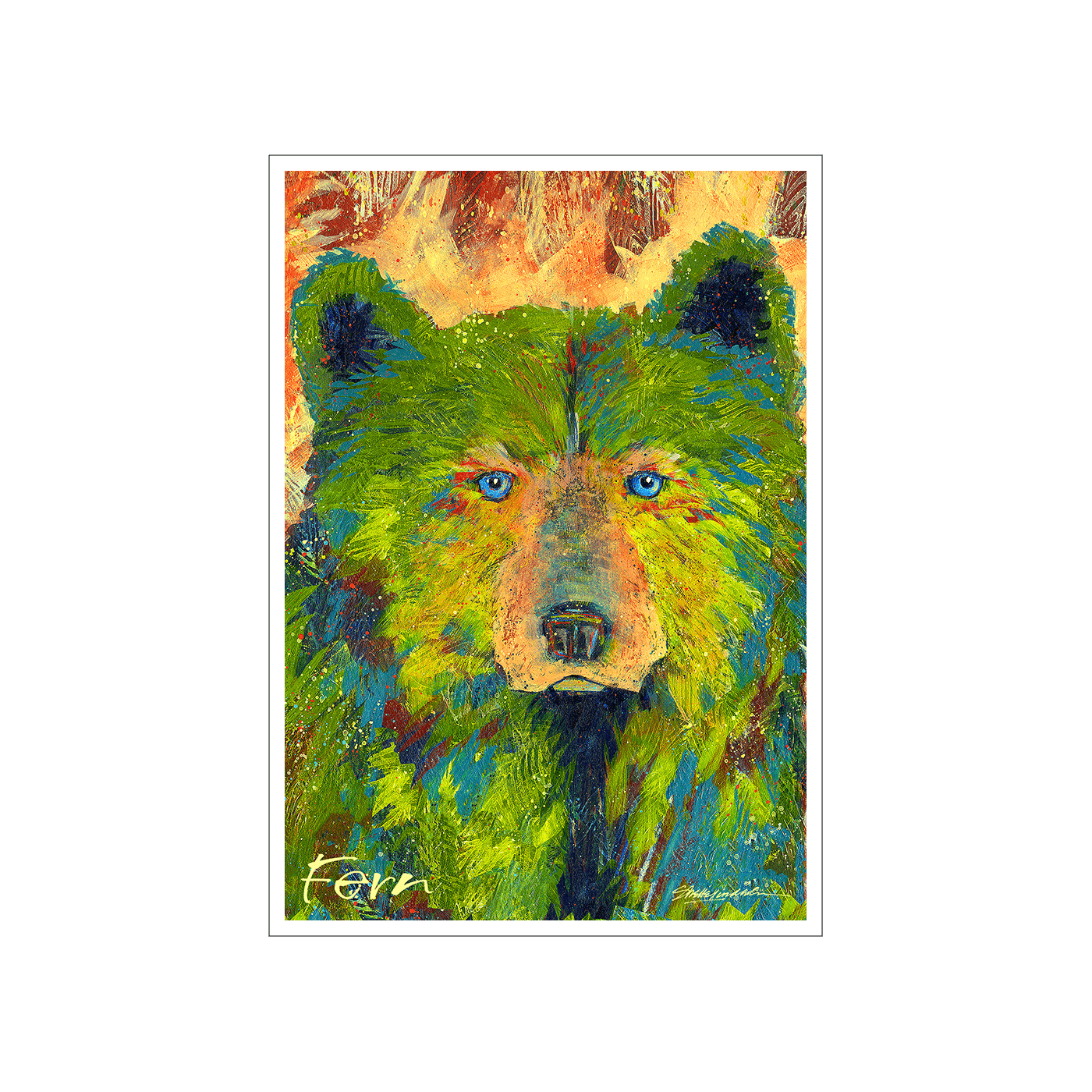 Embrace the wild with 'Fern,' a mesmerizing portrayal of a bear whose vibrant fur blooms with the lush colors of the forest. This captivating artwork is a vivid mosaic of greens, blues, and earth tones, layered with dynamic, expressive brushstrokes that evoke the dense foliage of ferns. The bear's intense blue eyes draw you into a world of natural mystery and beauty, making it a striking addition to any art collection or home decor.