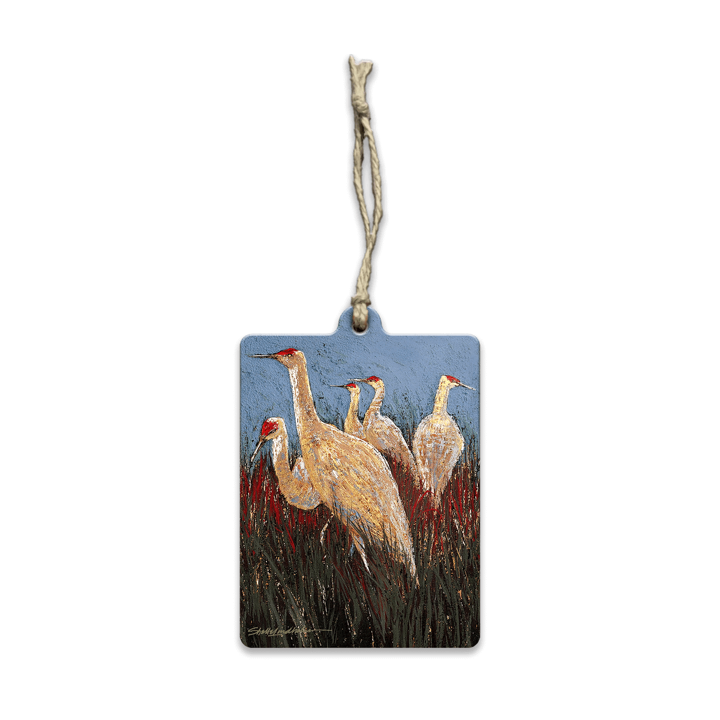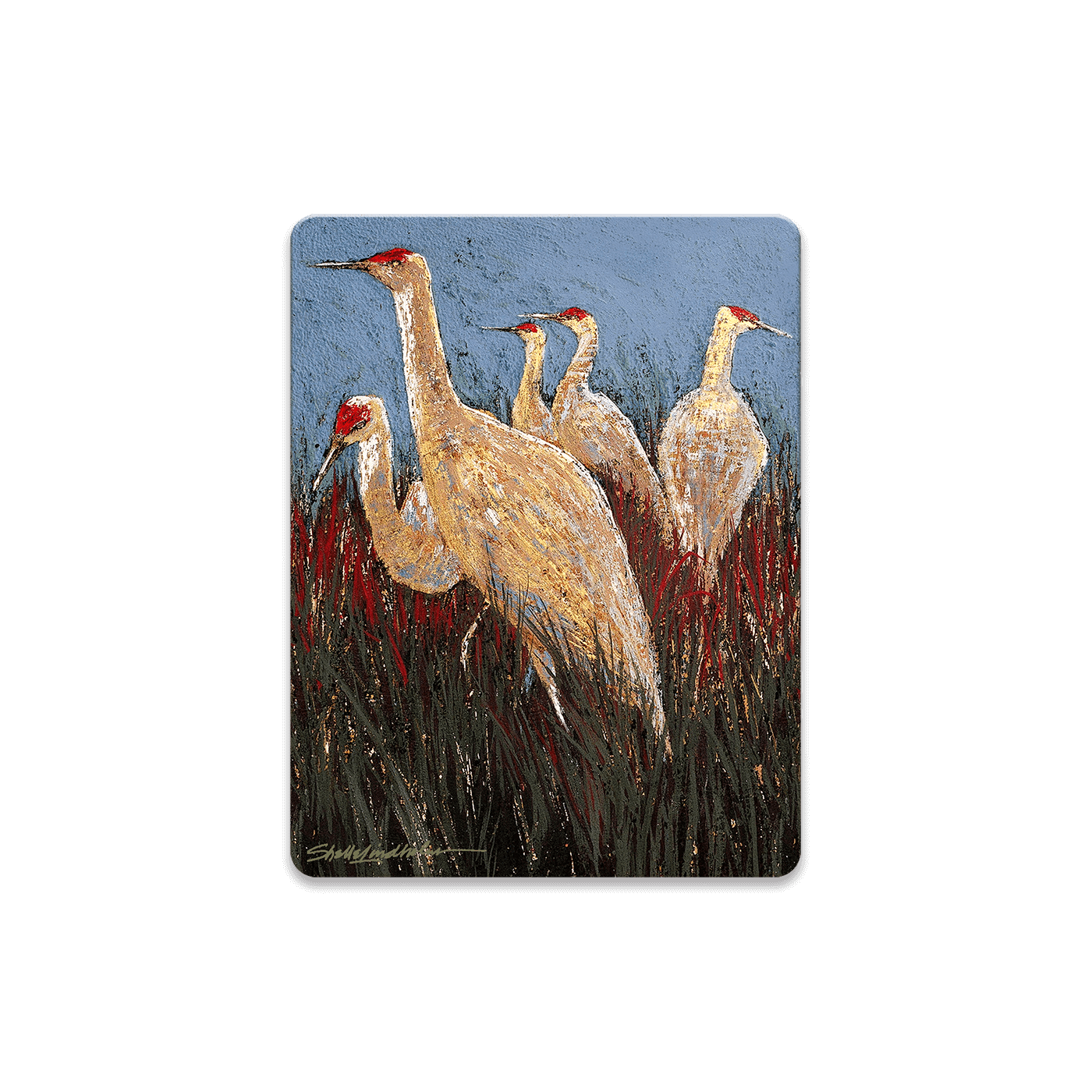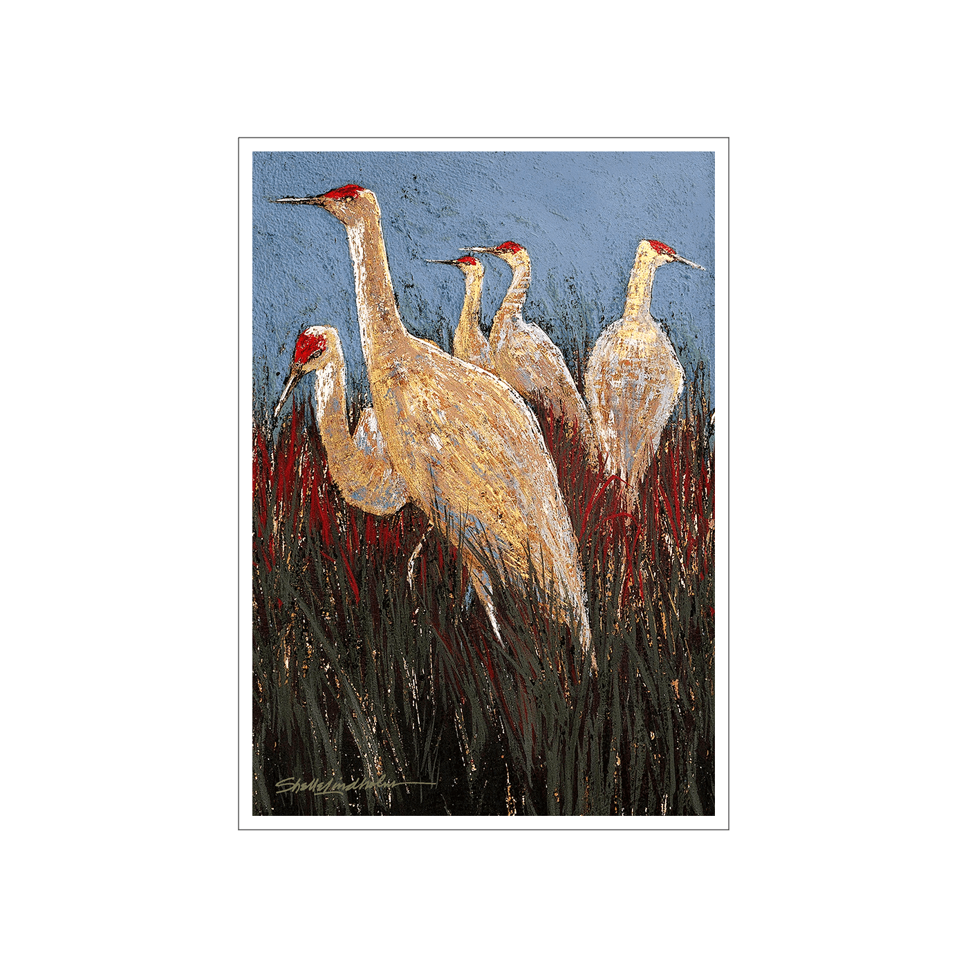 Add a touch of elegance to your decor with this graceful artwork featuring cranes amidst tall marsh grasses. The soft blue background and earthy red and gold tones create a serene yet vibrant composition that captures the beauty of nature. Perfect for creating a calming focal point, this piece brings sophistication and warmth to any space.