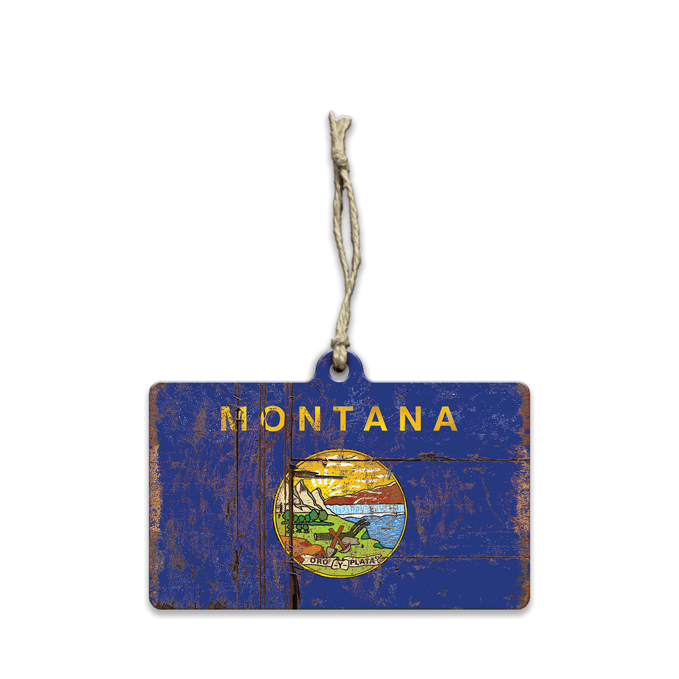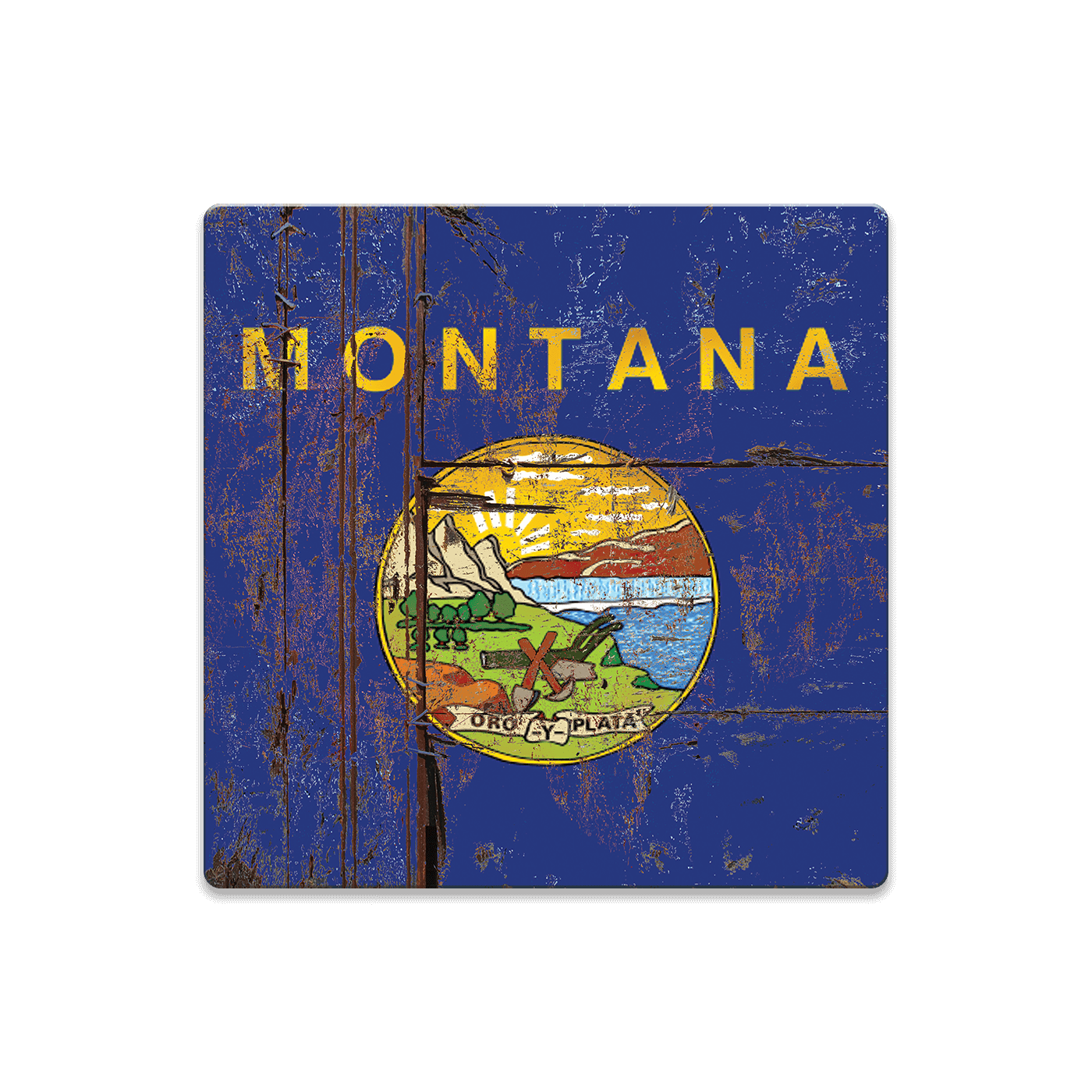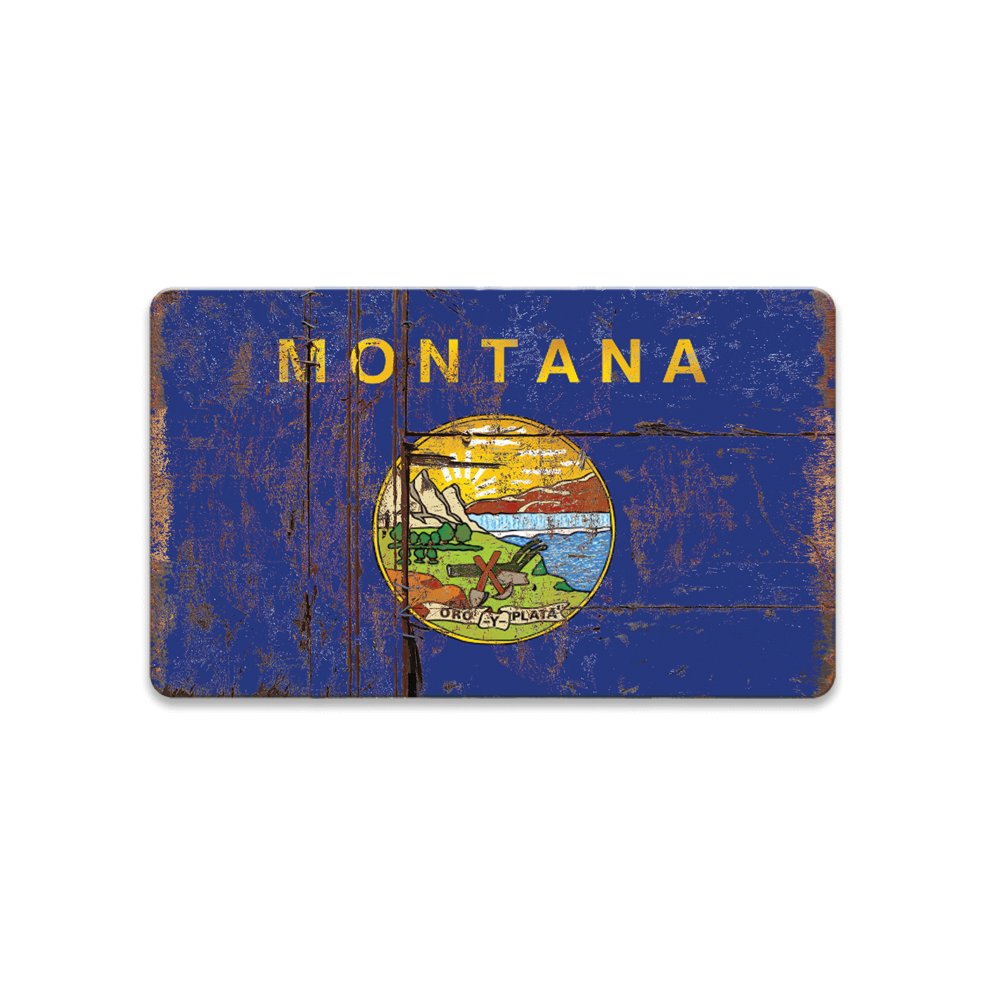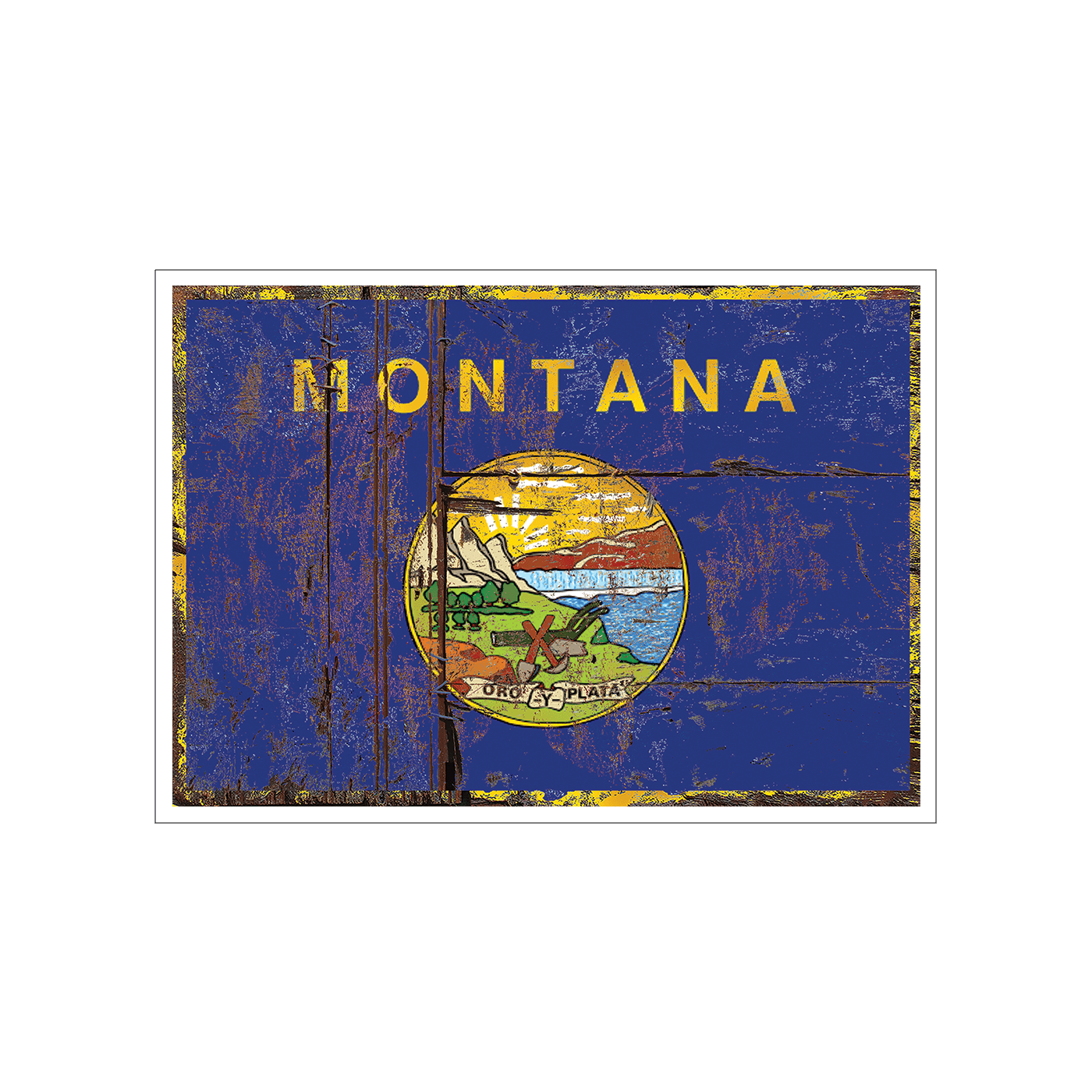 Celebrate your Montana roots with this rustic take on the Treasure State flag. Featuring a weathered, distressed finish that mimics the look of aged wood and decades of sun and wear, this artwork highlights the bold state name and the colorful Great Seal of Montana. The “Oro y Plata” banner pays homage to Montana’s gold and silver mining legacy, while the scenic emblem showcases mountains, plains, forests, and tools of the trade. A timeless tribute to Big Sky Country—perfect for cabins, bars, or anyone proud to call Montana home.