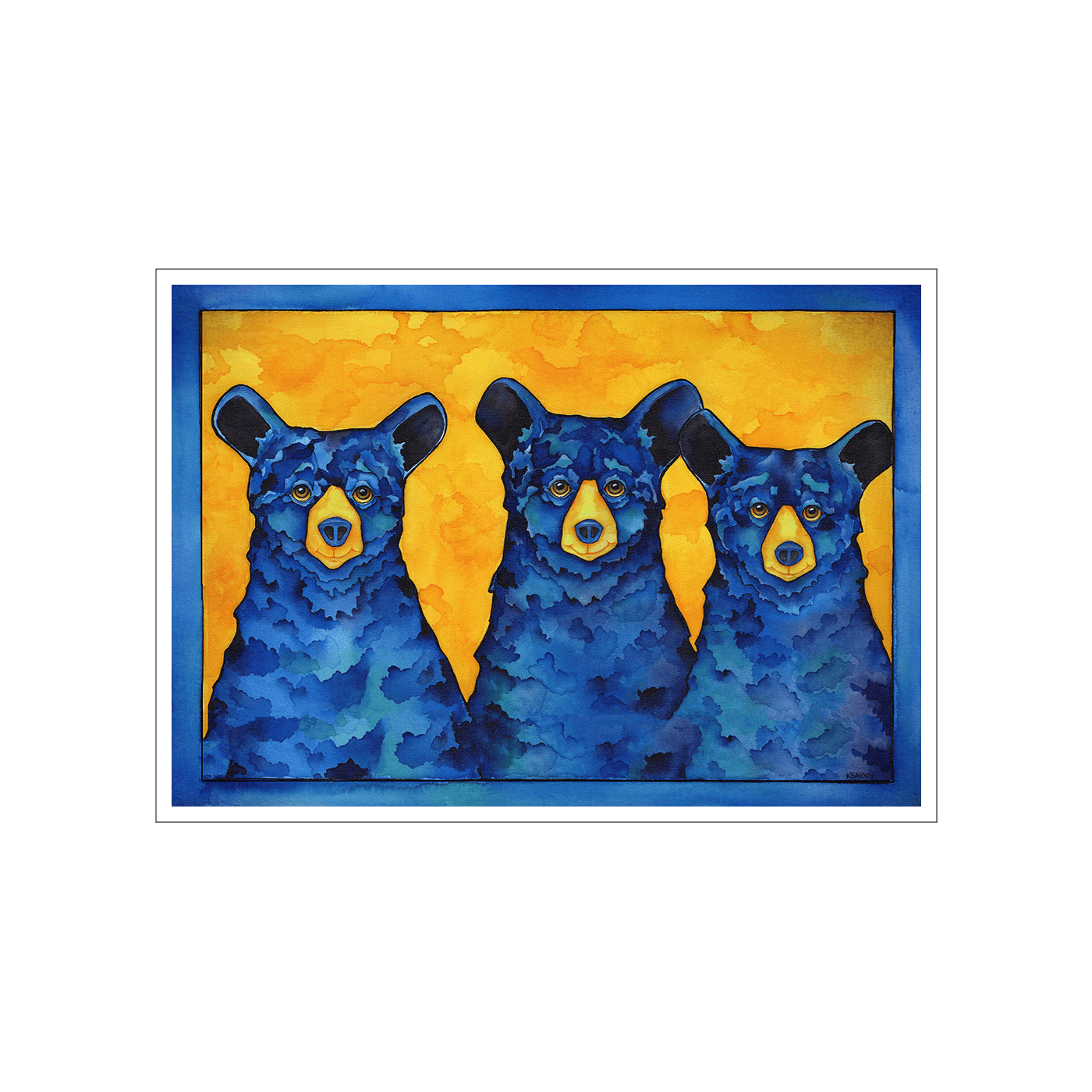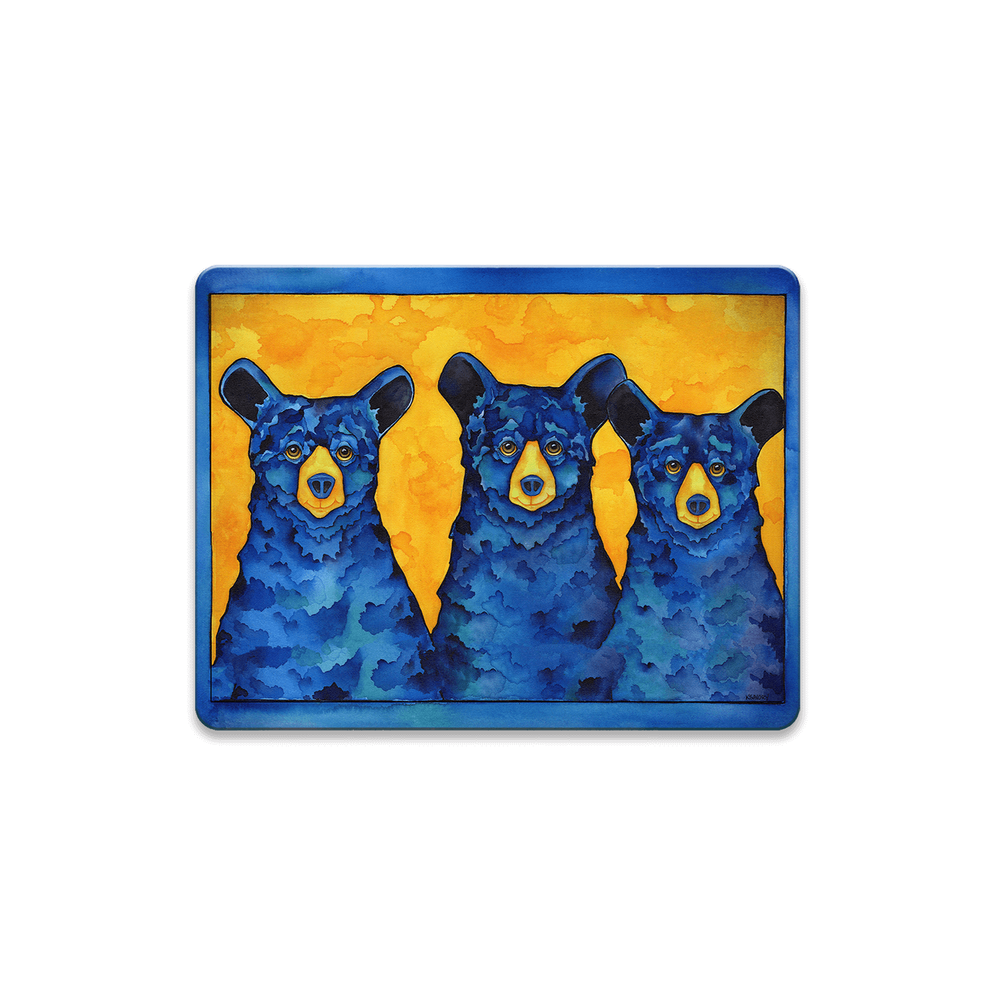 Introducing "Los Tres Hermanos," a mesmerizing artwork that features three blue bears against a vibrant yellow backdrop. The striking contrast between the deep blue of the bears and the luminous yellow background brings this piece to life, creating a dynamic and visually engaging display. Perfectly blending nature's tranquility with a modern aesthetic, this artwork is a fantastic addition to both contemporary and traditional spaces. Ideal for art lovers and wildlife enthusiasts, "Los Tres Hermanos" adds a narrative depth to any room, celebrating the bond and unity represented by the three brotherly bears.