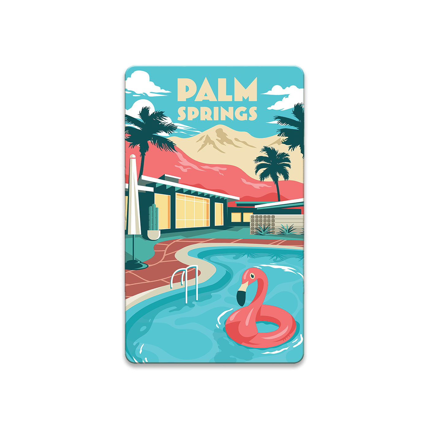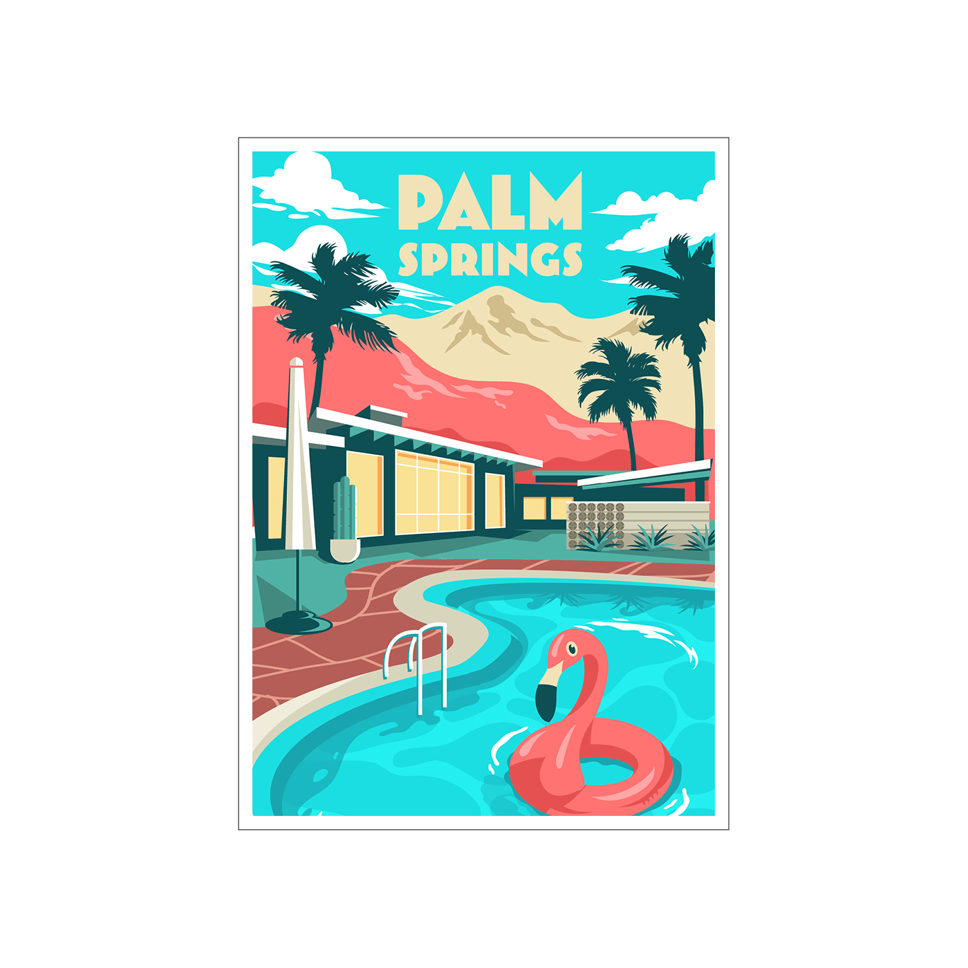 This retro-inspired artwork captures the laid-back vibe of a Palm Springs poolside retreat, complete with mid-century architecture, palm trees, and a playful flamingo float. The bold, vibrant colors and nostalgic design make it a perfect addition to any space that celebrates vintage charm or poolside living. Ideal for creating a warm, tropical atmosphere in your home, office, or outdoor space.