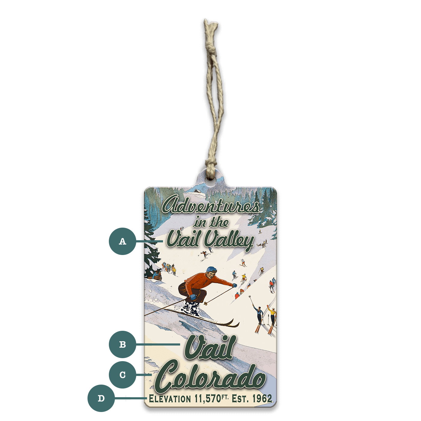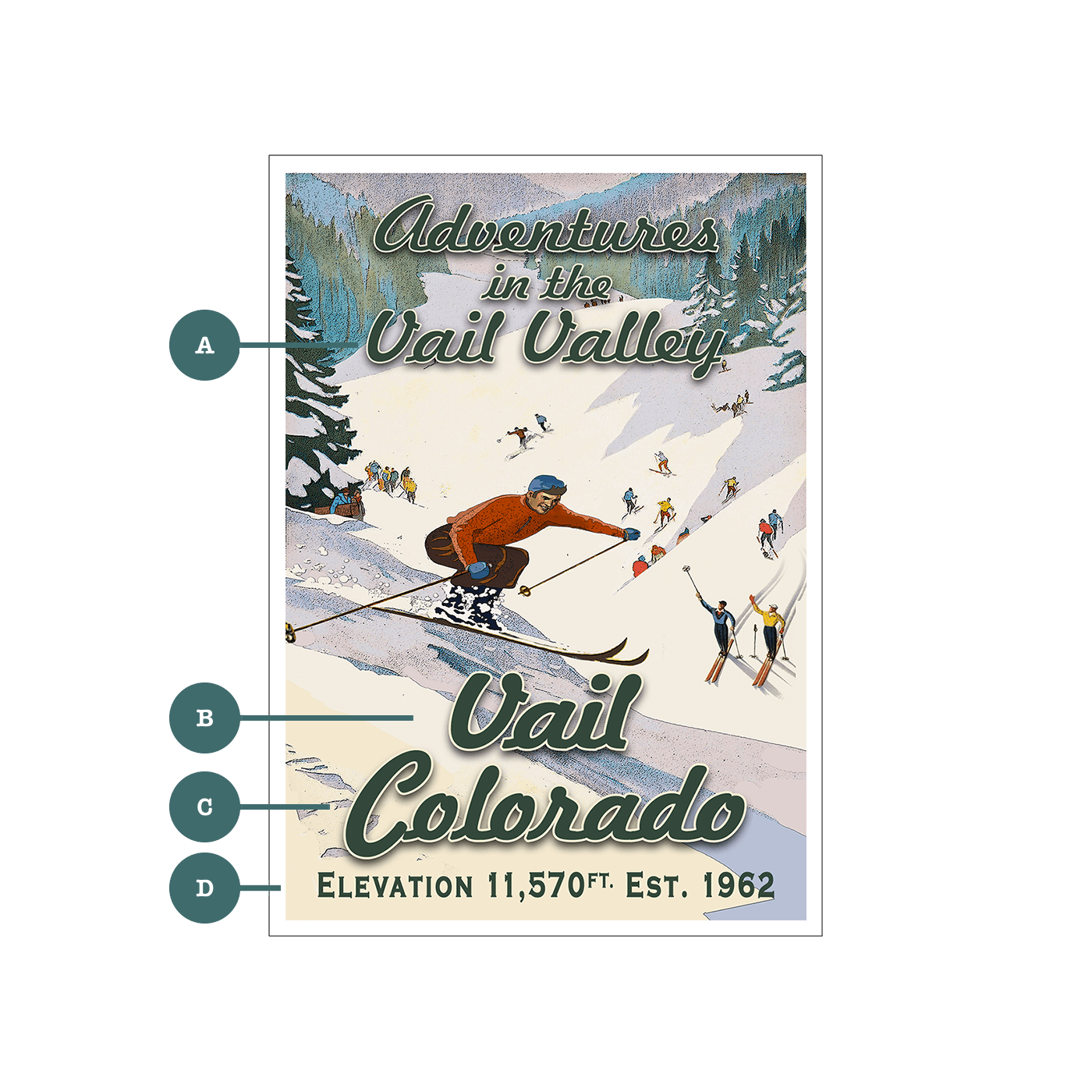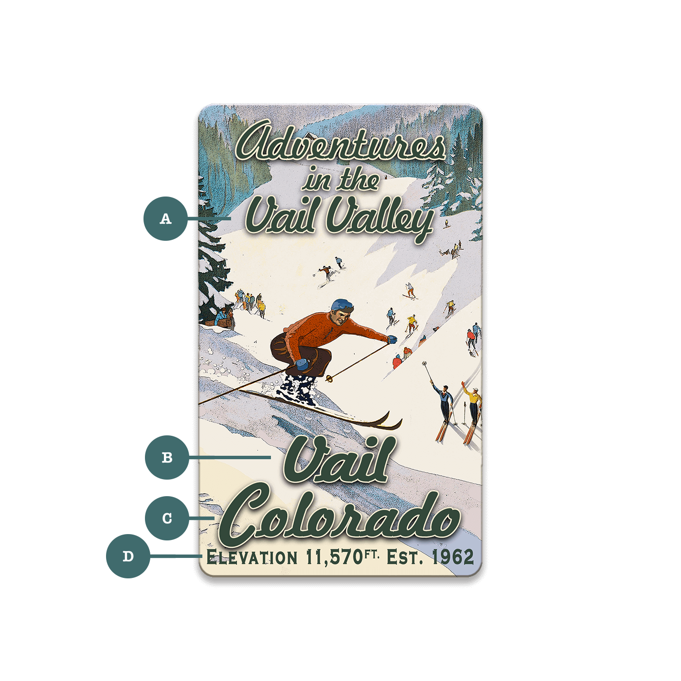 This vintage ski scene captures the excitement of a bustling ski resort, with skiers descending a snowy slope surrounded by winter scenery. The retro-inspired design features vibrant colors and classic typography, evoking the charm of mid-century skiing adventures. Personalization options allow for custom text, making this artwork a great addition to any ski lodge or mountain-themed décor.
