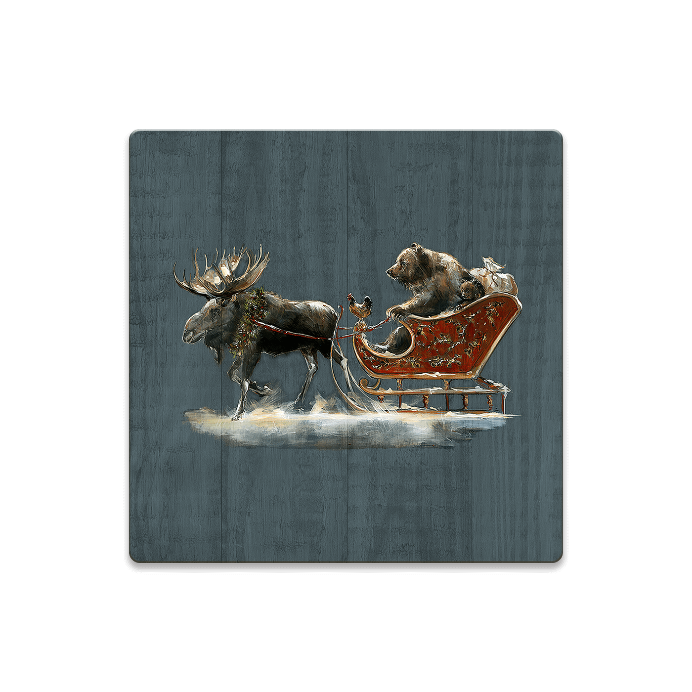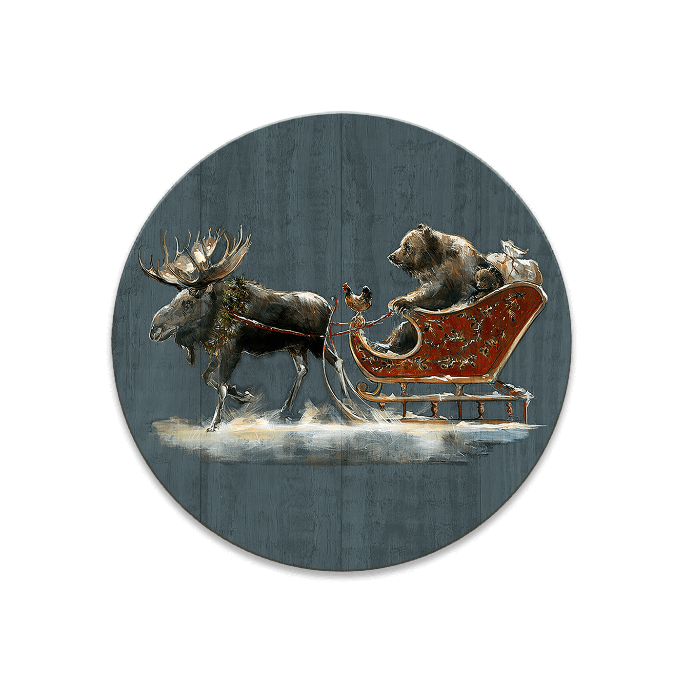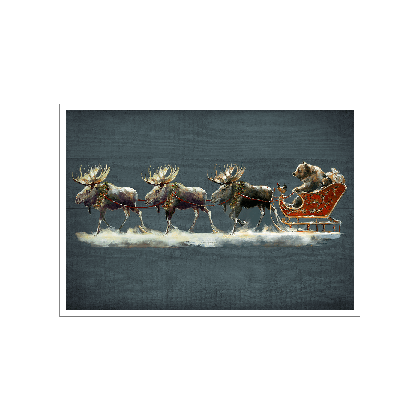 Embark on a festive journey with this whimsical Christmas artwork, perfect for infusing your space with the spirit of the holidays! This unique piece showcases a trio of majestic moose, adorned with holiday flair, pulling a vintage sleigh driven by a jolly ol' grizzly bear, creating a playful take on the classic sleigh and reindeer imagery. This artwork is an ideal choice for anyone looking to elevate their holiday home with a touch of enchantment and a dash of woodland charm.